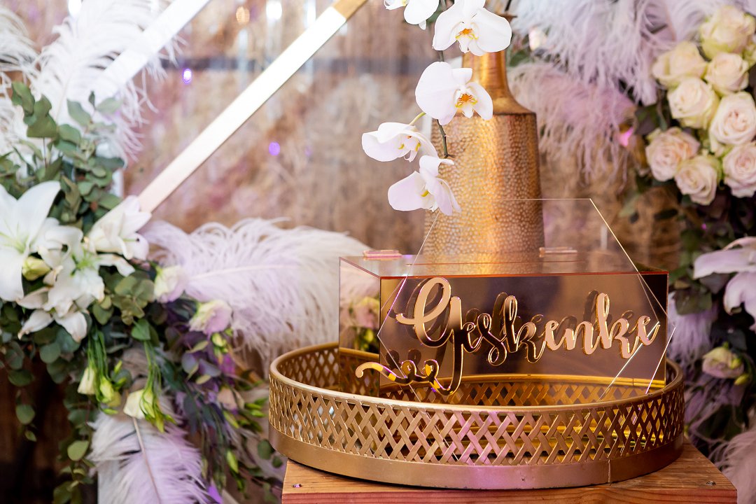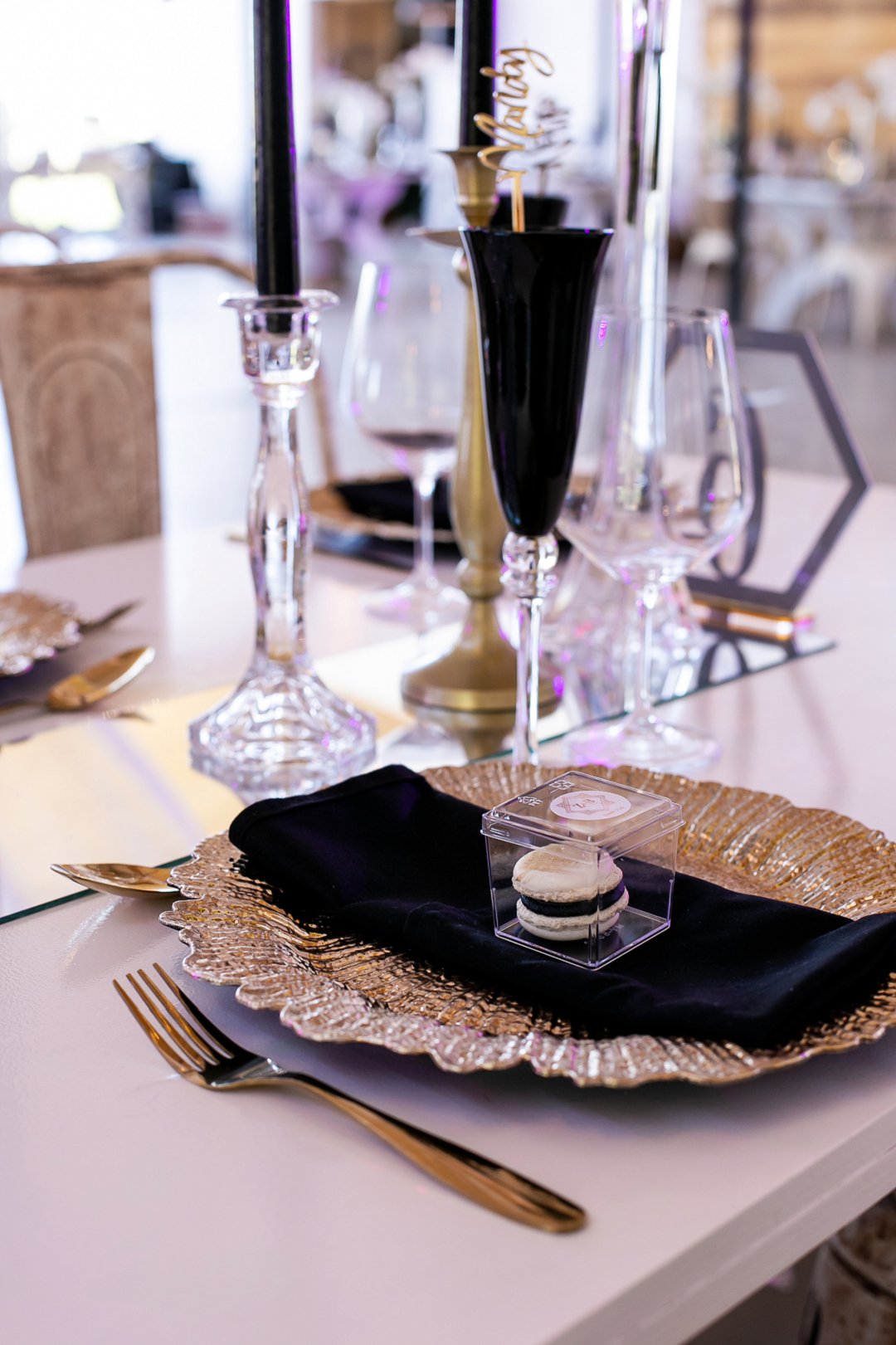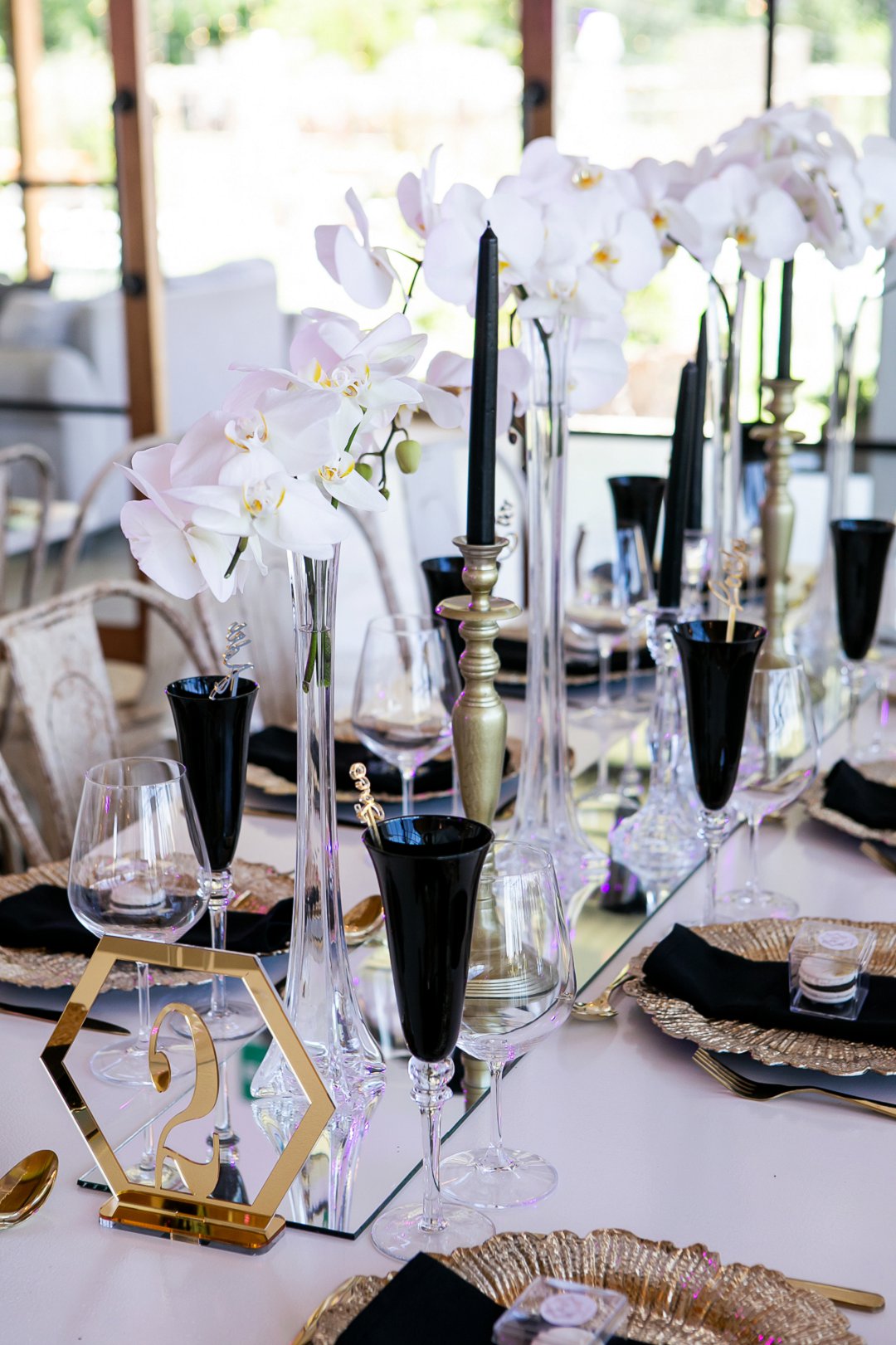 Swart en Wit elemente is waaruit die dekor bestaan het. Dit is ʼn klassieke en tydlose styl vir enige troue. Goue elemente wat jou weer terug neem na ʼn elegante troudag in die 1920’s is gebruik as fokus punte. Ons is mal oor die kombinasie van kleure. Die dun glasvase met spierwit orgideë in gee ʼn baie skoon gevoel tot die tafel dekor.