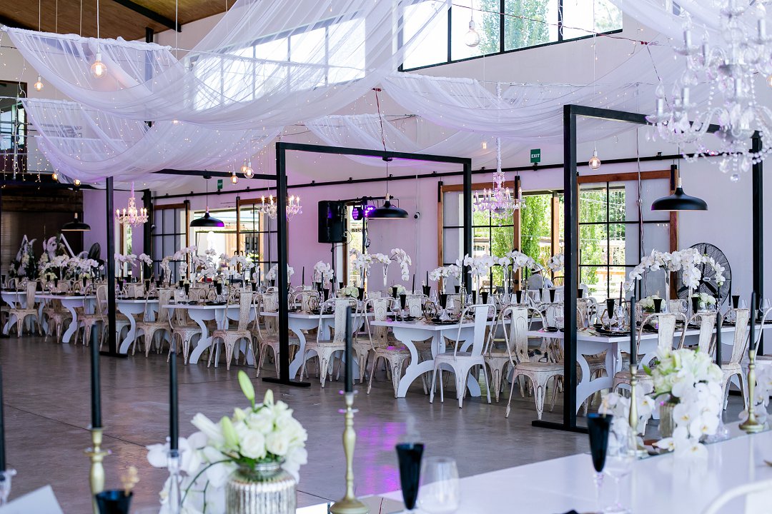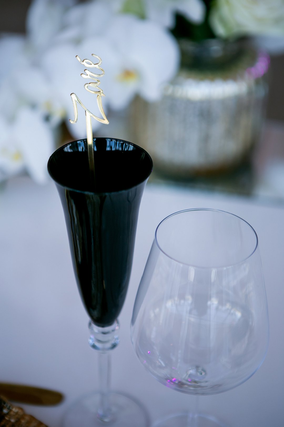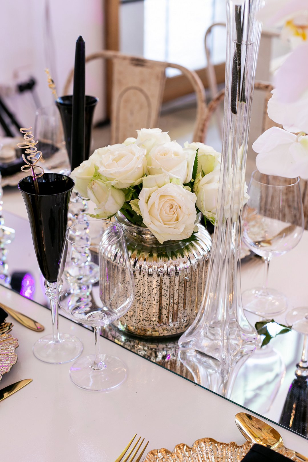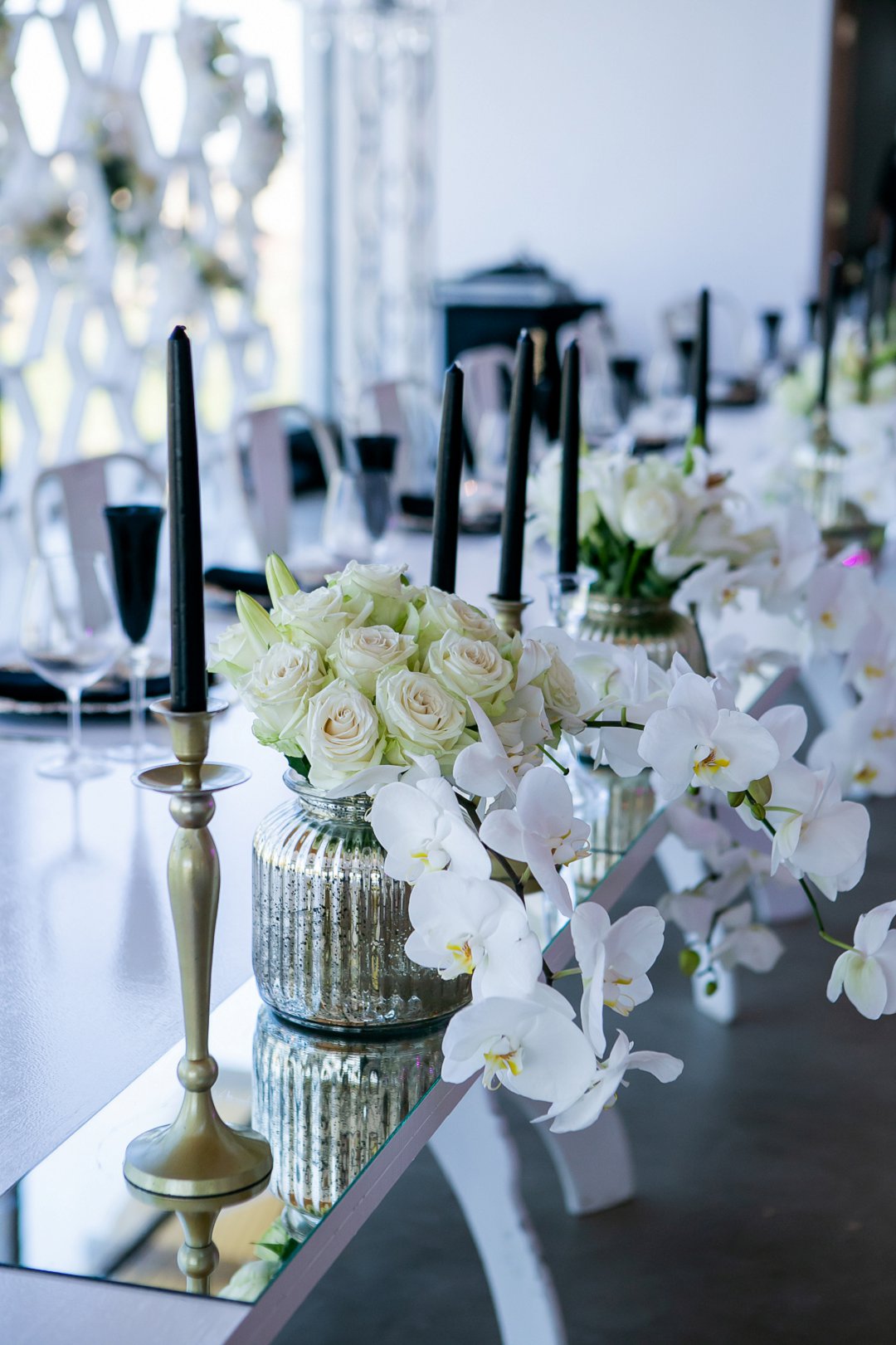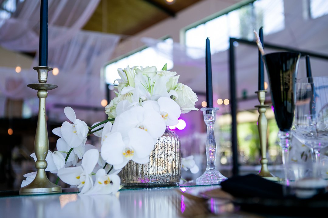 Swart en Wit elemente is waaruit die dekor bestaan het. Dit is ʼn klassieke en tydlose styl vir enige troue. Goue elemente wat jou weer terug neem na ʼn elegante troudag in die 1920’s is gebruik as fokus punte. Ons is mal oor die kombinasie van kleure. Die dun glasvase met spierwit orgideë in gee ʼn baie skoon gevoel tot die tafel dekor.