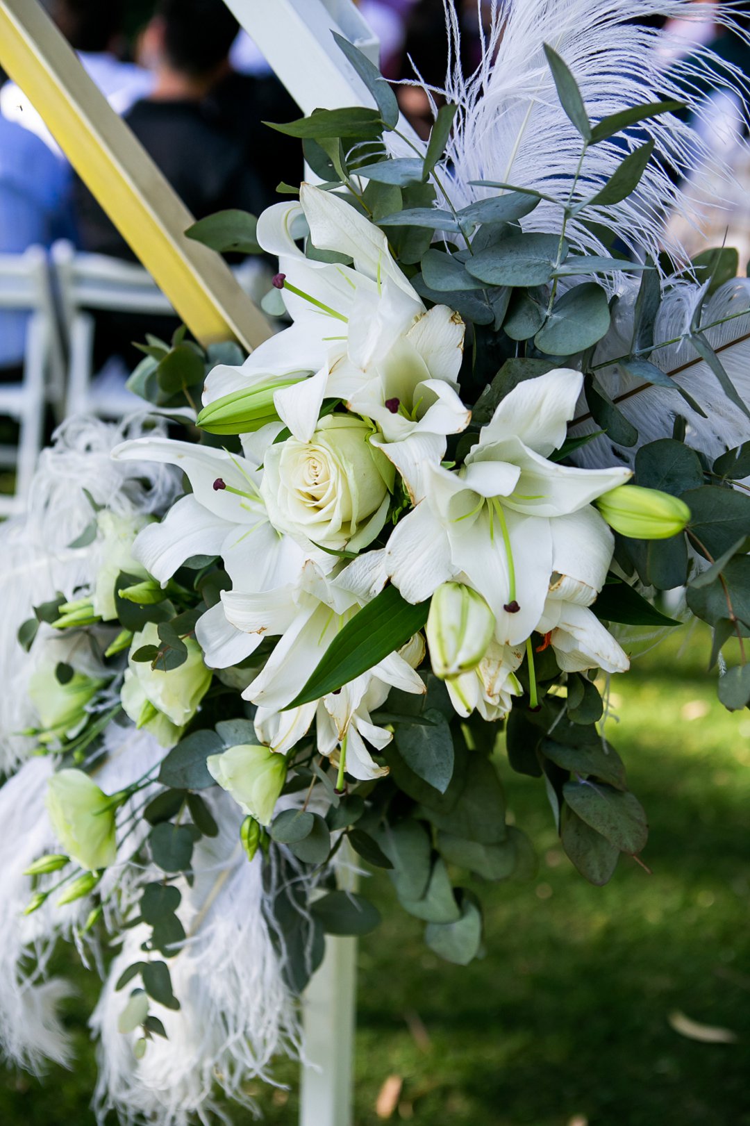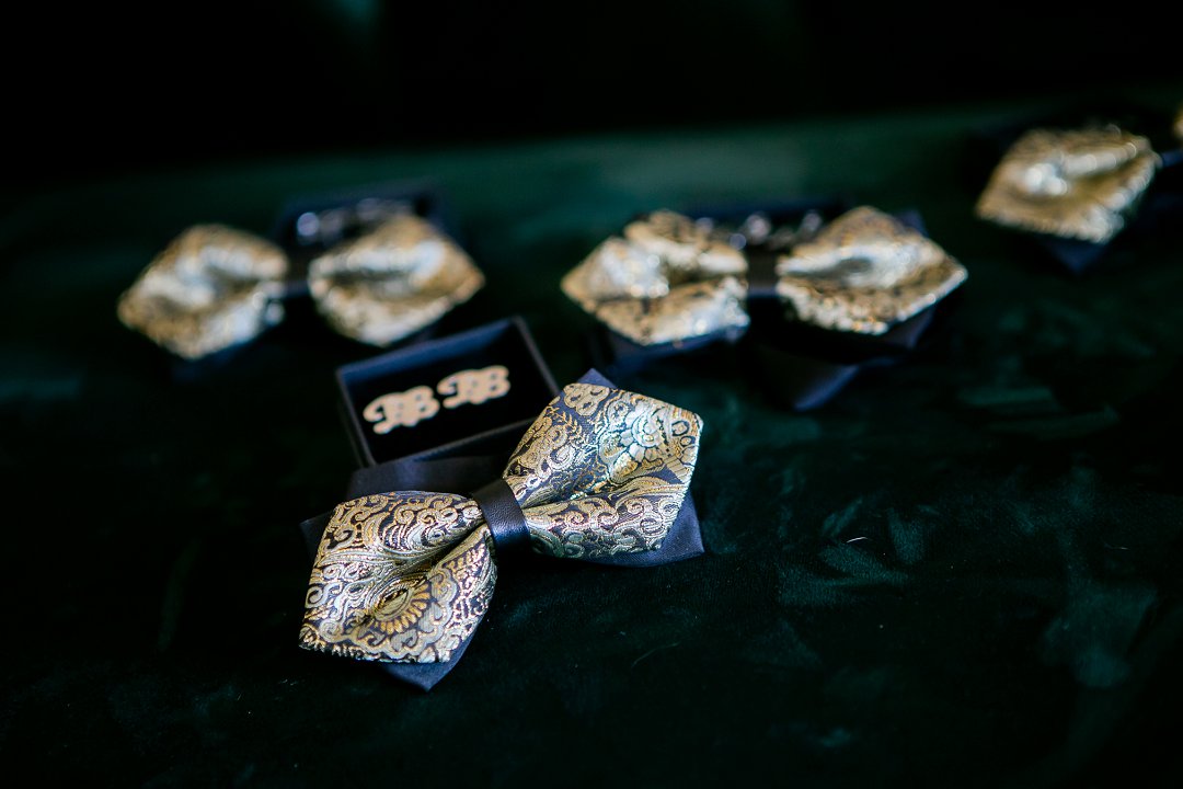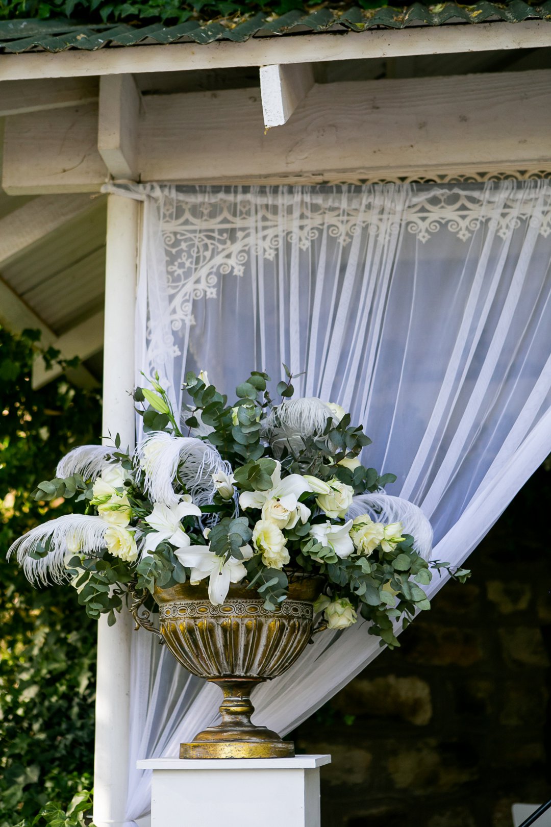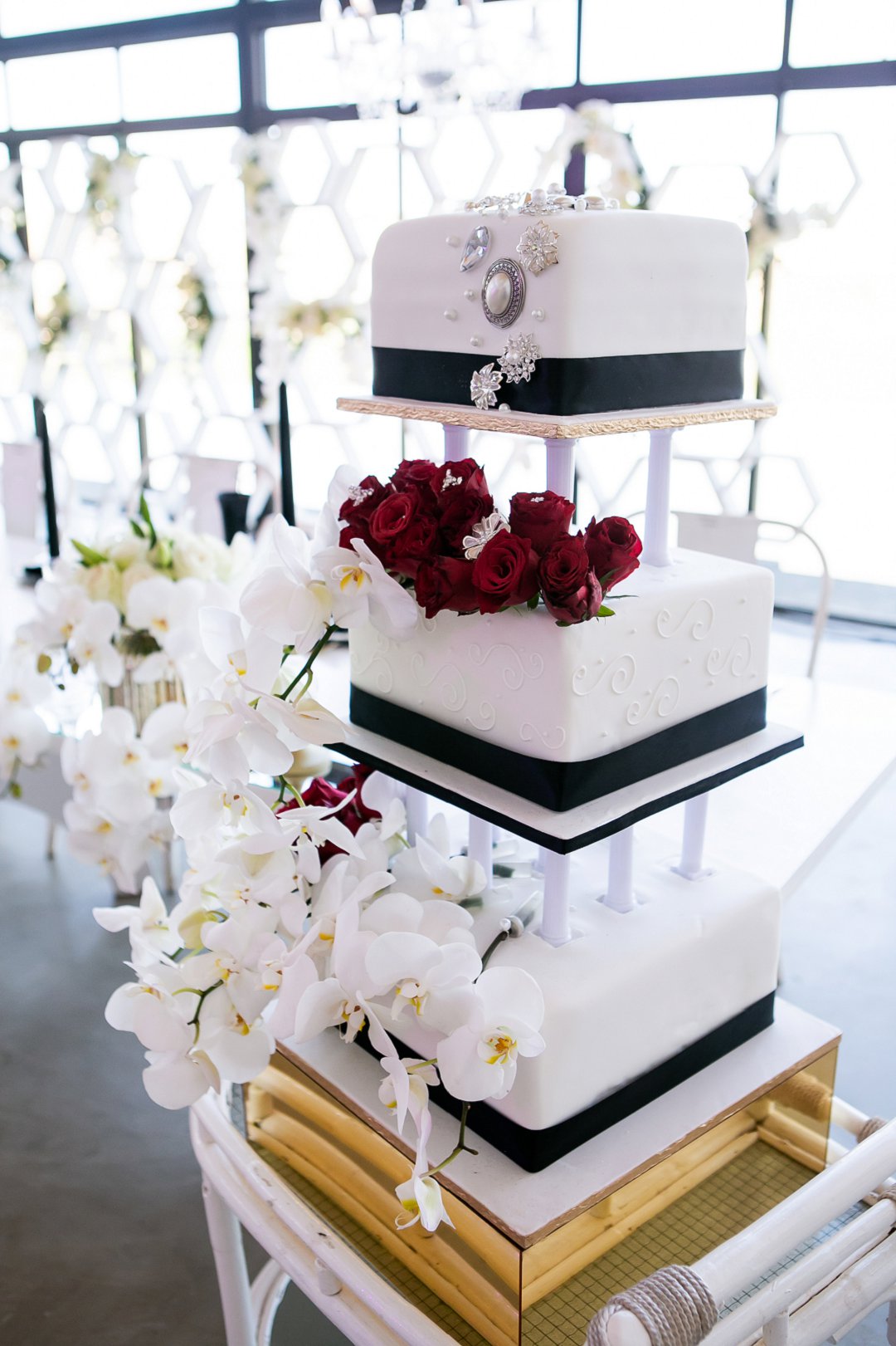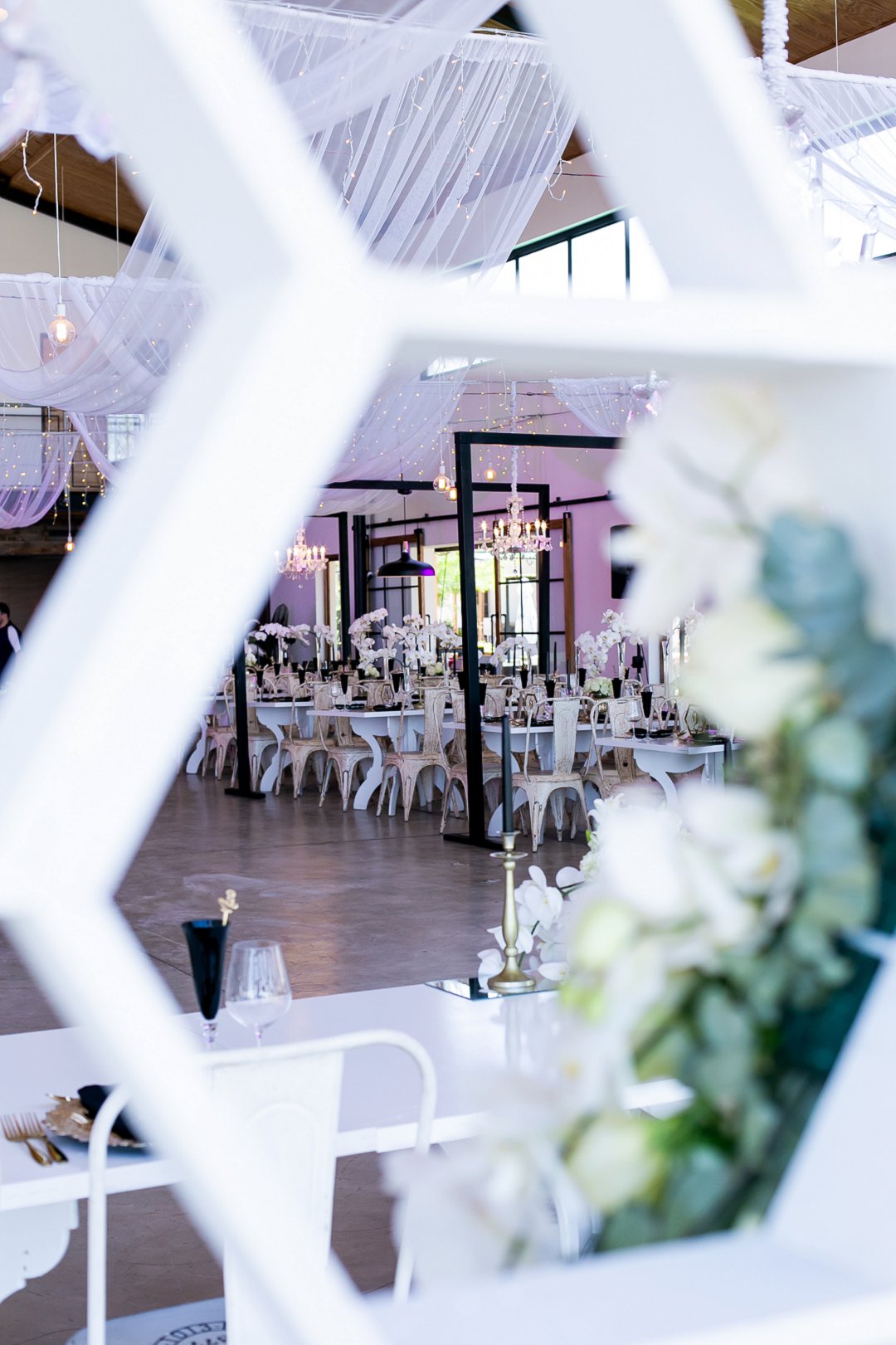 Swart en Wit elemente is waaruit die dekor bestaan het. Dit is ʼn klassieke en tydlose styl vir enige troue. Goue elemente wat jou weer terug neem na ʼn elegante troudag in die 1920’s is gebruik as fokus punte. Ons is mal oor die kombinasie van kleure. Die dun glasvase met spierwit orgideë in gee ʼn baie skoon gevoel tot die tafel dekor.