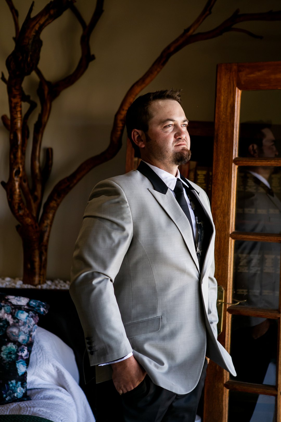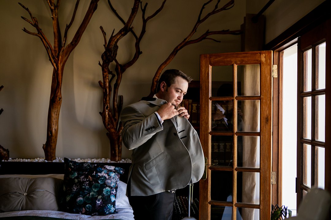 Zaré was nog altyd mal oor die 1920’s, maar tog modern. Baie detail, elegant, skitter en glans. Beukes is mal oor jag en die plaaslewe. Dus het ons probeer die 1920’s en ʼn plaastroue saam te gooi. Dus die rok (1920’s geïnspireerd – Baie kant, pêrel detail en veertjies), pak (jag geïnspireerd – Blink kamoefleer onderbaadjie en koeël manchet-knope.