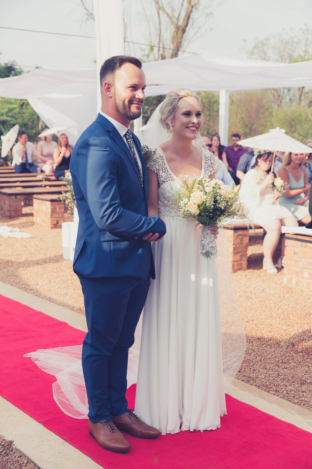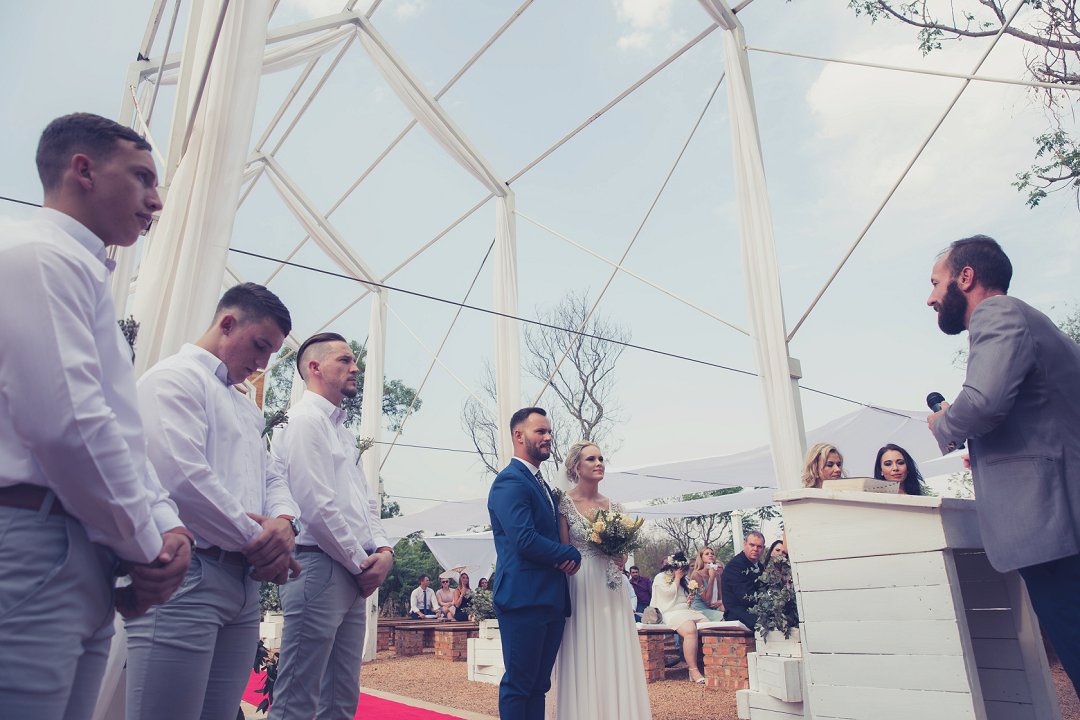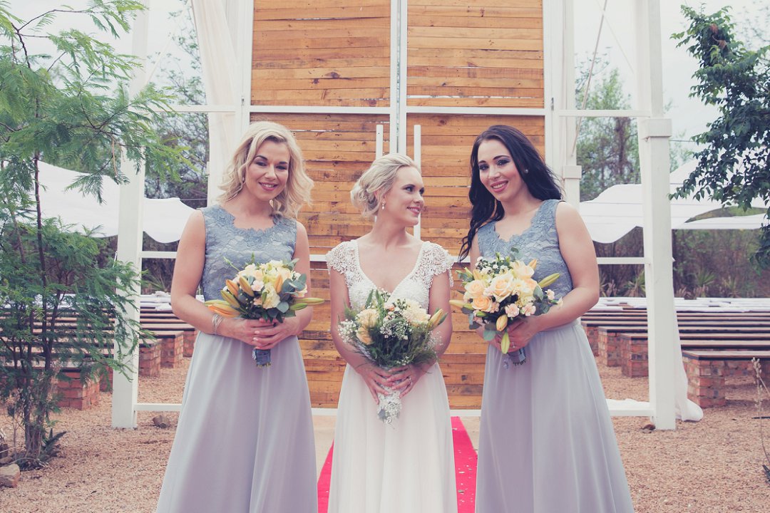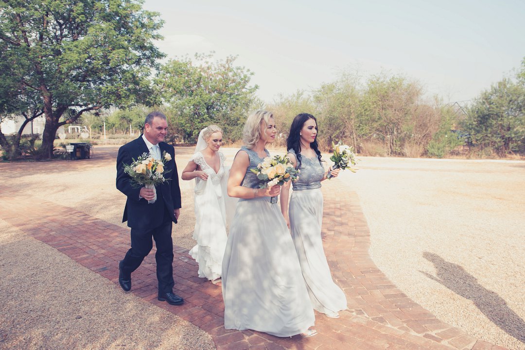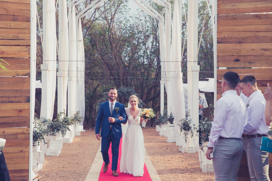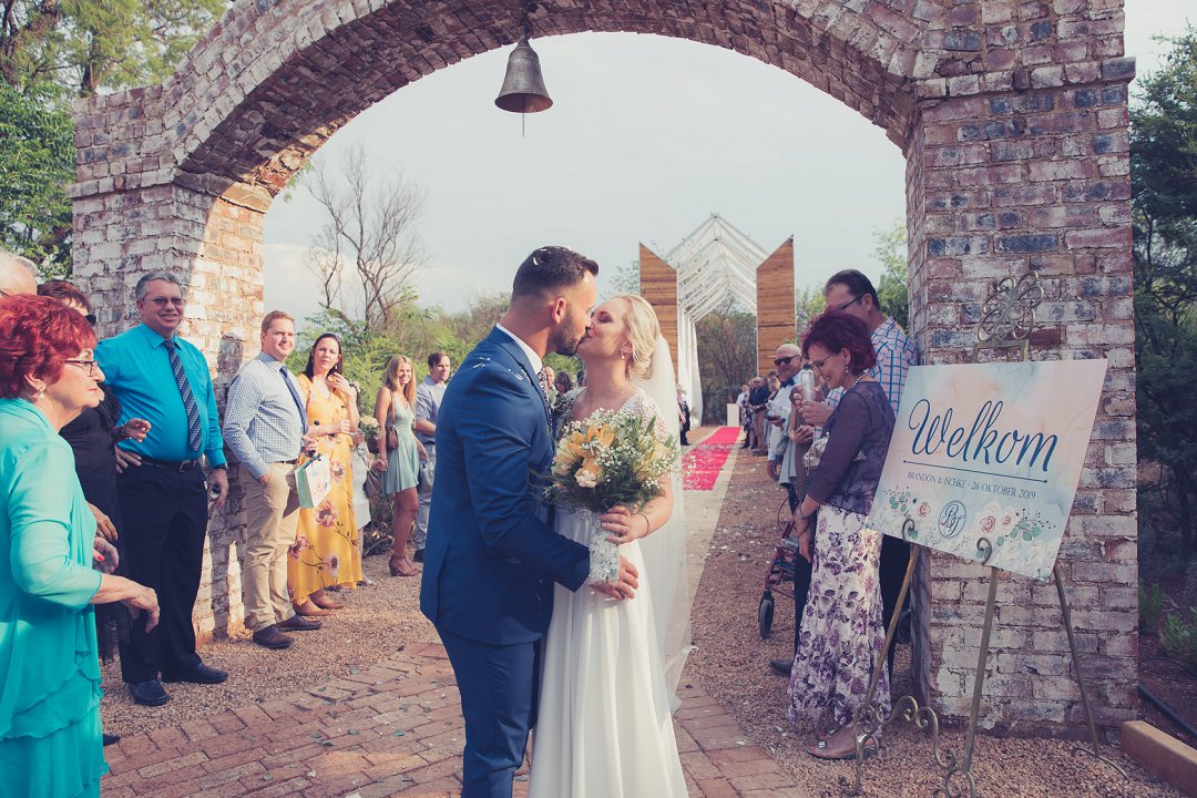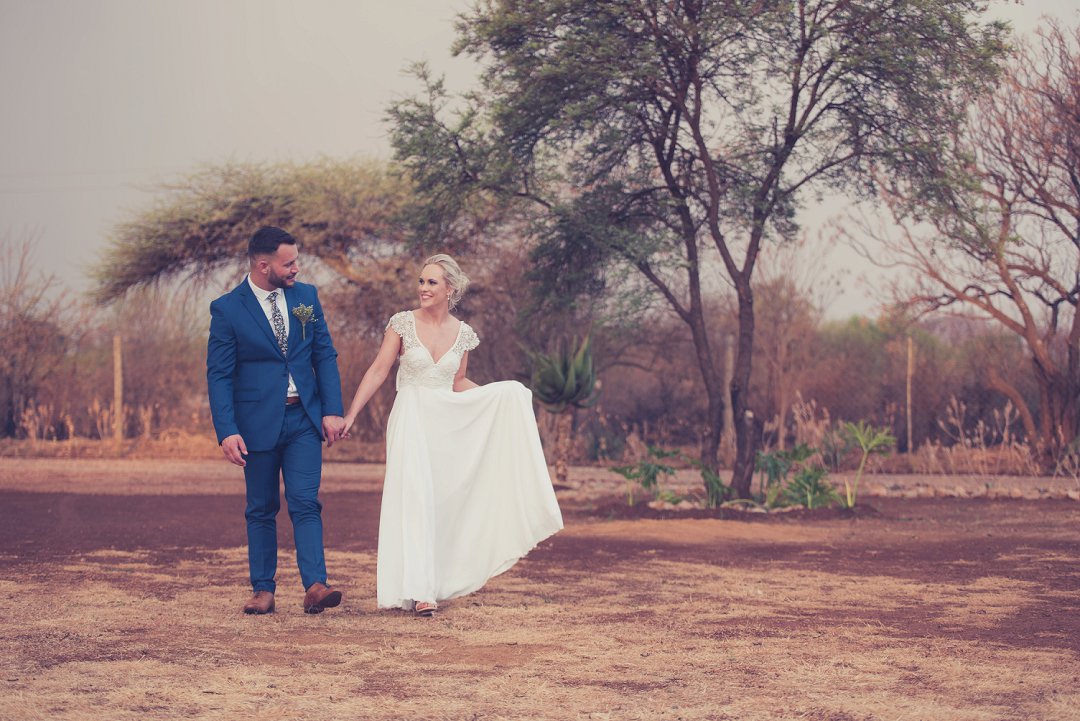 Ischke het pragtig gelyk in haar vloeiende trourok. Ons hou baie van die detail op haar trourok se skouers en hoe dit vanaf die skouers tot half van haar rug oop is. Dit is ʼn pragtige snit. Brandon het net so dapper gelyk in sy donkerblou troupak en bruin skoene. Blomme is ʼn element wat reg deur die troue gesien kan word. Van Ischke se prentjie mooi trou ruiker met die mooiste sagte geel blomme tot Brandon se blomme patroon das.