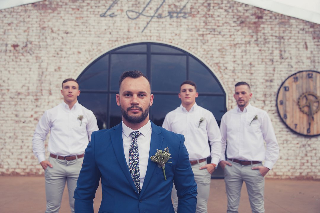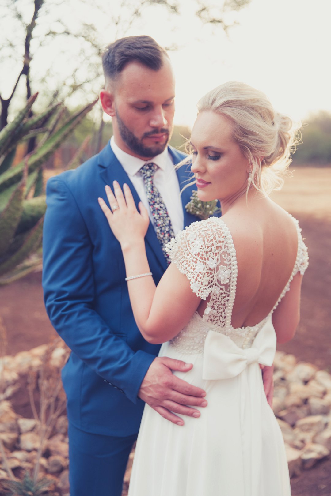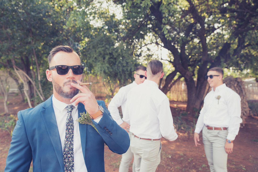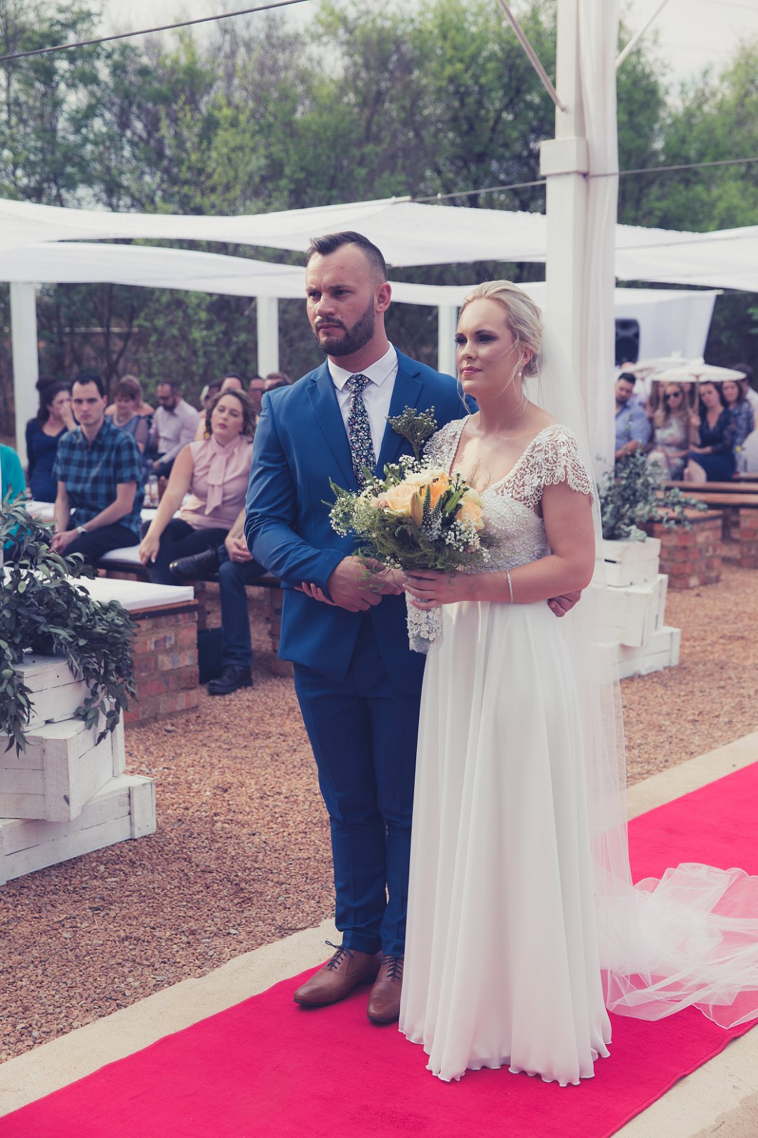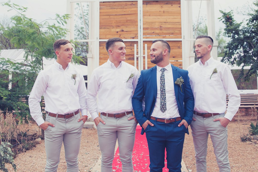 Ischke het pragtig gelyk in haar vloeiende trourok. Ons hou baie van die detail op haar trourok se skouers en hoe dit vanaf die skouers tot half van haar rug oop is. Dit is ʼn pragtige snit. Brandon het net so dapper gelyk in sy donkerblou troupak en bruin skoene. Blomme is ʼn element wat reg deur die troue gesien kan word. Van Ischke se prentjie mooi trou ruiker met die mooiste sagte geel blomme tot Brandon se blomme patroon das.