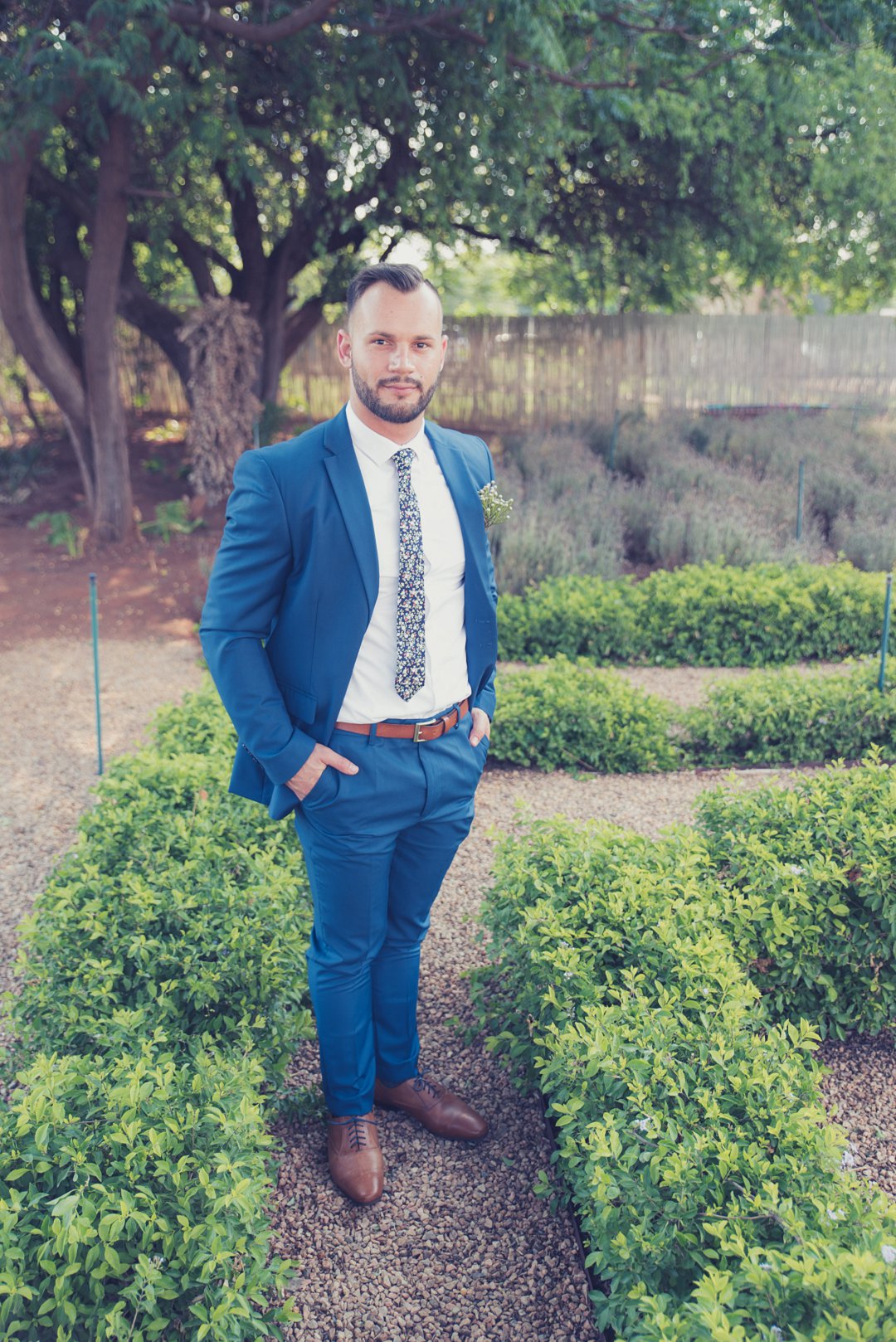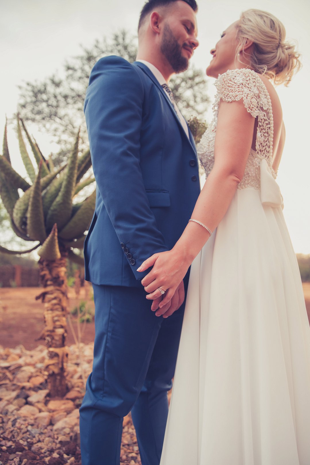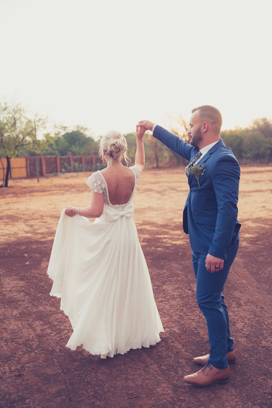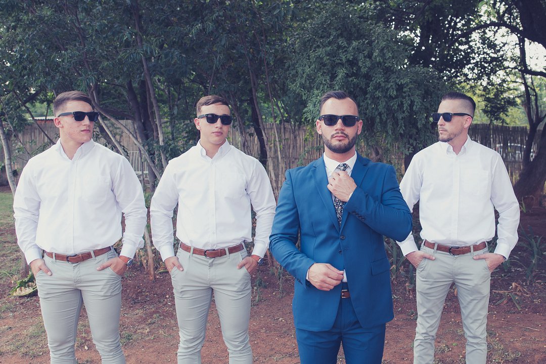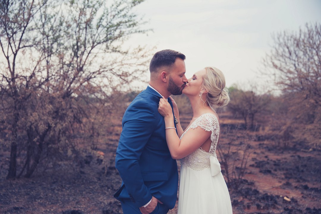 Ischke het pragtig gelyk in haar vloeiende trourok. Ons hou baie van die detail op haar trourok se skouers en hoe dit vanaf die skouers tot half van haar rug oop is. Dit is ʼn pragtige snit. Brandon het net so dapper gelyk in sy donkerblou troupak en bruin skoene. Blomme is ʼn element wat reg deur die troue gesien kan word. Van Ischke se prentjie mooi trou ruiker met die mooiste sagte geel blomme tot Brandon se blomme patroon das.