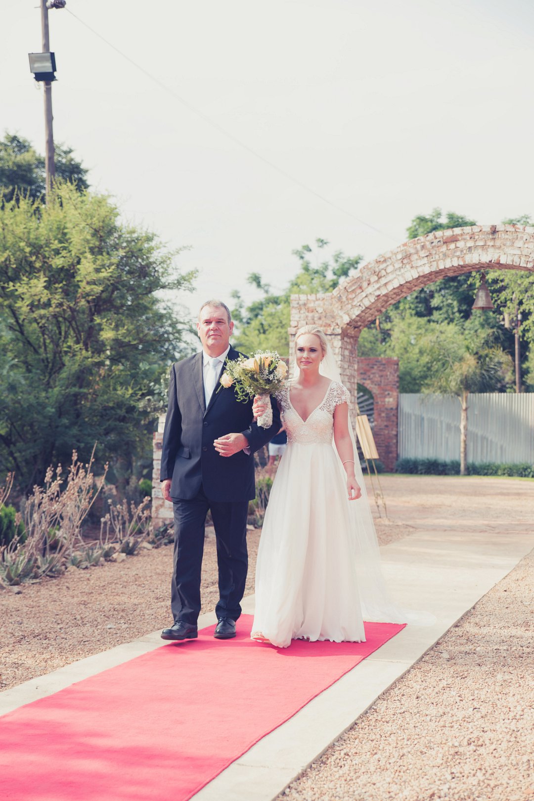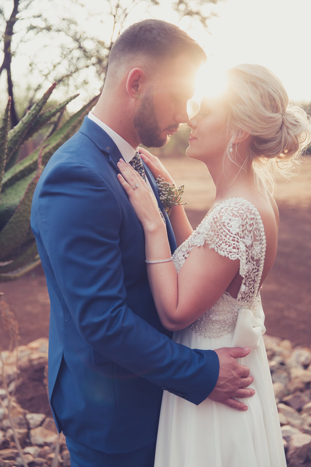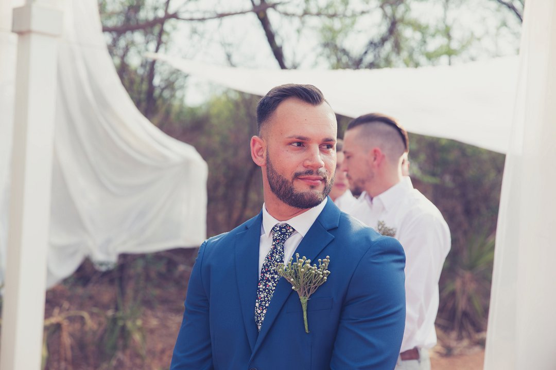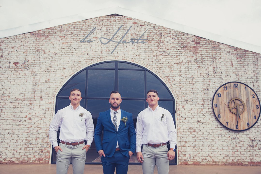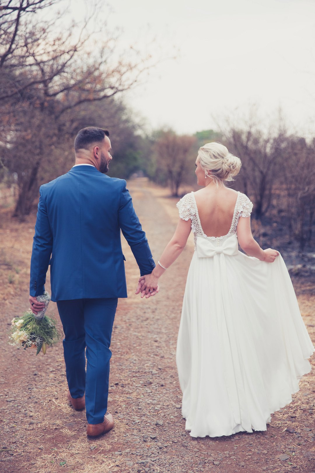 Ischke het pragtig gelyk in haar vloeiende trourok. Ons hou baie van die detail op haar trourok se skouers en hoe dit vanaf die skouers tot half van haar rug oop is. Dit is ʼn pragtige snit. Brandon het net so dapper gelyk in sy donkerblou troupak en bruin skoene. Blomme is ʼn element wat reg deur die troue gesien kan word. Van Ischke se prentjie mooi trou ruiker met die mooiste sagte geel blomme tot Brandon se blomme patroon das.