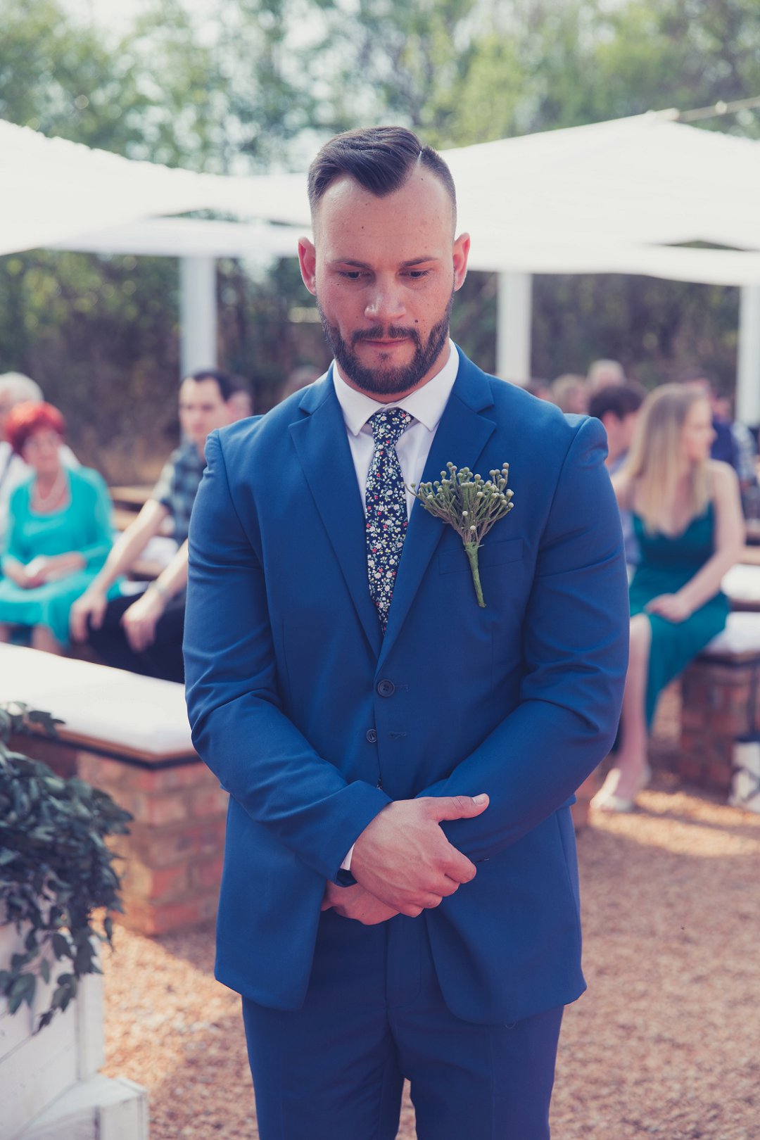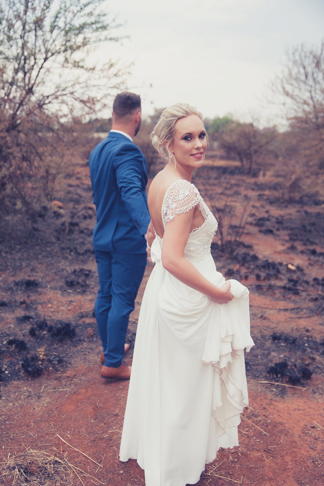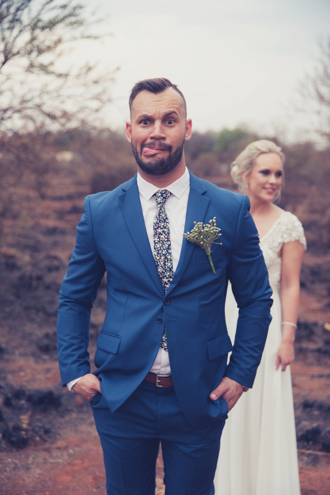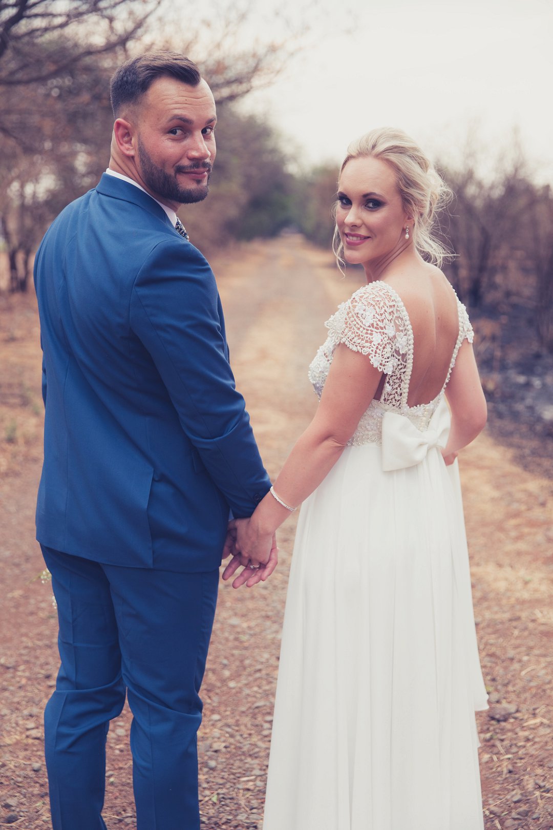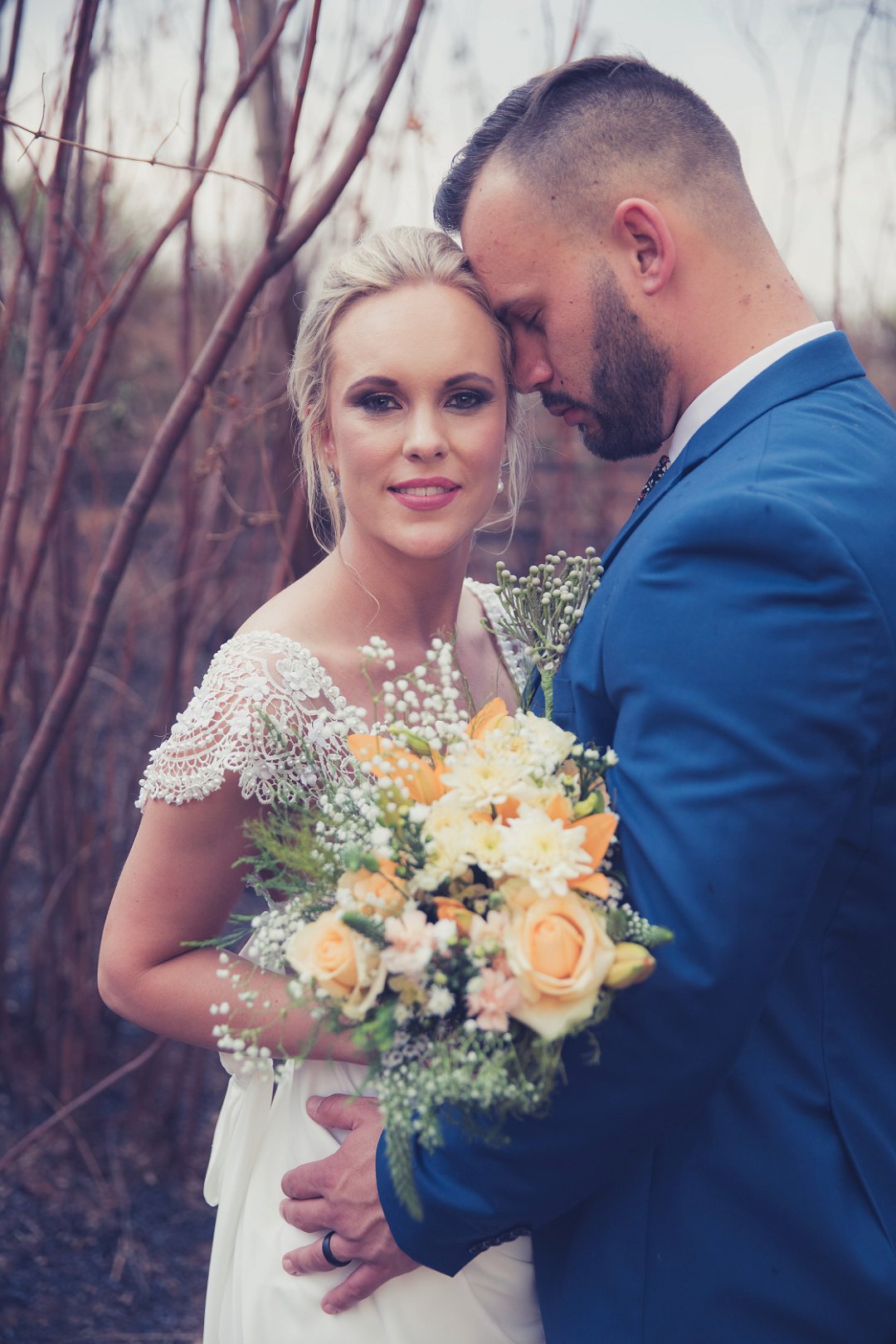 Ischke het pragtig gelyk in haar vloeiende trourok. Ons hou baie van die detail op haar trourok se skouers en hoe dit vanaf die skouers tot half van haar rug oop is. Dit is ʼn pragtige snit. Brandon het net so dapper gelyk in sy donkerblou troupak en bruin skoene. Blomme is ʼn element wat reg deur die troue gesien kan word. Van Ischke se prentjie mooi trou ruiker met die mooiste sagte geel blomme tot Brandon se blomme patroon das.