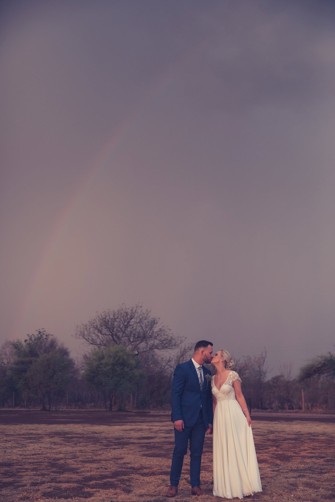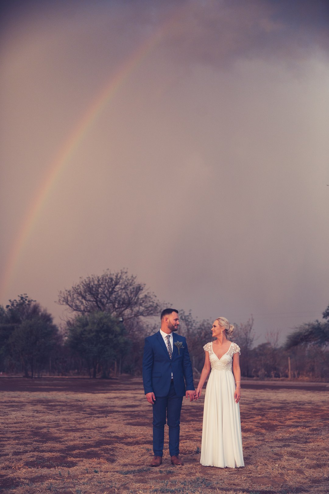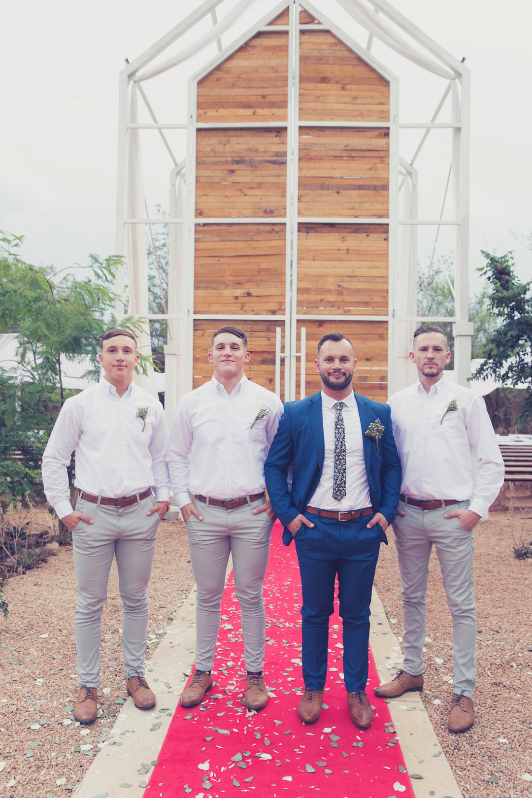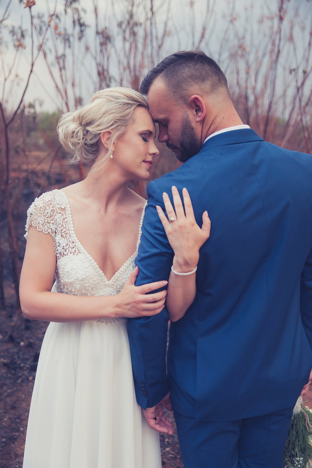 Ischke het pragtig gelyk in haar vloeiende trourok. Ons hou baie van die detail op haar trourok se skouers en hoe dit vanaf die skouers tot half van haar rug oop is. Dit is ʼn pragtige snit. Brandon het net so dapper gelyk in sy donkerblou troupak en bruin skoene. Blomme is ʼn element wat reg deur die troue gesien kan word. Van Ischke se prentjie mooi trou ruiker met die mooiste sagte geel blomme tot Brandon se blomme patroon das.