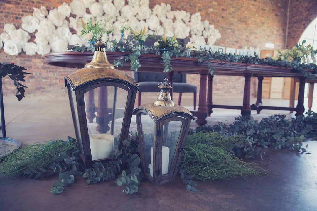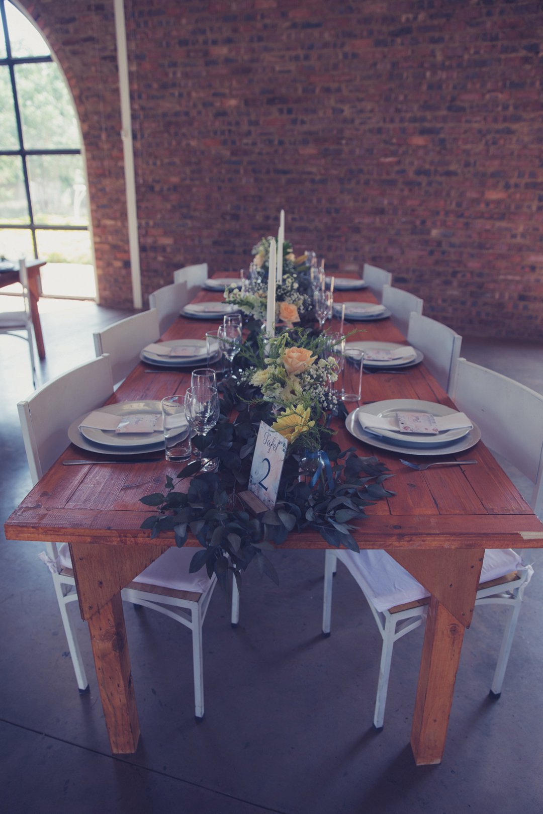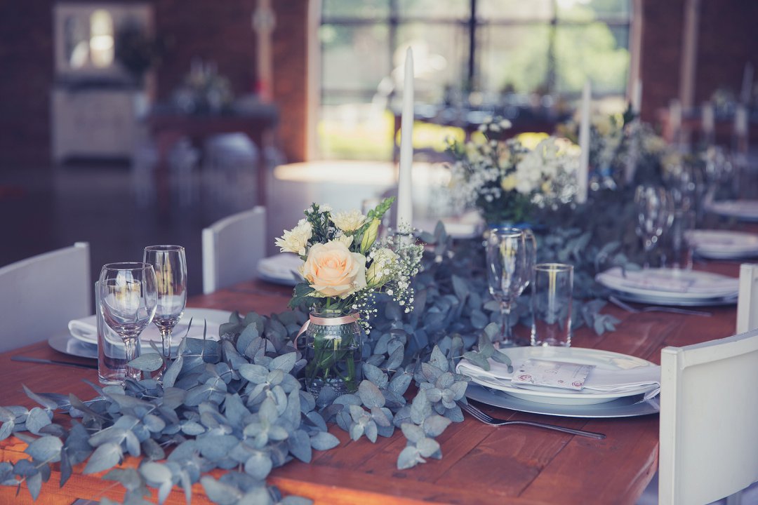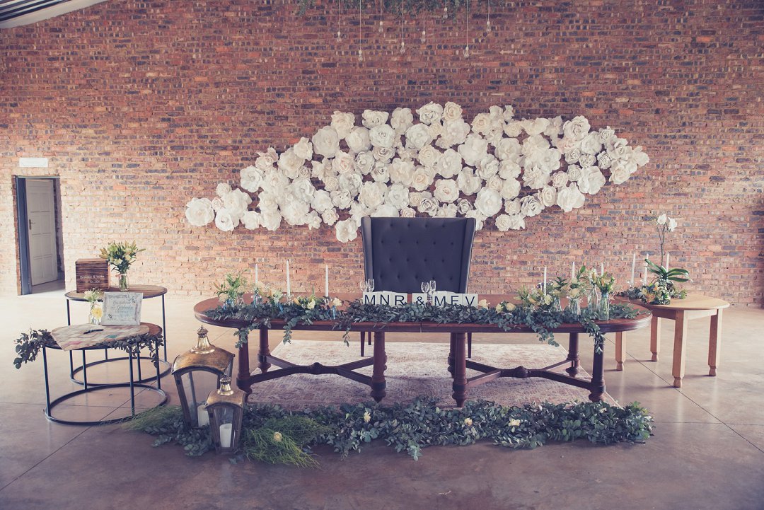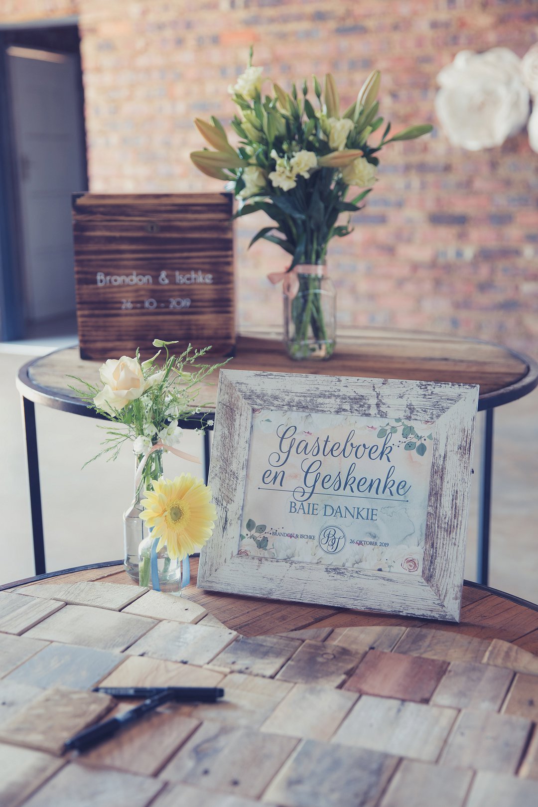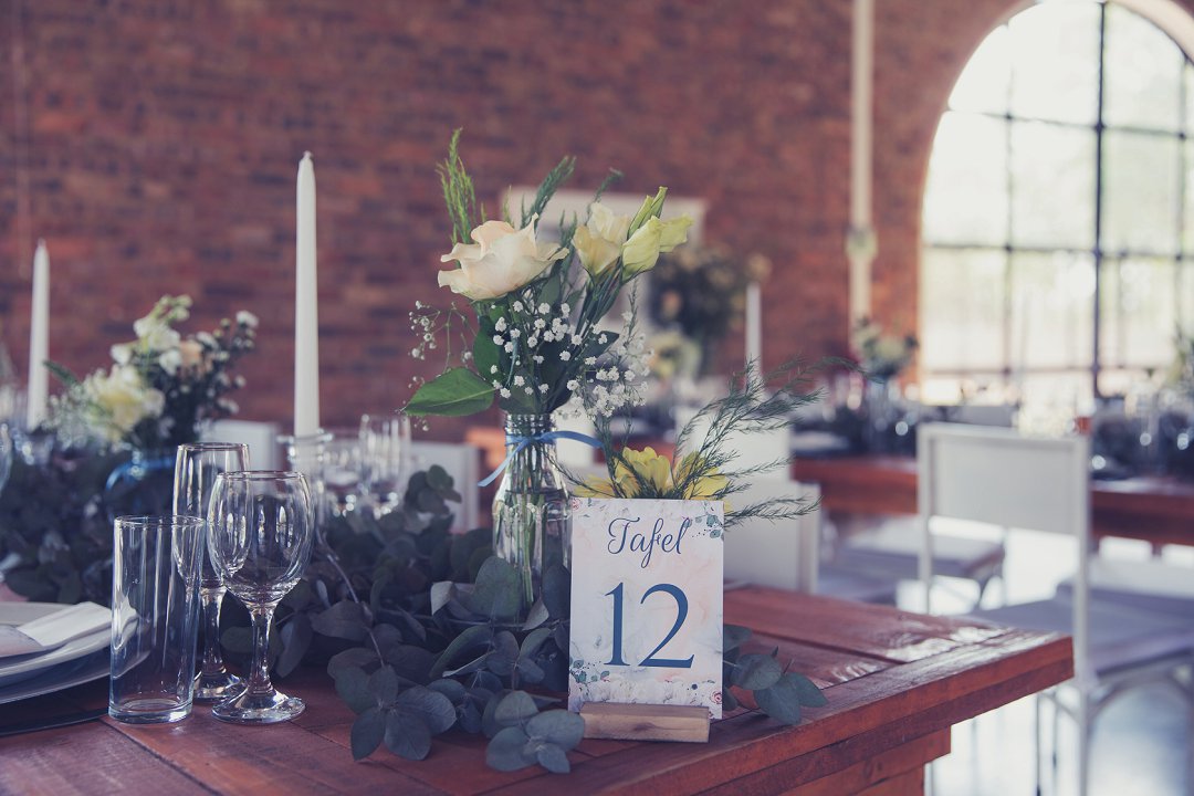 Die rou baksteen mure van die venue en die sagte wit en geel blomme met tikseltjies groen werk perfek. Met die rou van die onafgewerkte baksteen mure en die kontras van die sagte blomme op die tafels en die mooi skryfbehoeftes is dit ʼn wen kombinasie.