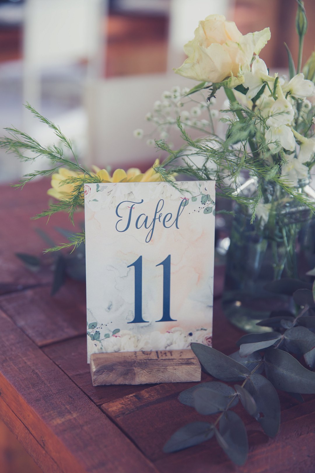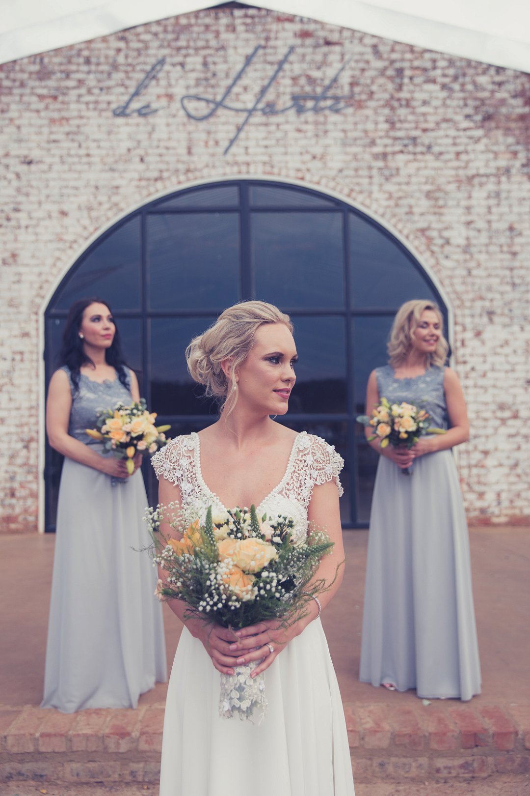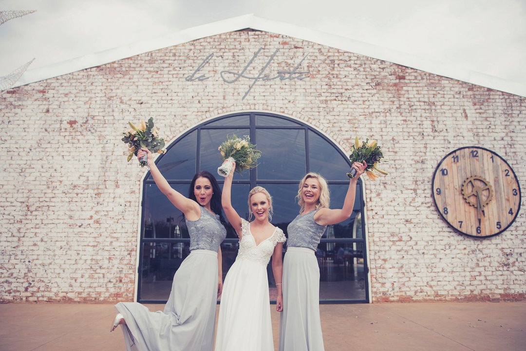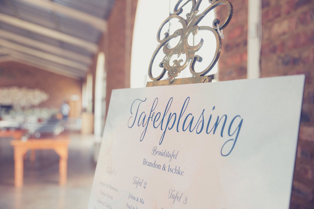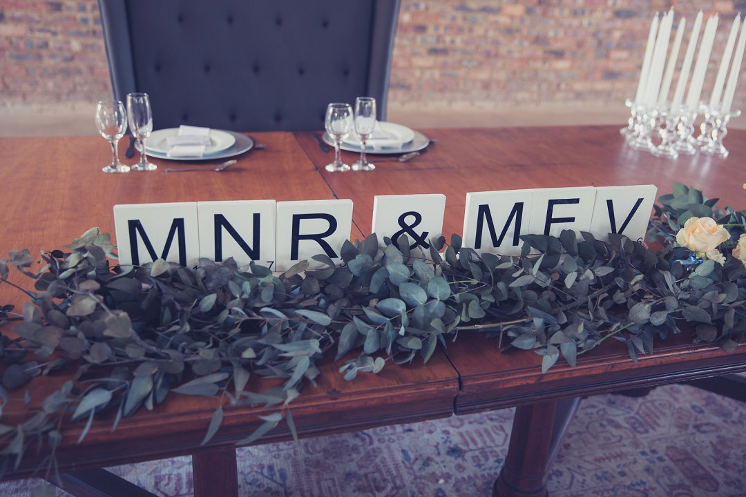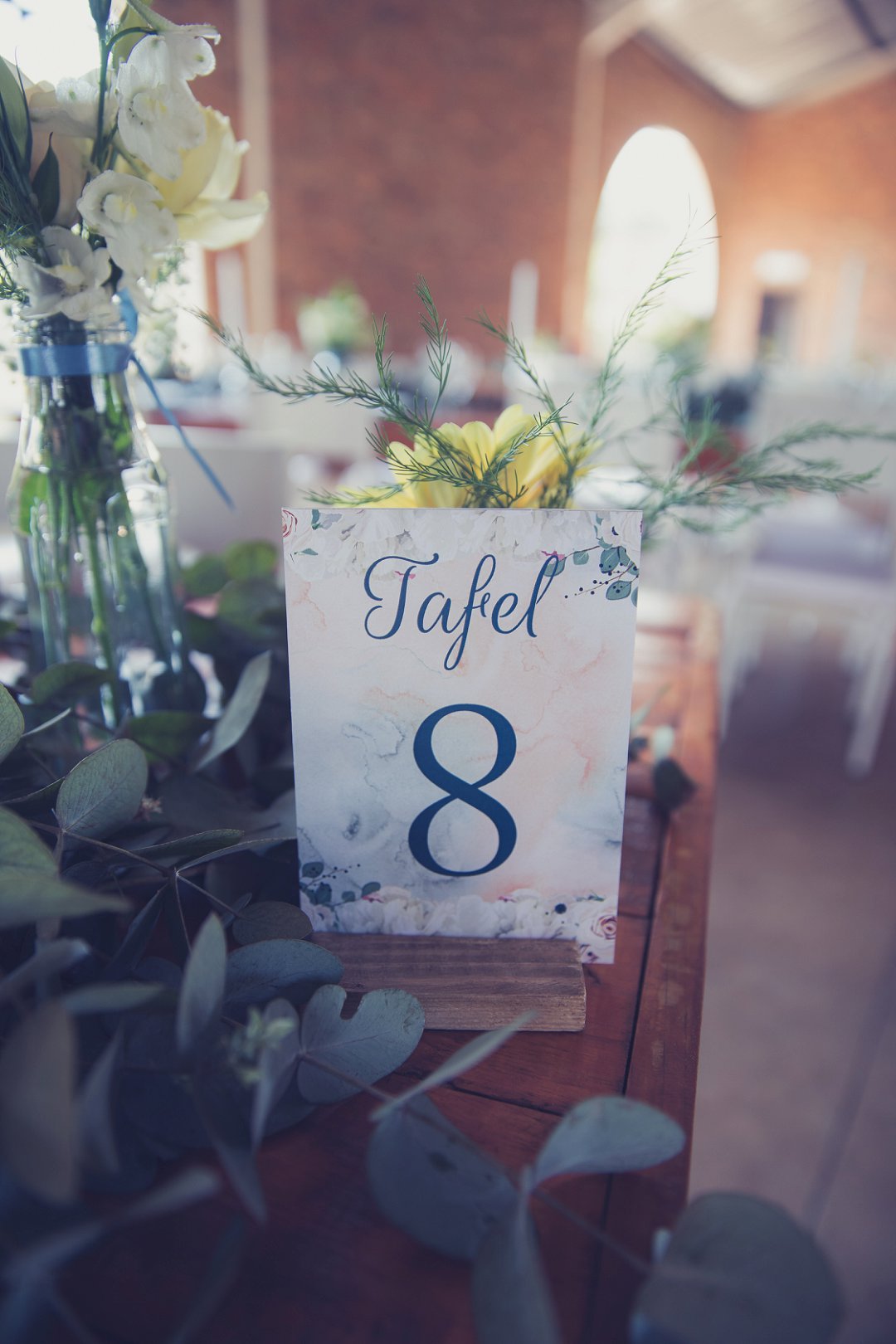 Die rou baksteen mure van die venue en die sagte wit en geel blomme met tikseltjies groen werk perfek. Met die rou van die onafgewerkte baksteen mure en die kontras van die sagte blomme op die tafels en die mooi skryfbehoeftes is dit ʼn wen kombinasie.