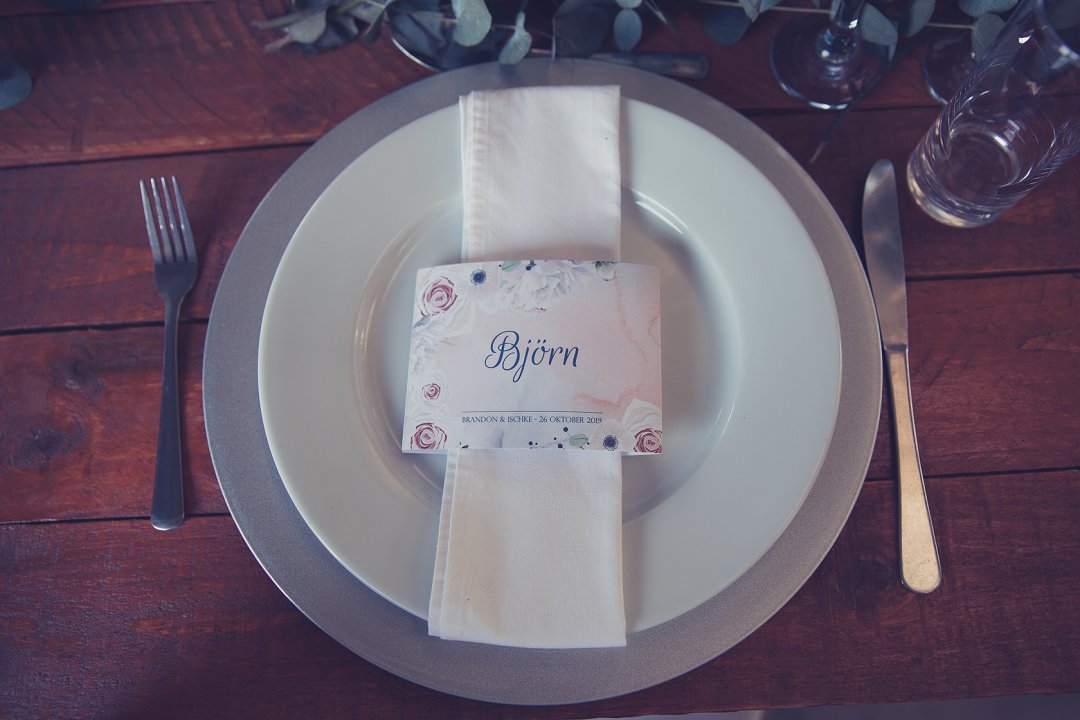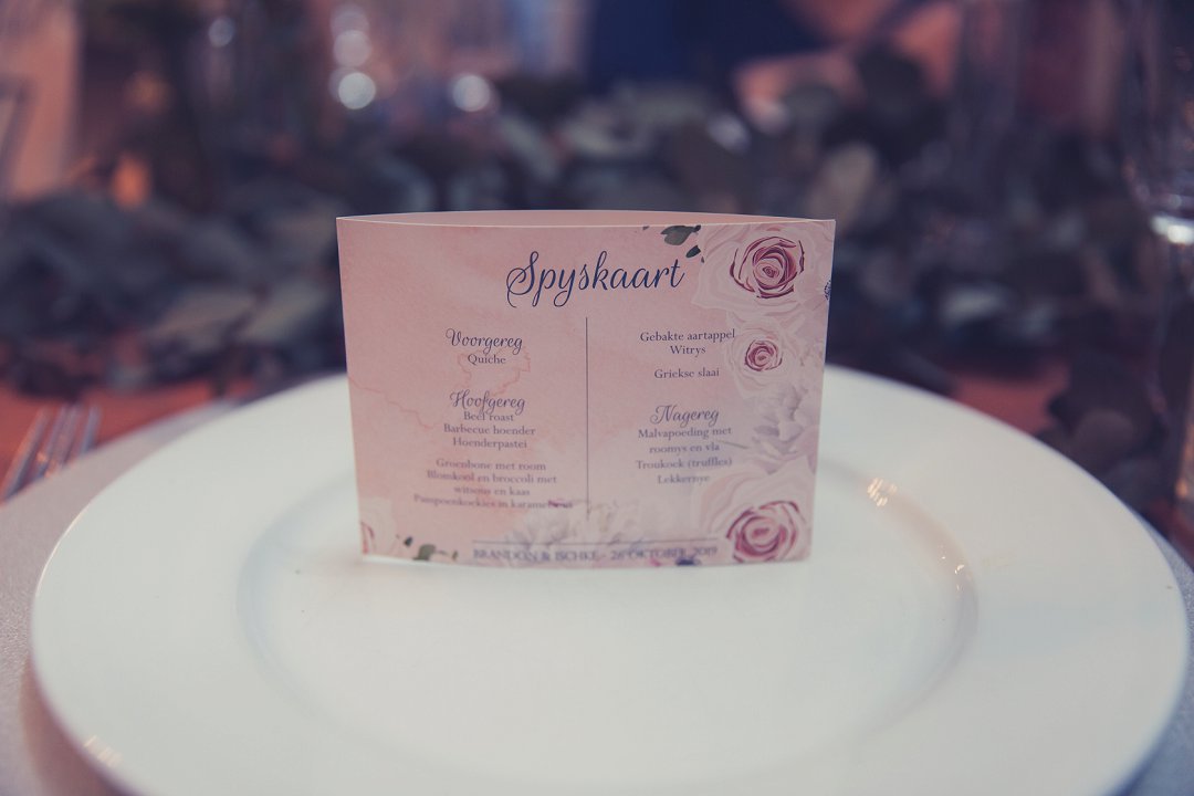 Die kleurskema was perskekleur en duifblou. Ons het blomme gekies wat daarby gepas het en die tafels was eenvoudig tog mooi gedek. Ek en Brandon wou nie teveel fieterjasies as dekor hê nie.
