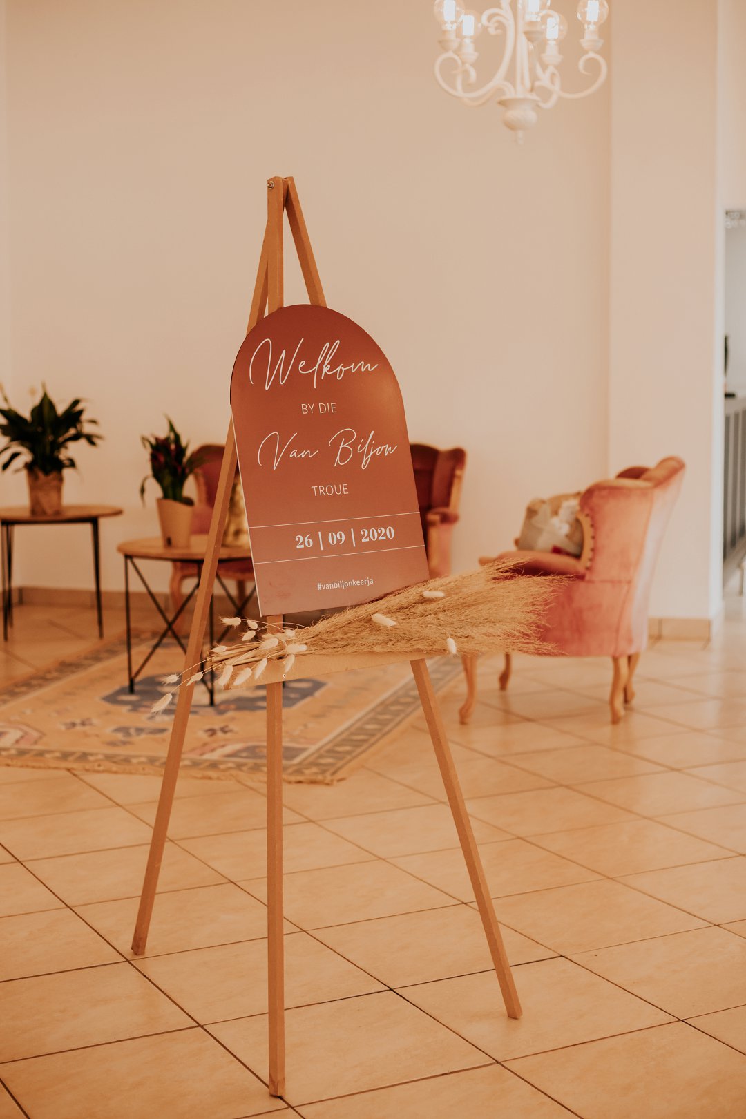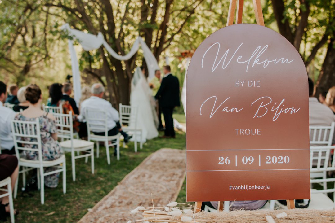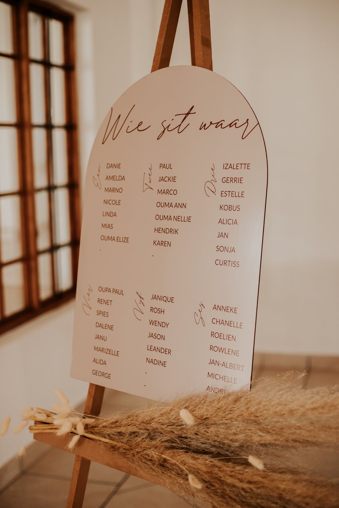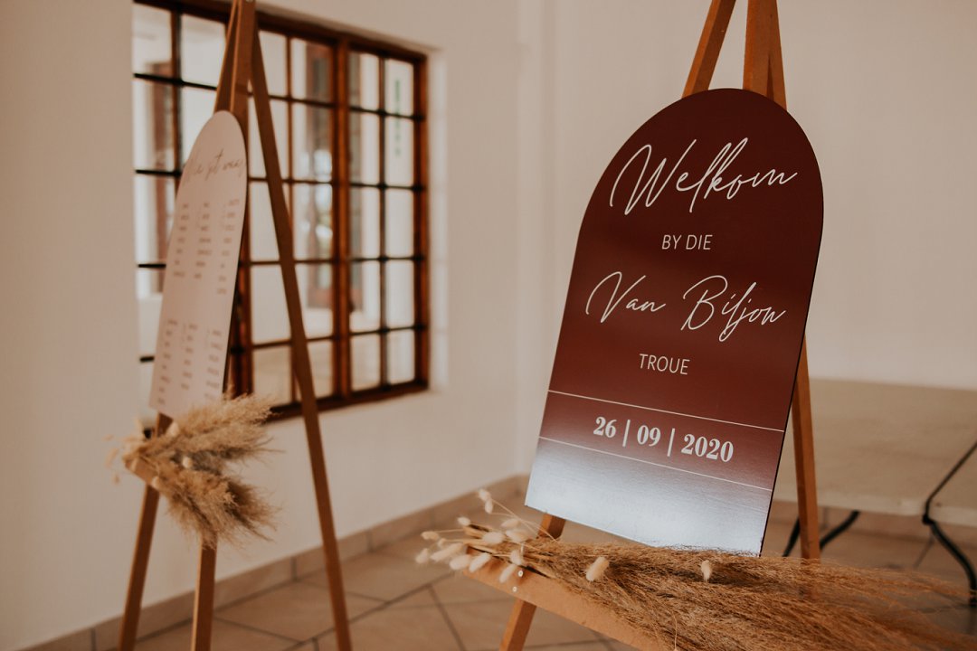 Trou skryfbehoeftes speel ʼn groot rol by ʼn troue. Die pragtige plakkaat by die seremonie wys die paartjie se trou hutsteken #vanbiljonkeerja, ʼn goeie idee vir sosiale media. Hutstekens is ʼn goeie manier vir paartjies om hul gaste se foto’s van hul troue na die tyd op te spoor. ʼn Sitplek aanwyser is ook belangrik om jou gaste in kennis te stel by watter tafel hulle moet sit. MU Studio het ook ʼn baie oulike spyskaart in ʼn halfmaan vorm ontwerp met ʼn tosseltjie aan. Die spyskaart ontwerp is definitief uniek en julle moet definitief daarna kyk vir inspirasie vir jul eie troue.