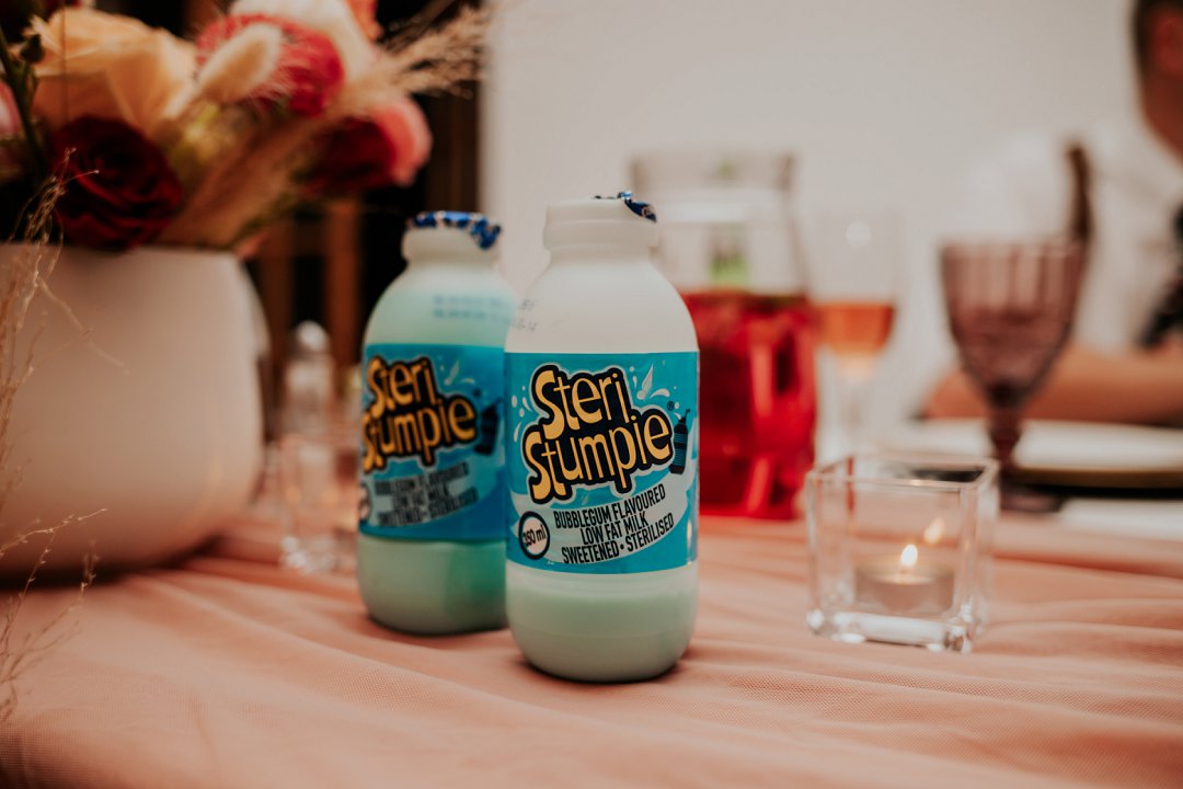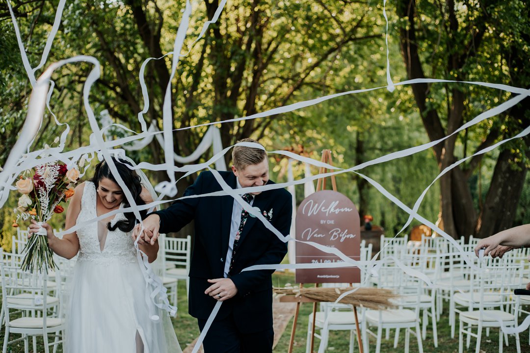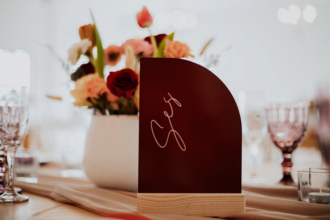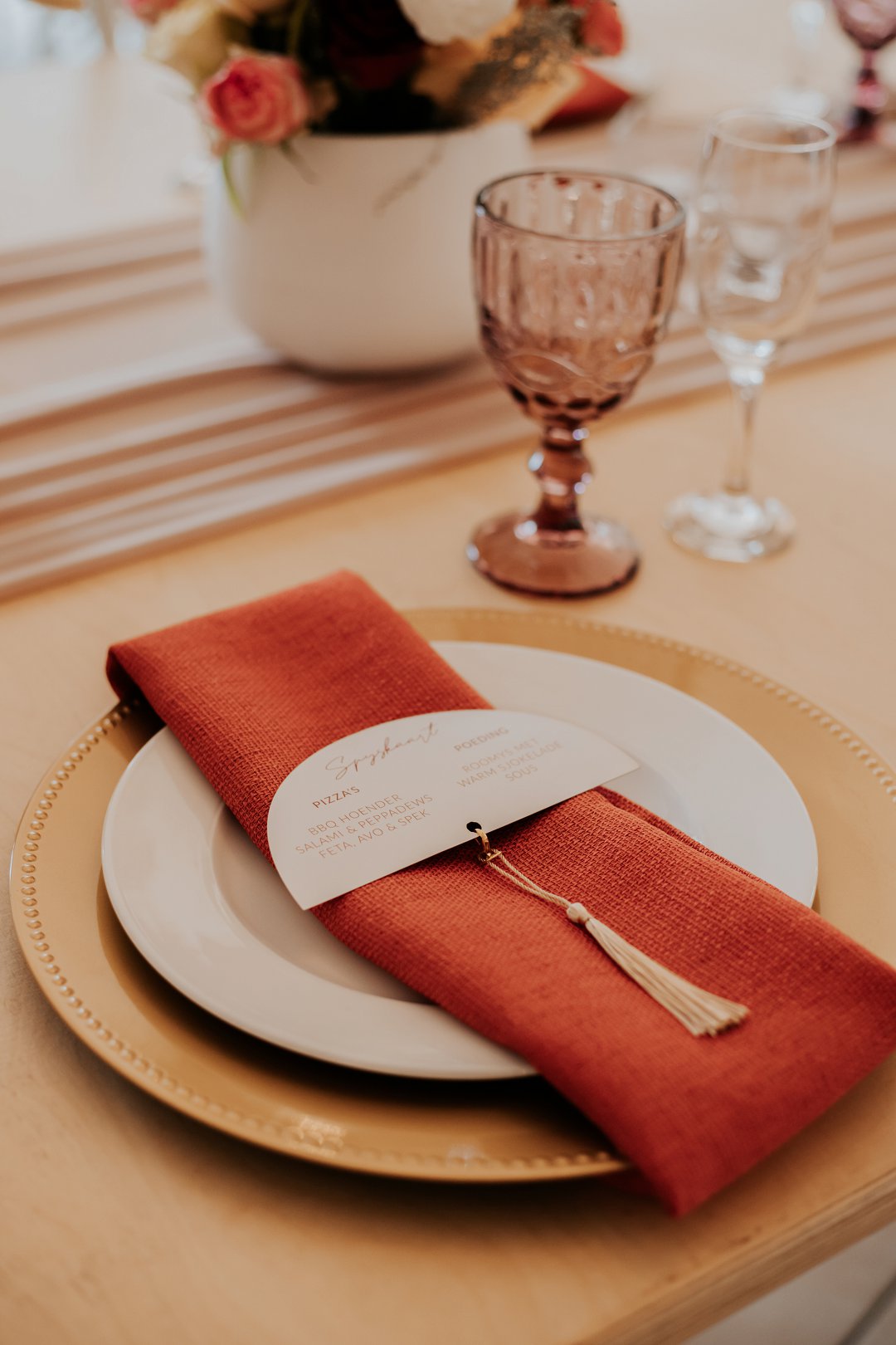 Trou skryfbehoeftes speel ʼn groot rol by ʼn troue. Die pragtige plakkaat by die seremonie wys die paartjie se trou hutsteken #vanbiljonkeerja, ʼn goeie idee vir sosiale media. Hutstekens is ʼn goeie manier vir paartjies om hul gaste se foto’s van hul troue na die tyd op te spoor. ʼn Sitplek aanwyser is ook belangrik om jou gaste in kennis te stel by watter tafel hulle moet sit. MU Studio het ook ʼn baie oulike spyskaart in ʼn halfmaan vorm ontwerp met ʼn tosseltjie aan. Die spyskaart ontwerp is definitief uniek en julle moet definitief daarna kyk vir inspirasie vir jul eie troue.