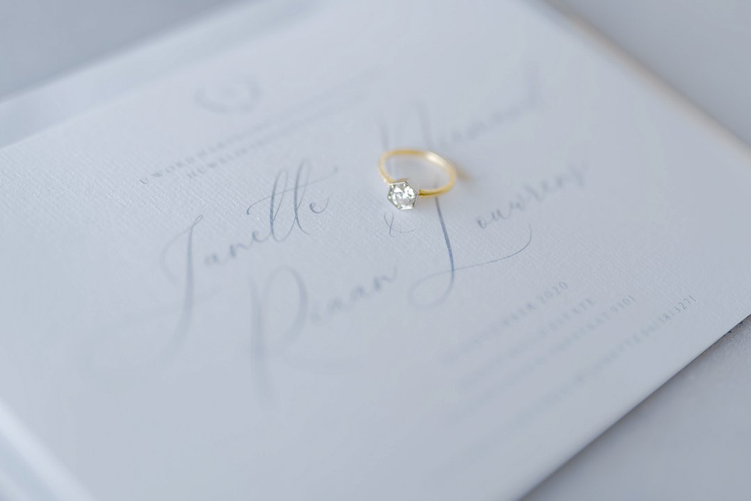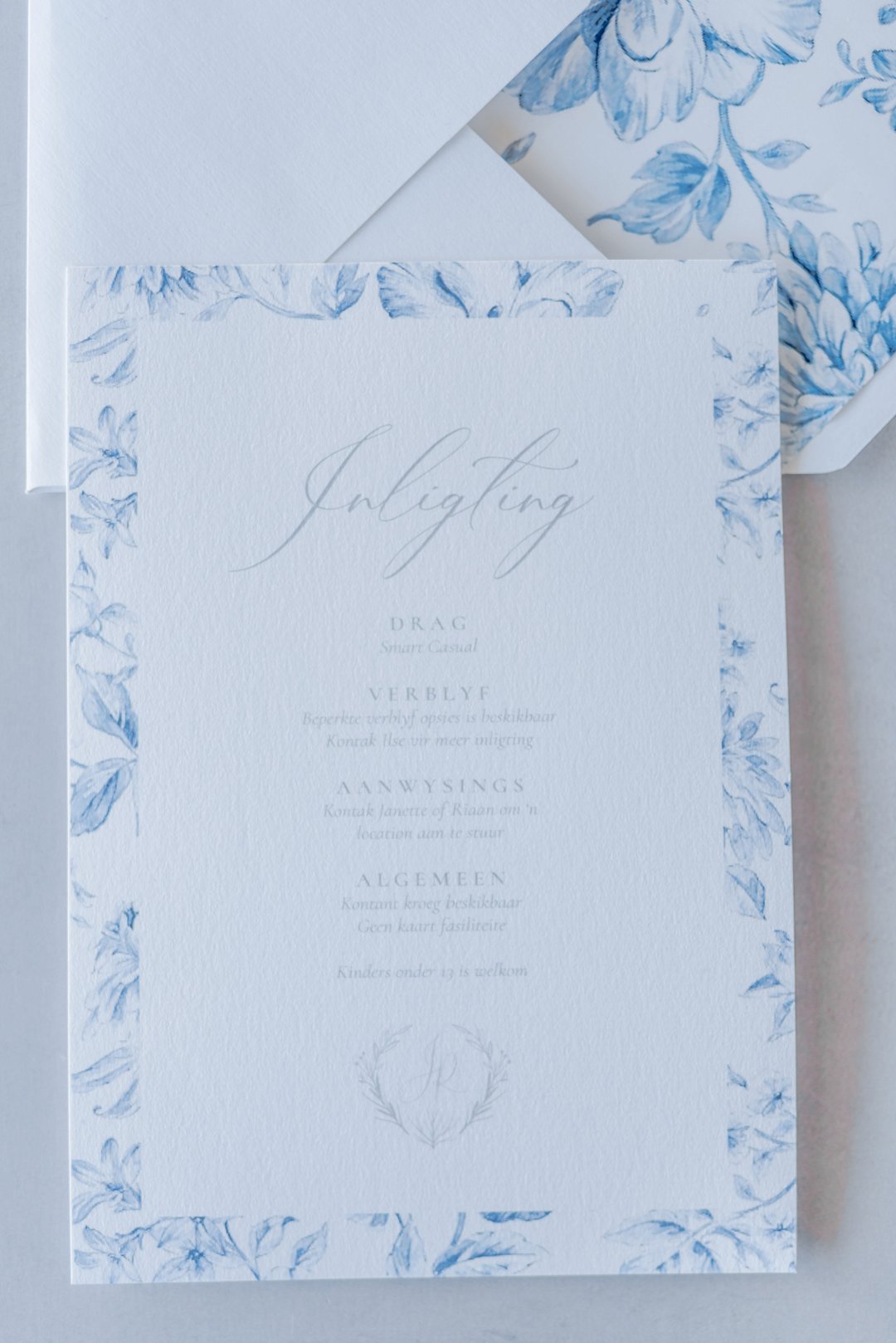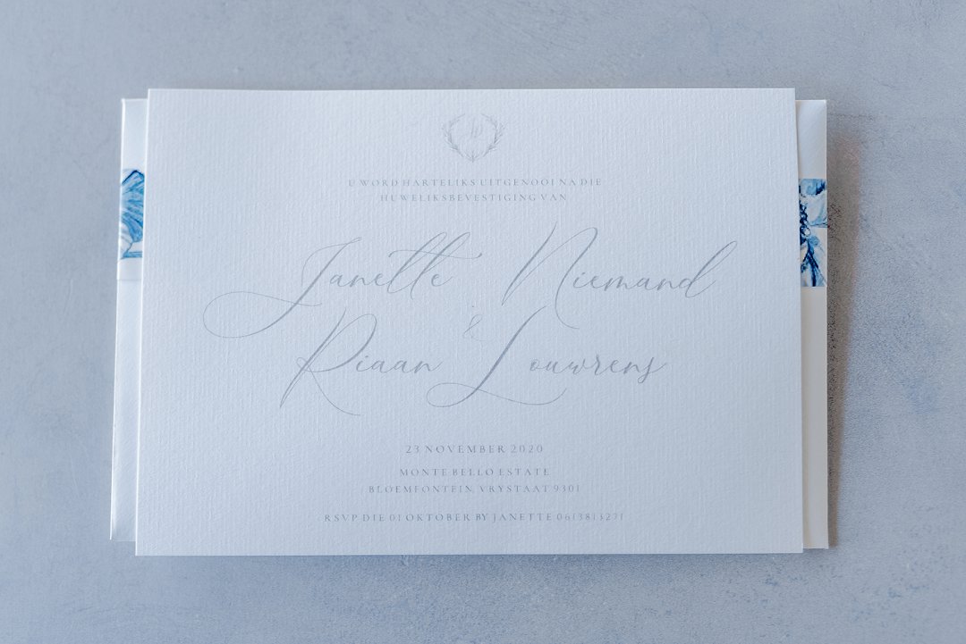 Die ligte ontwerp, fyn lyne en skrif pas so mooi bymekaar en gee die ontwerp ʼn modern, maar baie elegante gevoel. Fyn blou blom illustrasies raam die uitnodiging van die skryfbehoeftes stel. Dit is prentjie mooi hoe die fyn blou en wit blom illustrasies die uitnodiging so mooi afrond. Die paartjie se voorletters word ook gebruik op die skryfbehoeftes in ʼn tipe van ʼn kroon of embleem. So ʼn oulike element en gee die uitnodigings ook ʼn baie persoonlike gevoel.