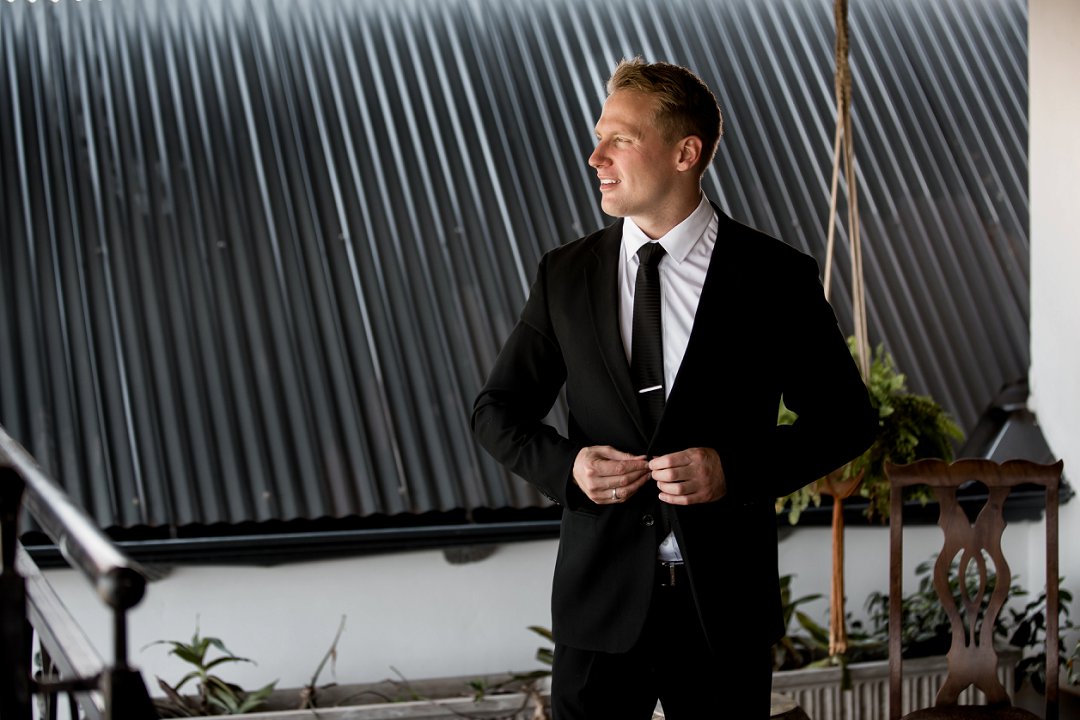 Dewald se troupak was swart en hy het ʼn swart das gedra – hy het ook bykomstighede soos manchetknope en ʼn dasspeld gedra, en die kleur het ons ingebring met sy Bordeaux skouerruiker.
