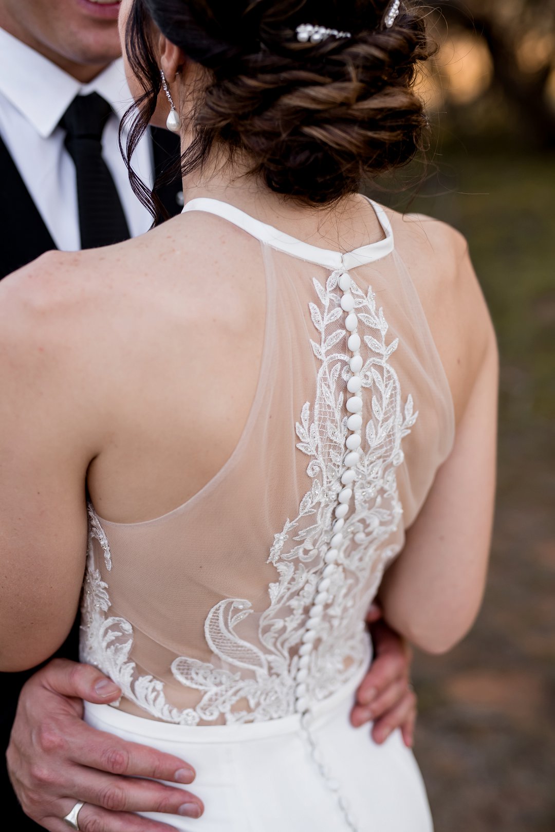 My trourok was eenvoudig met ʼn halter nek bo-stuk. Ek is nogal lief vir detail so die kant bo-stuk het ons laat borduur met ekstra pêreltjies en steentjies, en dan het ek ook ʼn ‘bruidsgordel’ gedra.