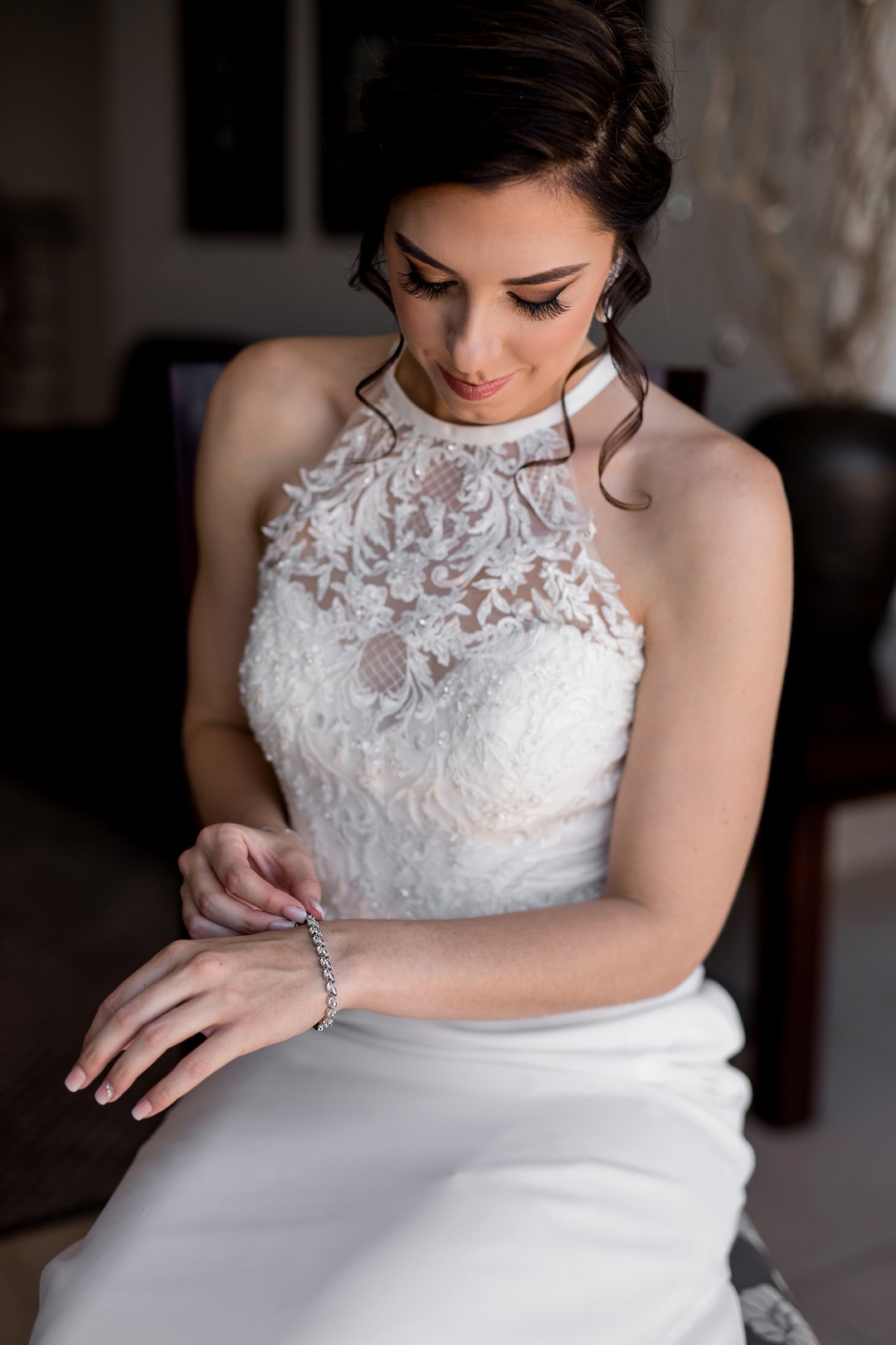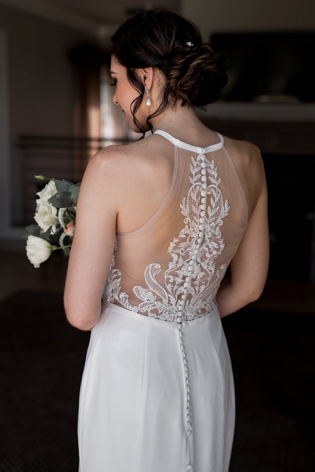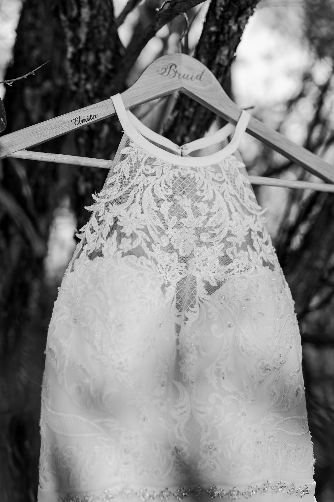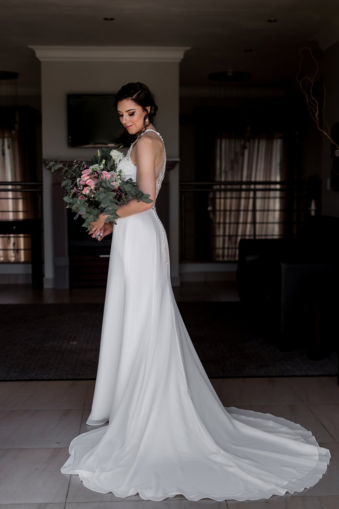 Elmien se trourok was eenvoudig met ʼn halter nek bo-stuk. Die kant bo-stuk het sy laat borduur met ekstra pêreltjies en steentjies. Om haar hele voorkoms af te rond het Elmien ook ʼn ‘bruidsgordel’ gedra. Haar trourok is van Bridal Manor geleë in Pretoria. Die toekomstige bruid wat opsoek is na haar droom trourok kan gerus ʼn besoek af lê aan Bridal Manor. Hul professionele konsultante sal jou help om die perfekte trourok te vind. Maak sommer vandag nog jou afspraak.
