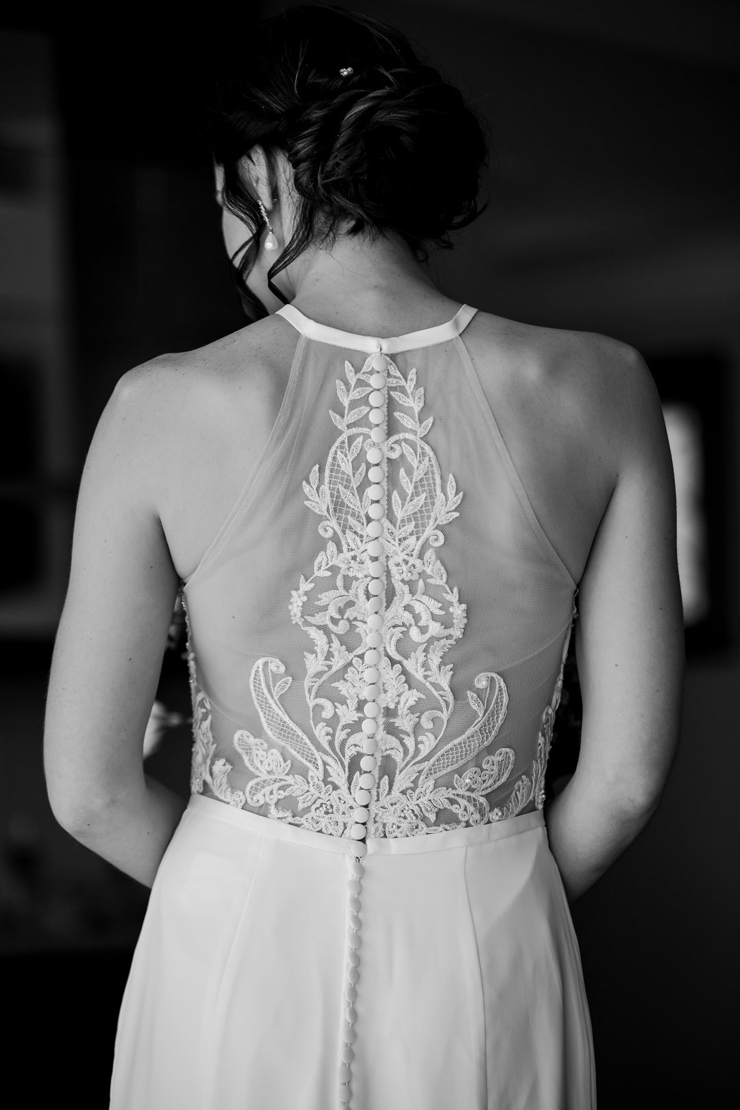 My trourok was eenvoudig met ʼn halter nek bo-stuk. Ek is nogal lief vir detail so die kant bo-stuk het ons laat borduur met ekstra pêreltjies en steentjies, en dan het ek ook ʼn ‘bruidsgordel’ gedra.