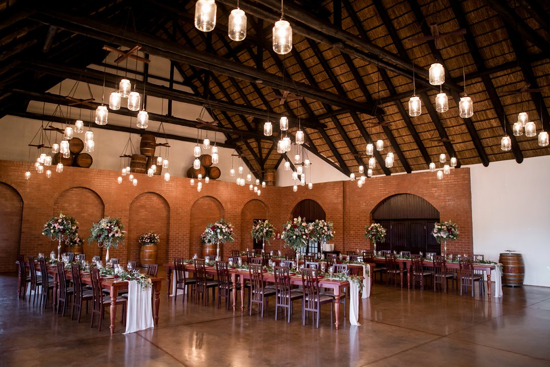 Mooiplaas het ek toevallig op Mooi Troues se Facebook ontdek, so kort rukkie nadat hulle oopgemaak het. Ek was dadelik verlief – dis al die elemente wat ek by ʼn venue gesoek het. Groot onthaalarea / dansvloer, houttafels, hoe plafon, pragtige beligting, mooi uitsig oor die Bosveld ens.