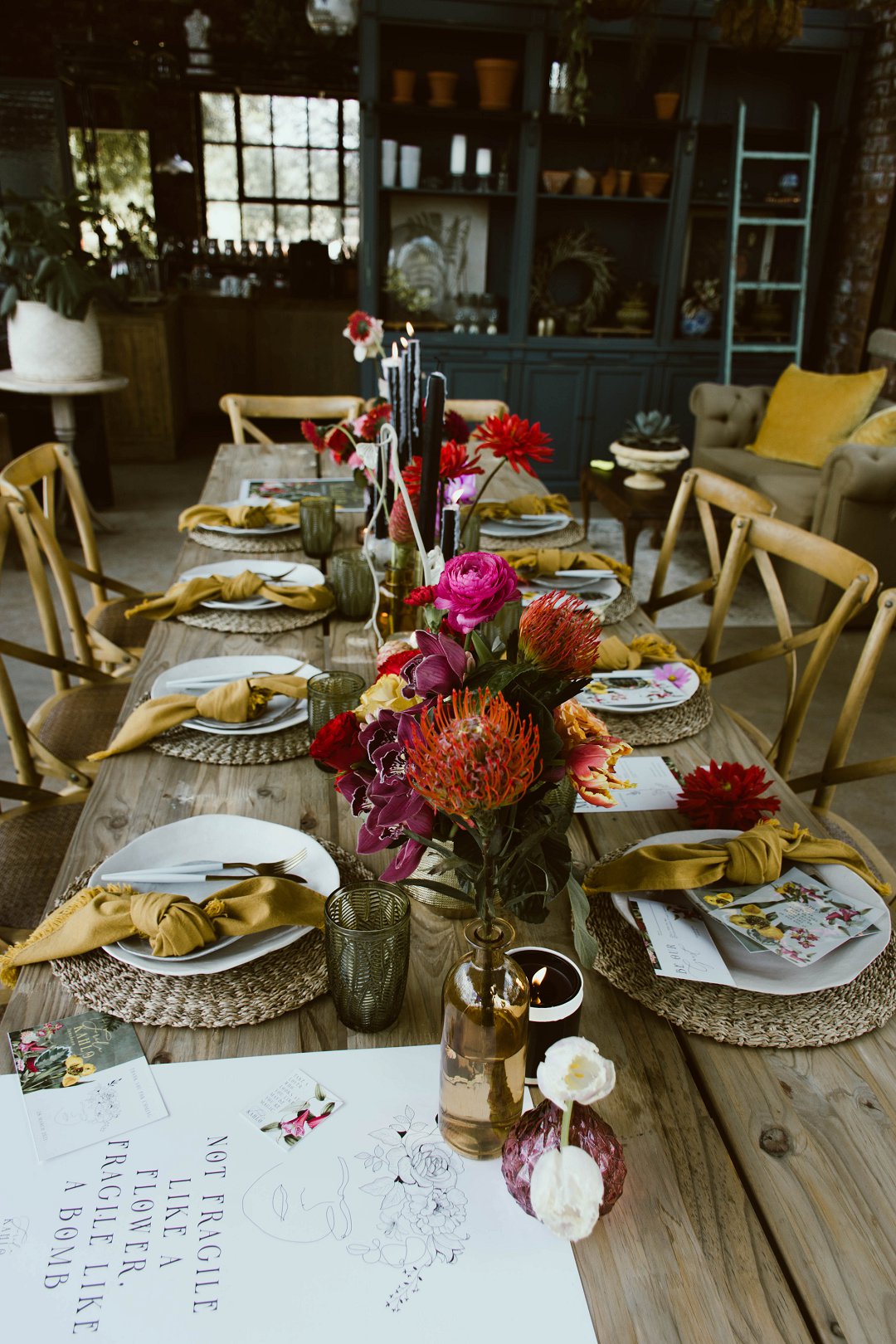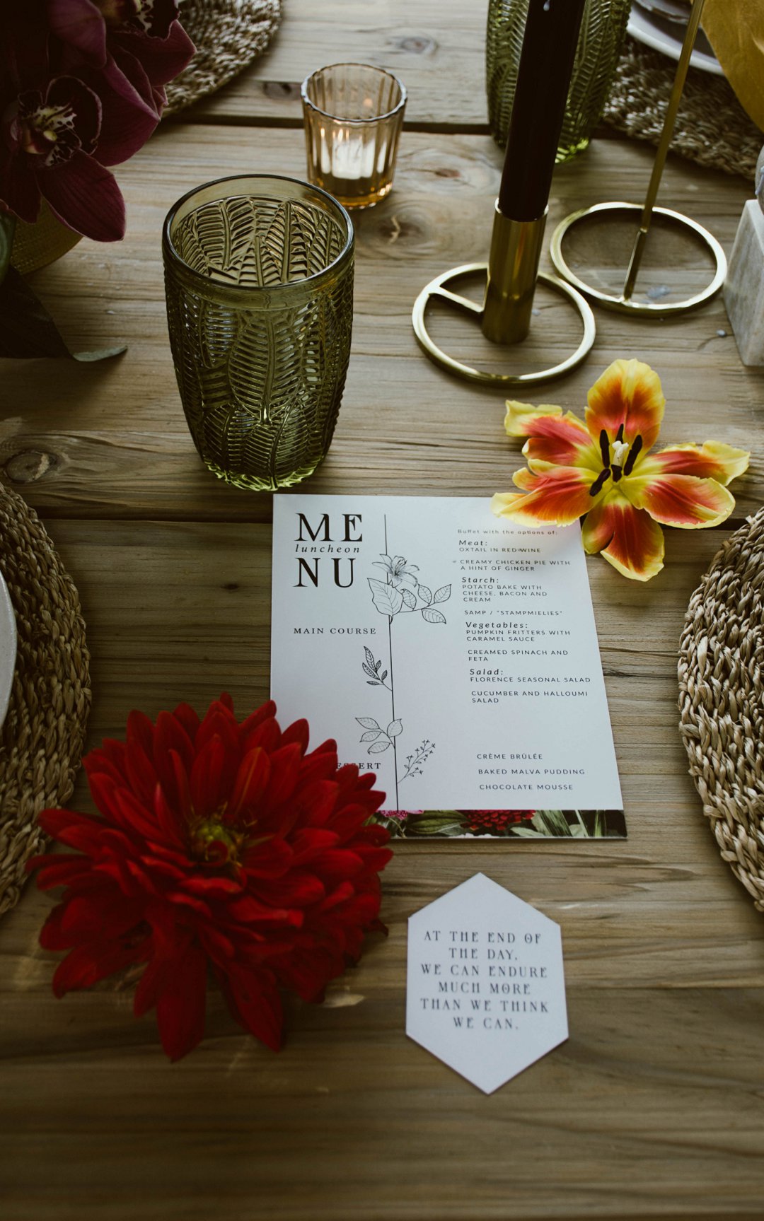 Die verskillende rok ontwerpe is prentjie mooi en baie sag op die oog. Dan is daar die pragtigste blom ontwerpe wat al die verskillende kleurskakerings so mooi uitbeeld. Ons is mal daaroor hoe hulle die mosterd, groene, rooi en pers alles so mooi laat bymekaar vloei. Die tafel dekor op die ligte hout tafel en die helder blom illustrasie skryfbehoeftes werk perfek saam met die tema. Verskillende blom tipes was saam gebruik en dit wys jou dat alles moontlik is.