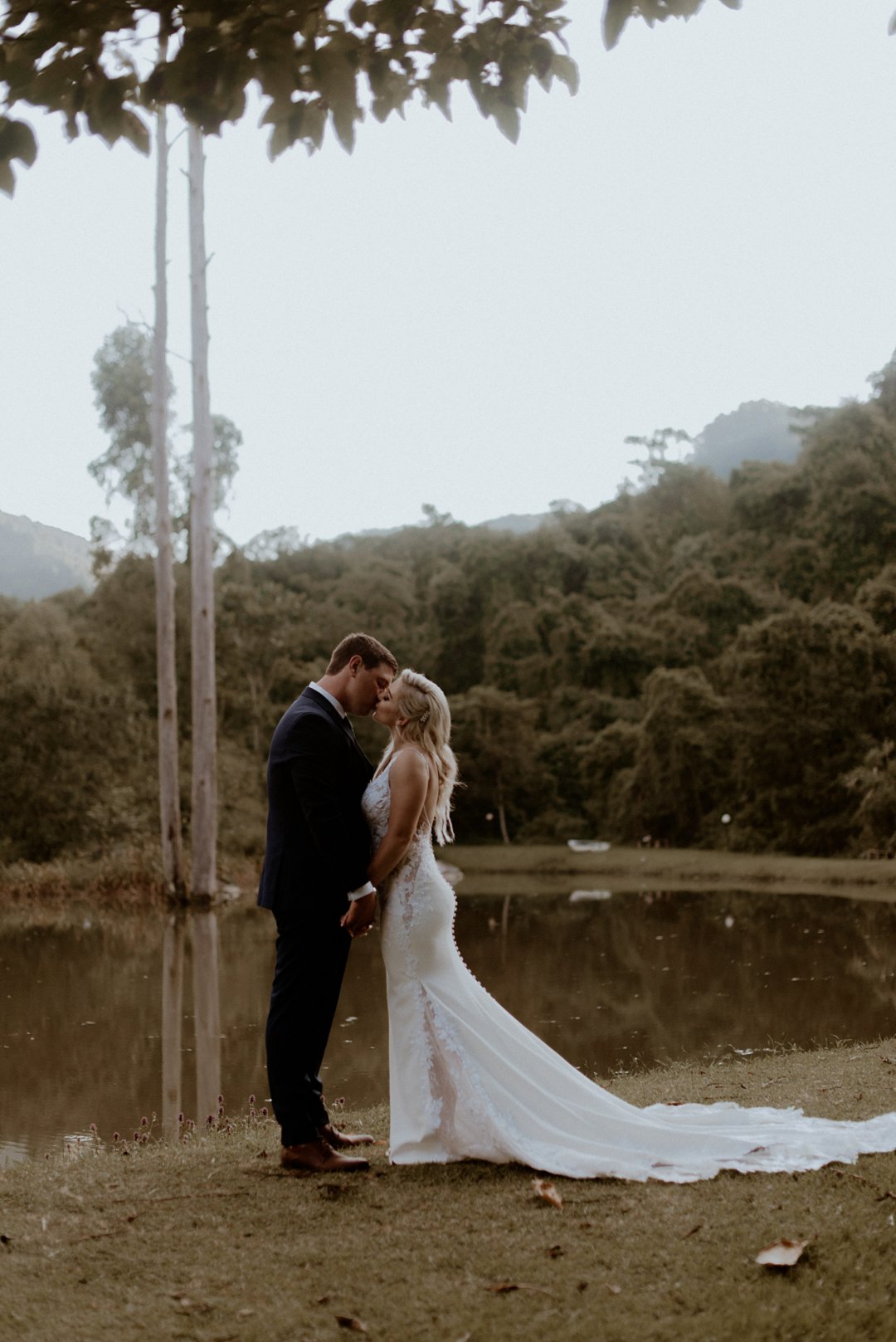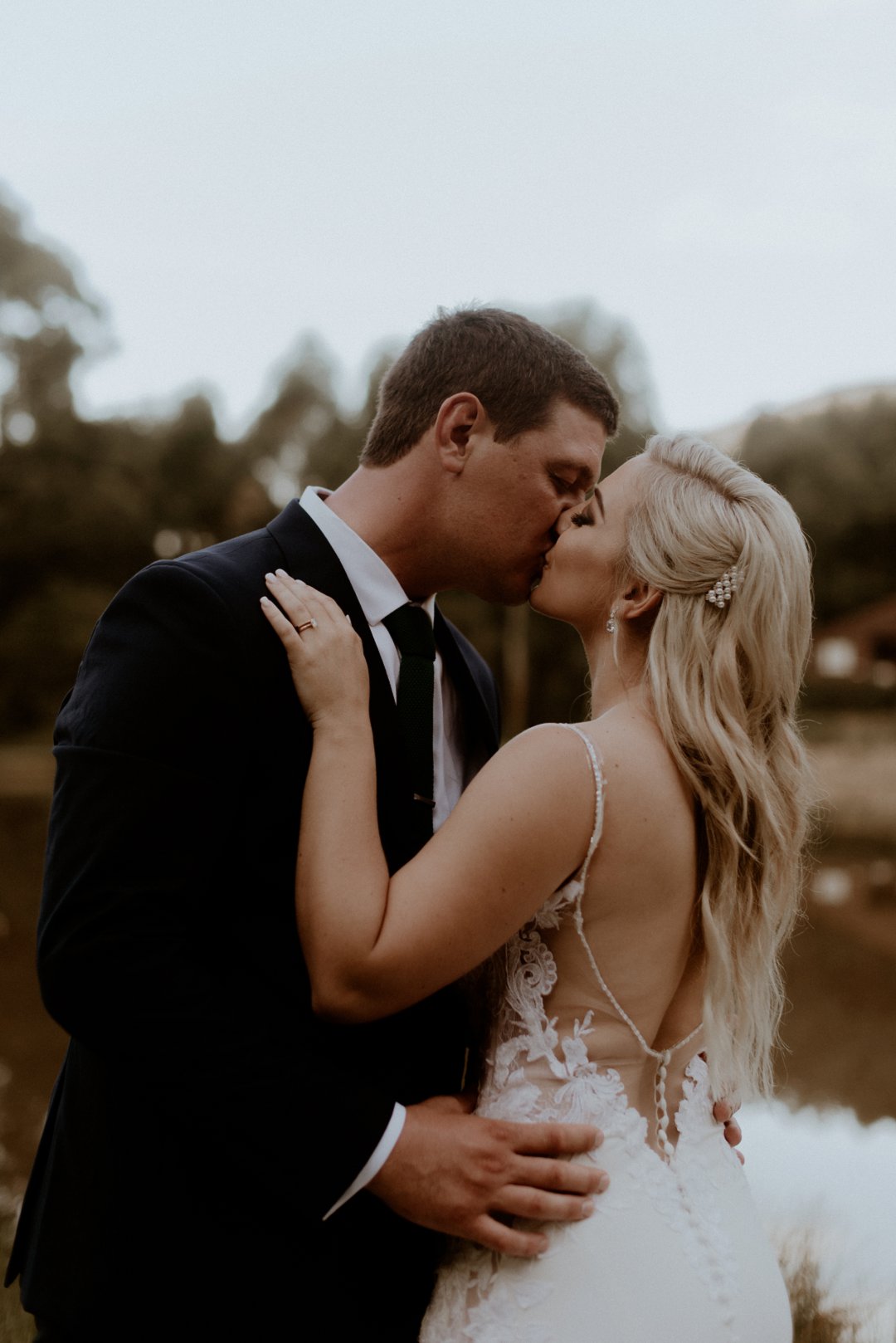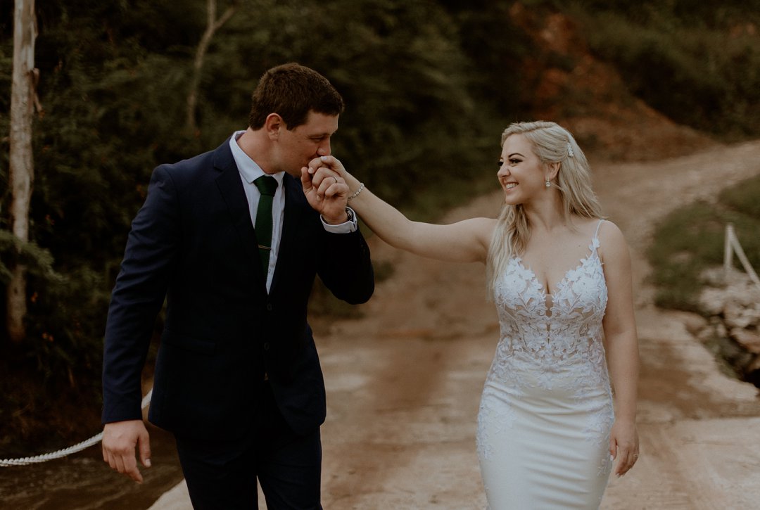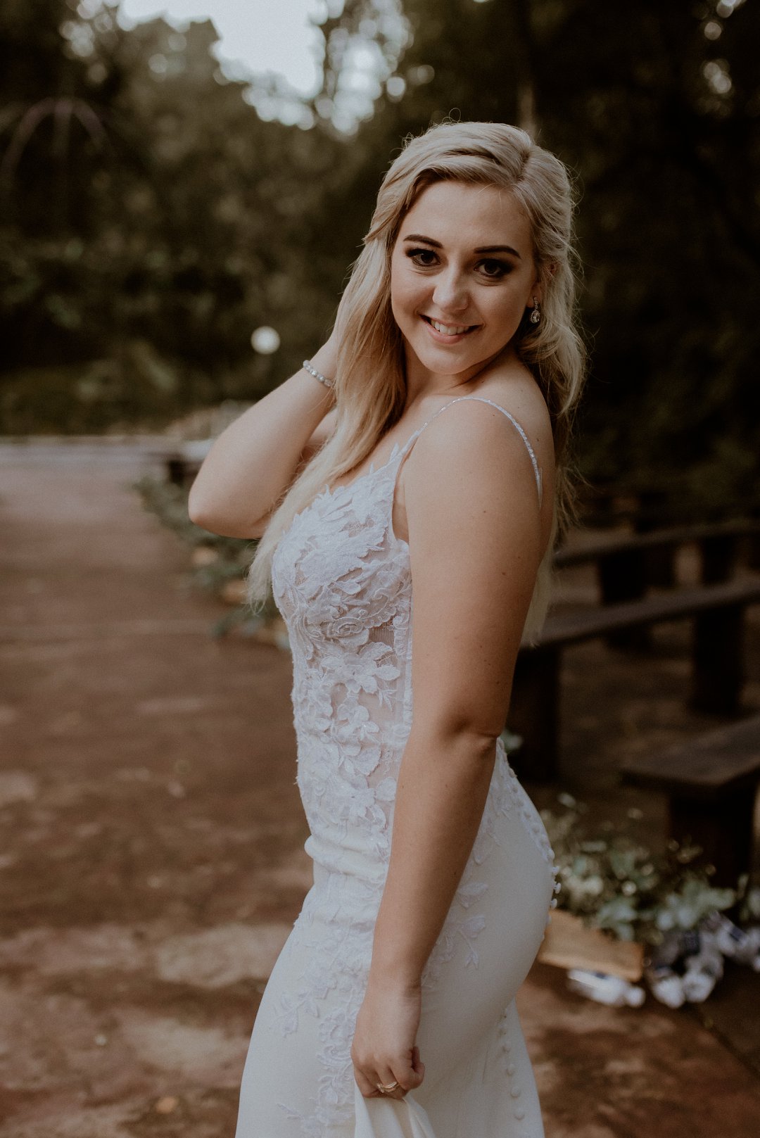 Ons het probeer om nogsteeds by die mooi venue se styl te hou omdat dit so mooi tropies/woud area is in Magoebaskloof. Christo het ʼn vlootblou pak met ʼn wit hemp en ʼn donkergroen das gedra (dieselfde groen as my strooimeisies se rompe) en ek het ʼn “trumpet” styl rok gehad met kant op die bokant en aan die buitekant van my lang sleep. Ons altwee is nie iemand wat “over the top” wil wees nie, en het dit nogsteeds baie formeel gehou.