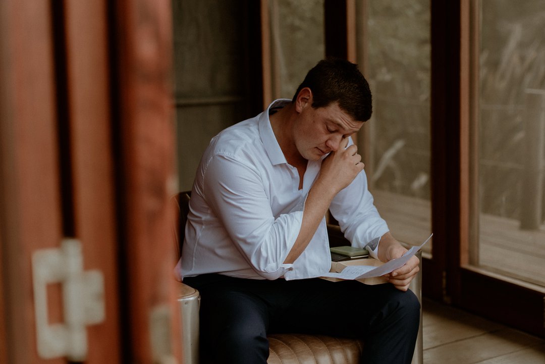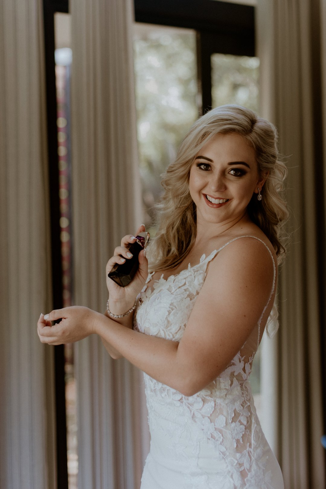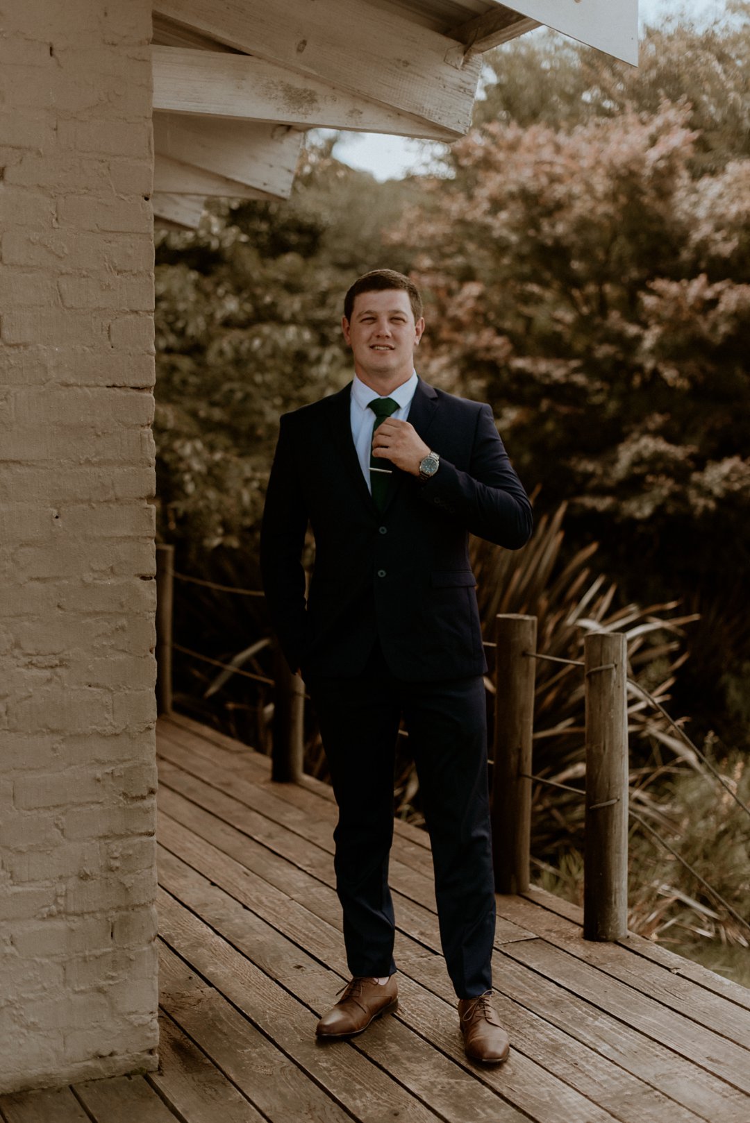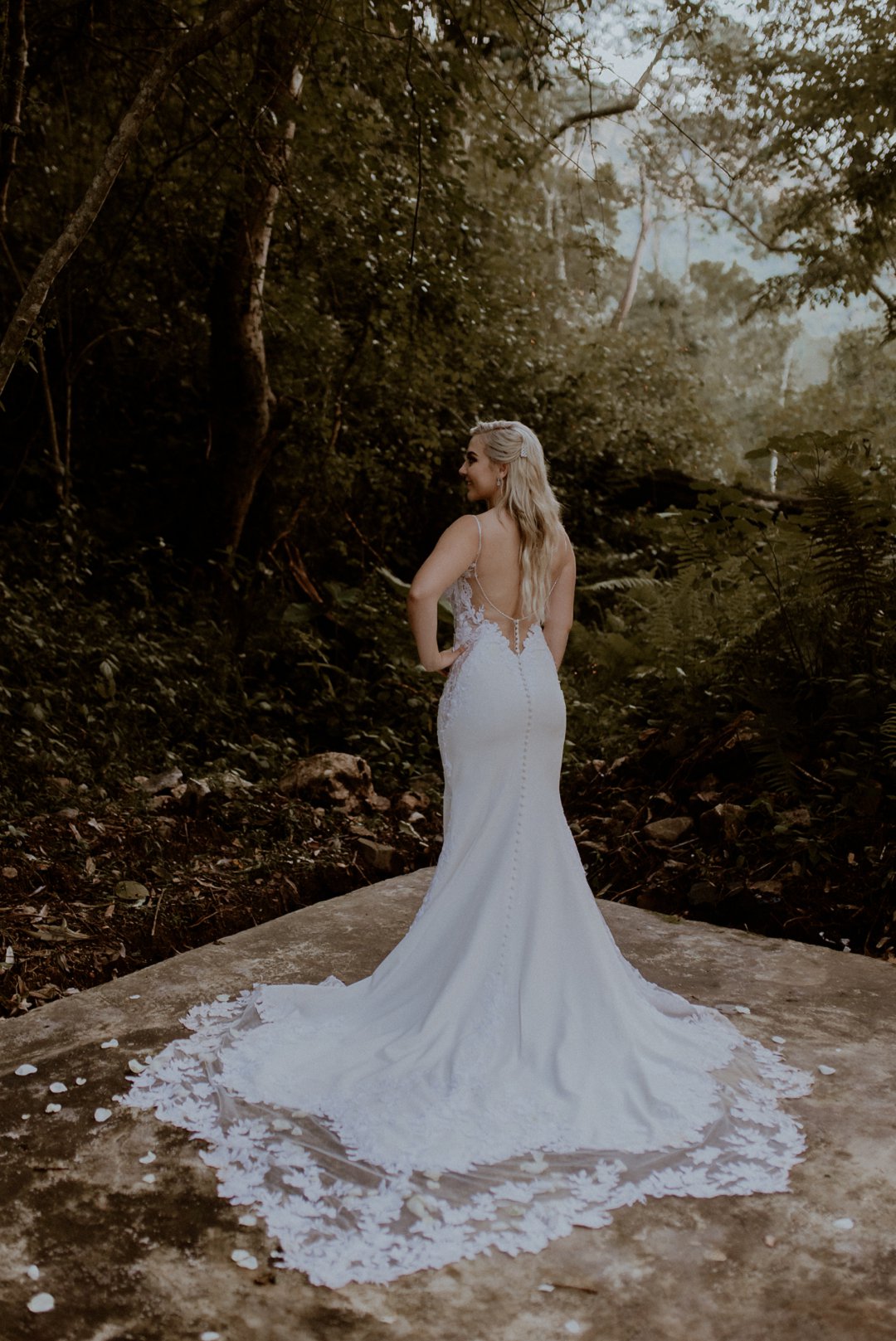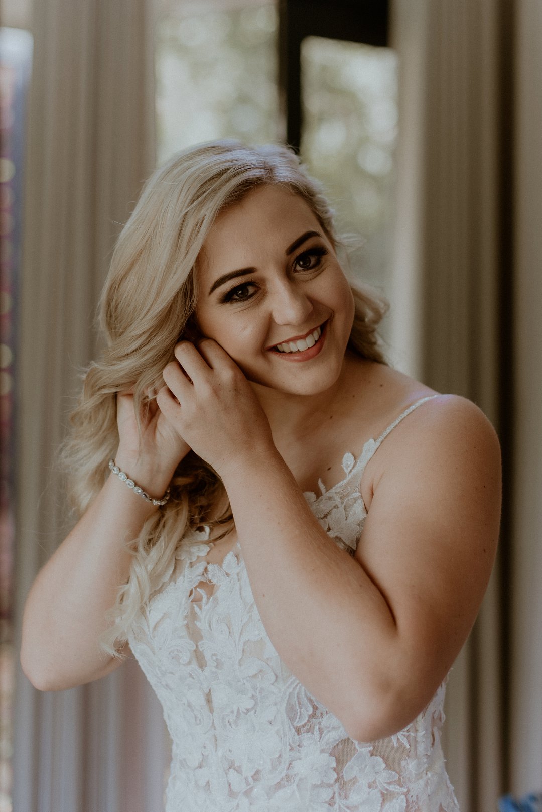 Ons het probeer om nogsteeds by die mooi venue se styl te hou omdat dit so mooi tropies/woud area is in Magoebaskloof. Christo het ʼn vlootblou pak met ʼn wit hemp en ʼn donkergroen das gedra (dieselfde groen as my strooimeisies se rompe) en ek het ʼn “trumpet” styl rok gehad met kant op die bokant en aan die buitekant van my lang sleep. Ons altwee is nie iemand wat “over the top” wil wees nie, en het dit nogsteeds baie formeel gehou.