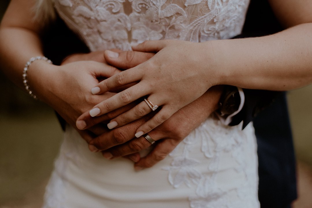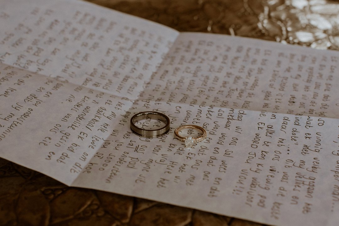 Ons trouringe is meer modern, my ring is goud met ʼn ovaal diamant en ʼn pant met klein diamantjies. Christo se ring is ʼn 5mm silwer ring met ons trou embleem aan die binne kant gegraveer.