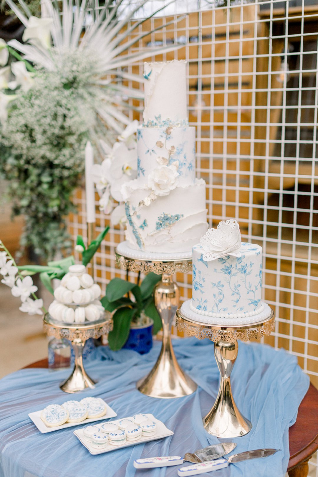 Sagte skakerings van blou. Cultiv8 het die sagte kleure ingebring met wit orgidee in Delft houers. Blou Krismisrose en sagte verskeidenheid wit en blou blommetjies in wit en blou houers en wit swaardlelies. Pragtige Delft porselein, blou servette, goue eetgerei, handgeverfde “macarons” as dankie sê geskenkies.