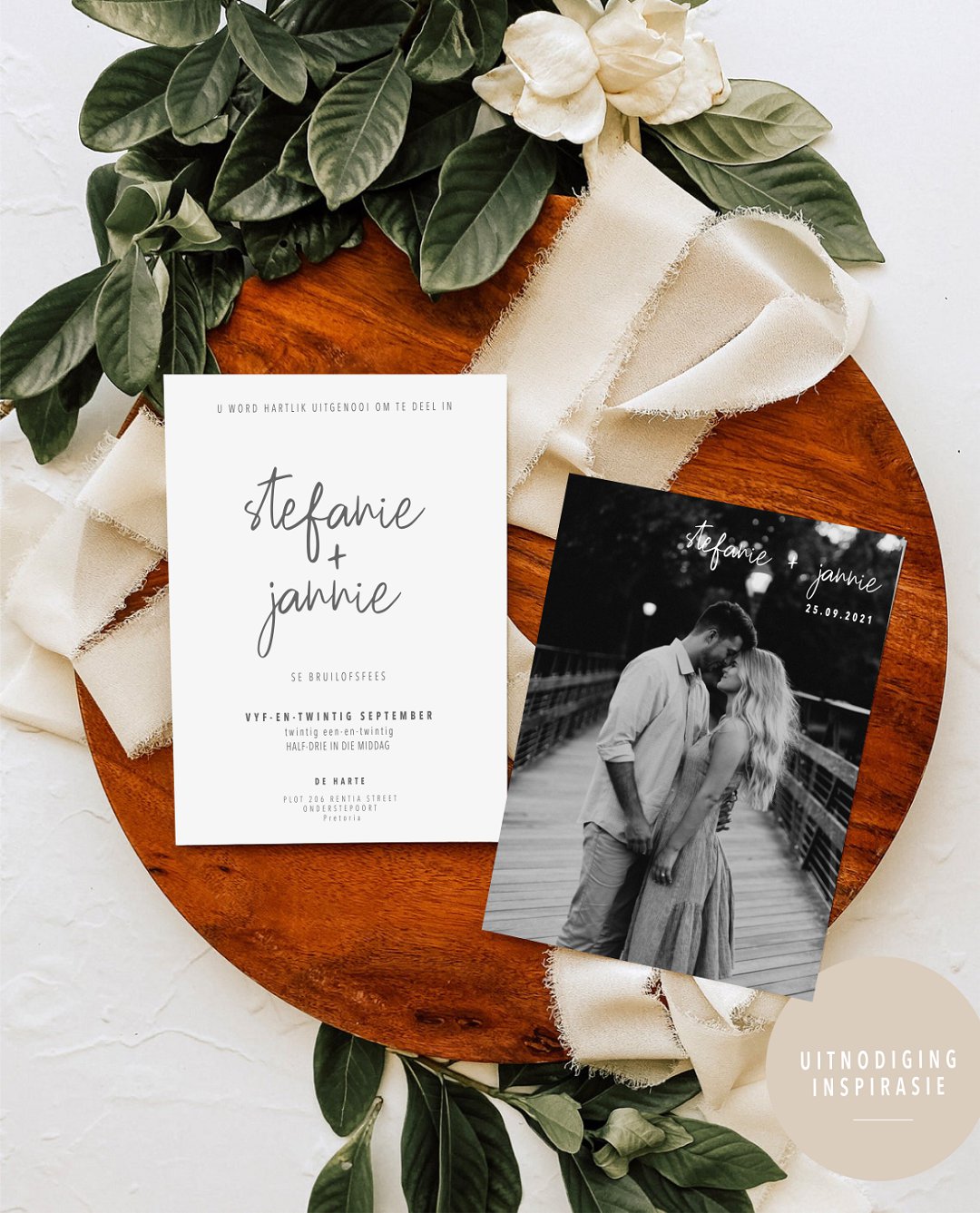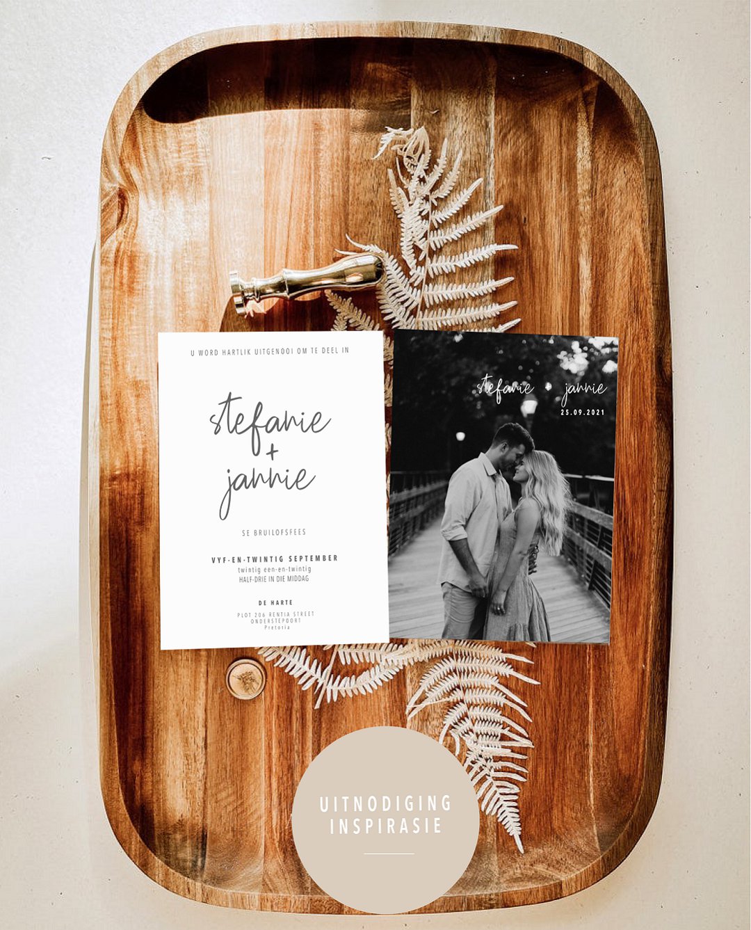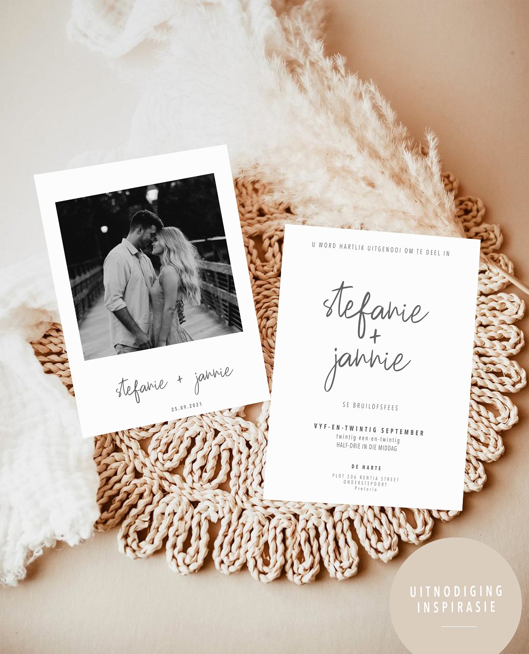 Ons is mal oor die minimalistiese, maar steeds stylvolle ontwerp van die oulike trou uitnodiging. Die ontwerp is nie so oorweldigend nie en steeds so ʼn oulike idee vir ʼn trou uitnodiging. Hierdie ontwerp is ook van so aard dat dit by enige trou tema kan pas. Dit is so uniek en steeds so divers.