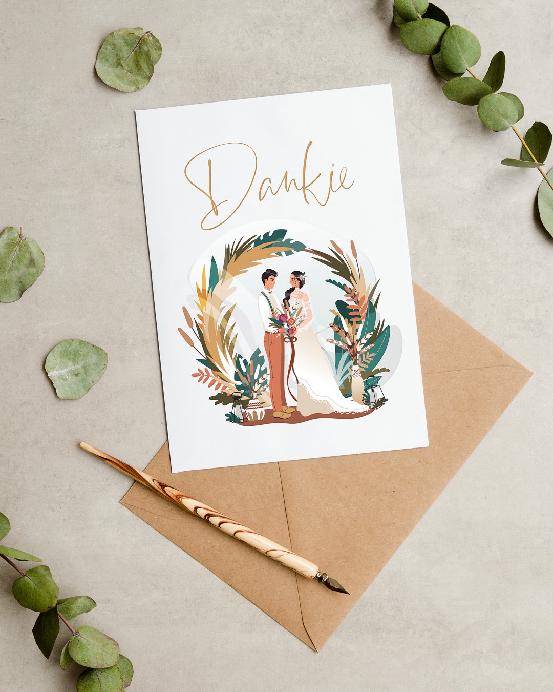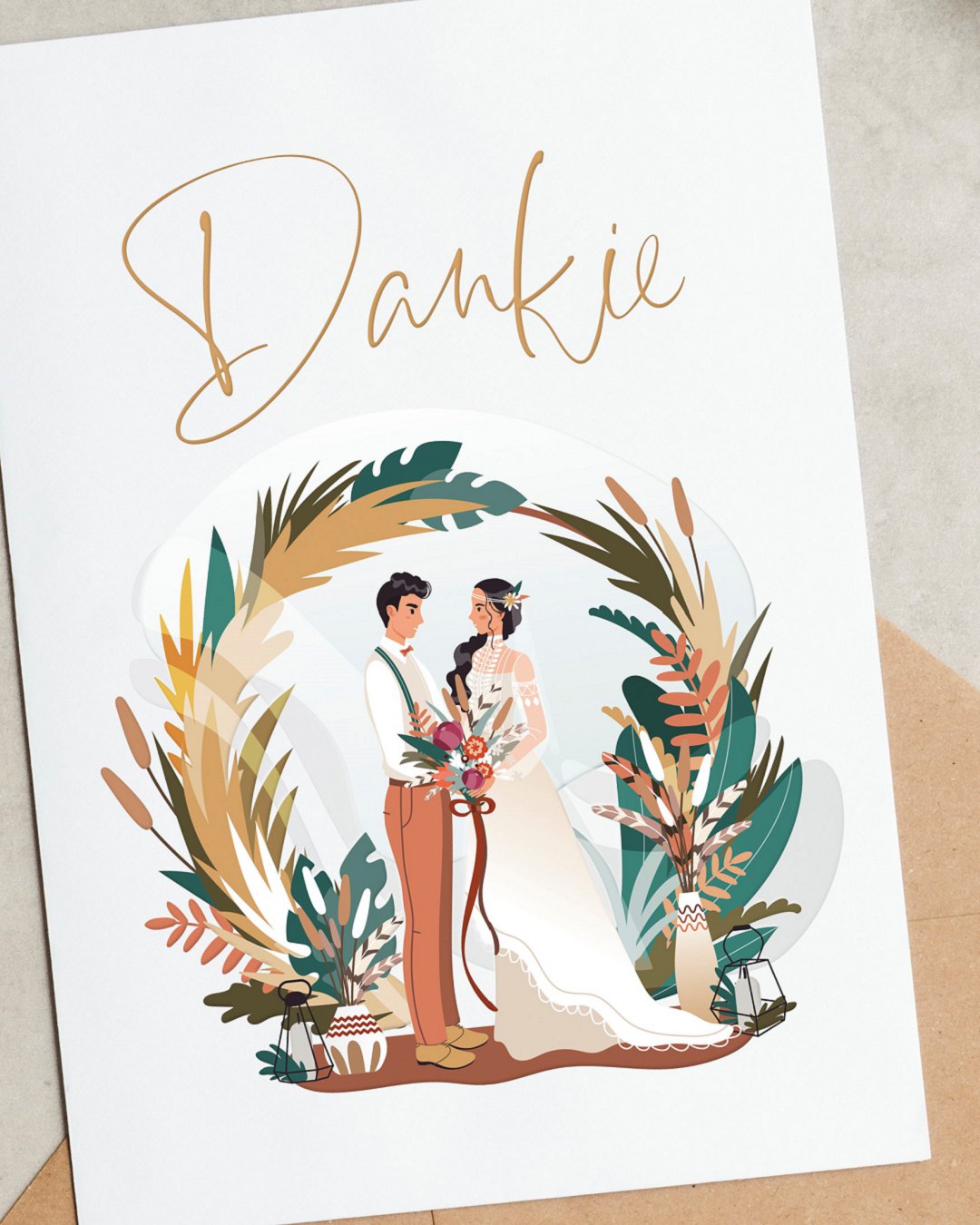Bacht Design het werklik deur deur ʼn gedetailleerde illustrasie en ʼn geskikte kleurskema, pragtig die tema na vore gebring in die boheemse dankie kaartjie. ʼn Dankie kaartjie is ʼn pragtige gebaar wat mooi kan inskakel by jou trou tema en skryfbehoeftes. Dit is ook ʼn persoonlike element wat jy by jou gaste se dankie-geskenkie kan voeg.