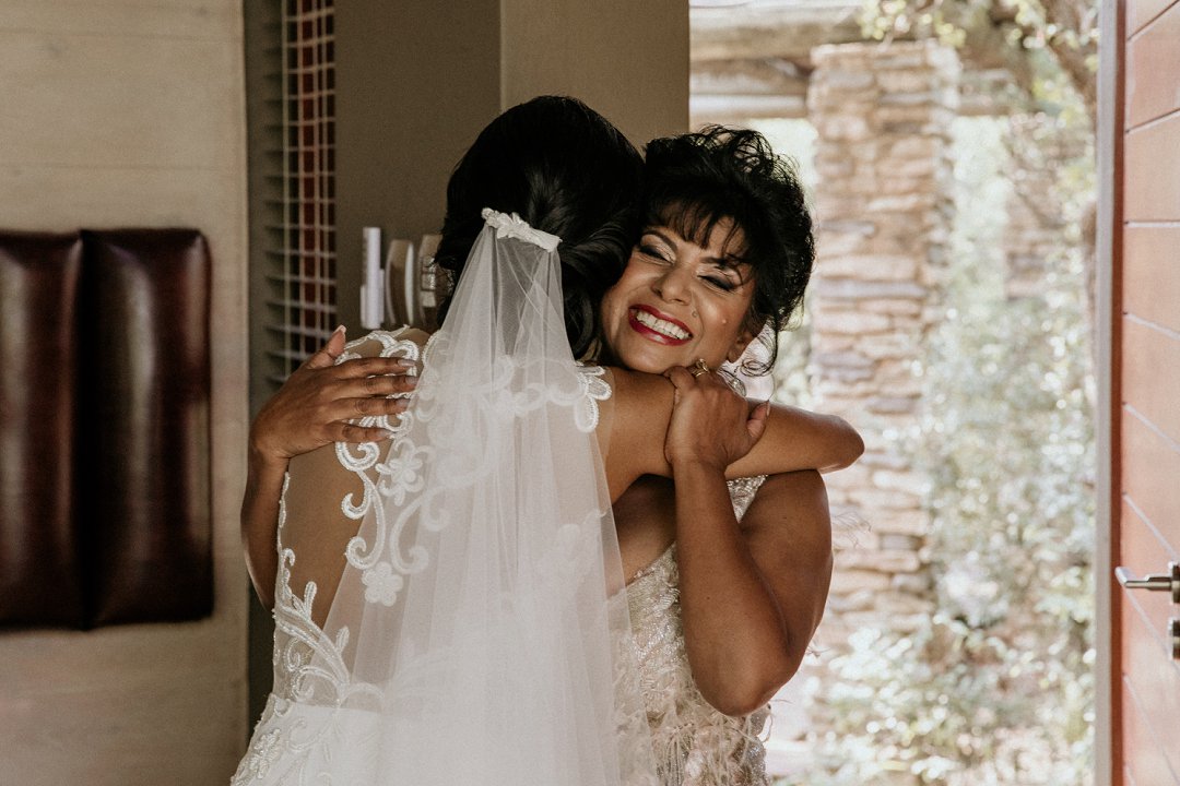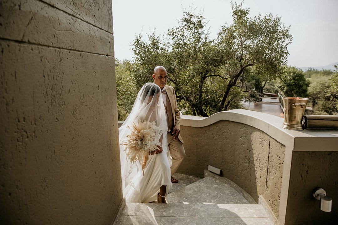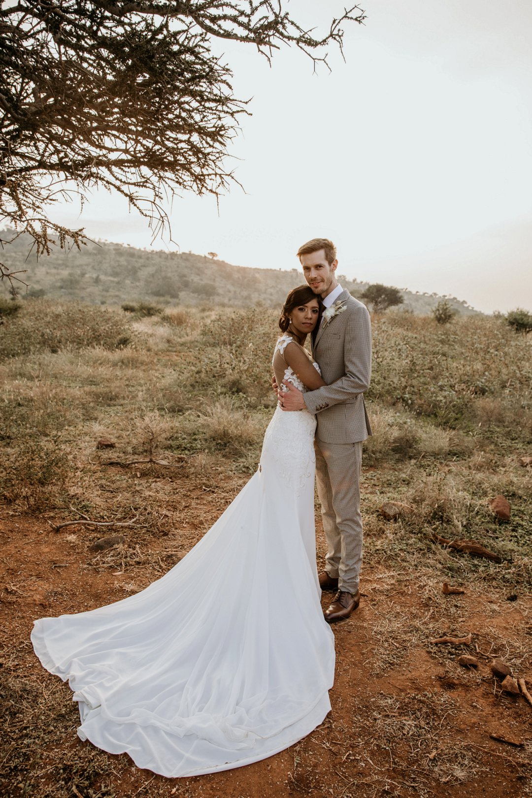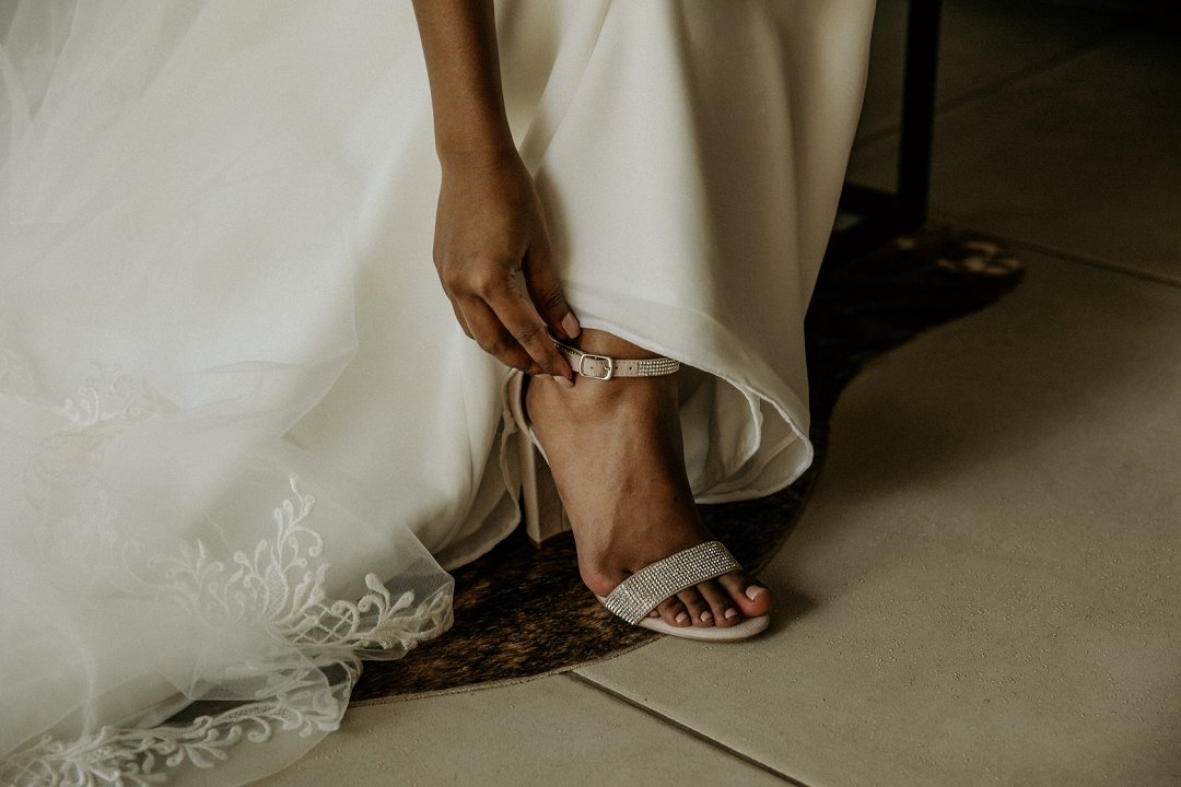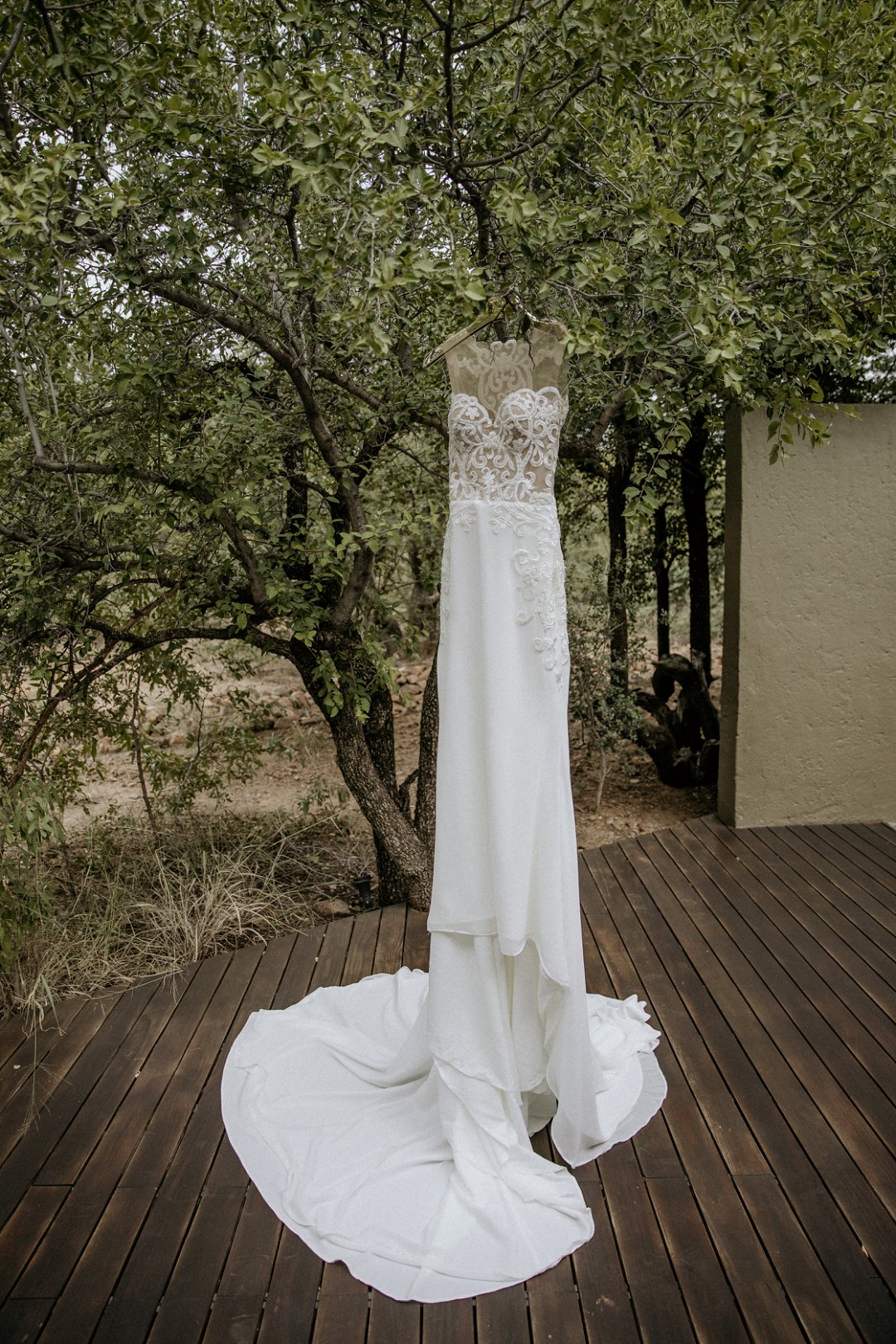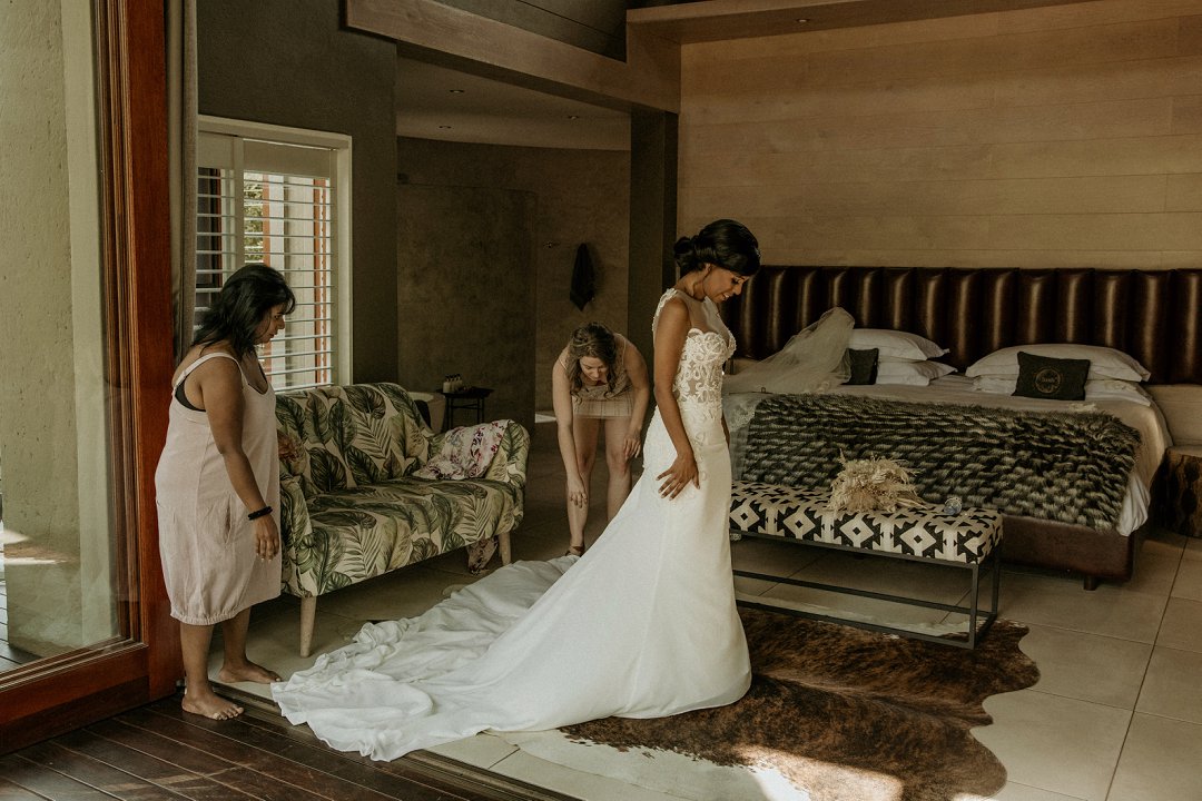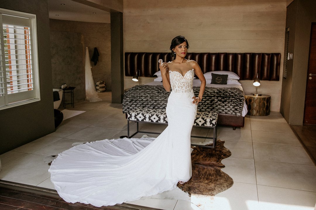 Alhoewel dit ʼn klein troue was, wou ek as die bruid steeds glansryk lyk en voel. Ek wou nie ʼn rok hê wat sou wegneem van die natuurlike skoonheid van die lodge of die omgewing nie, maar ek wou nogsteeds uitstaan en Vonvé het die perfekte rok vir my gehad.