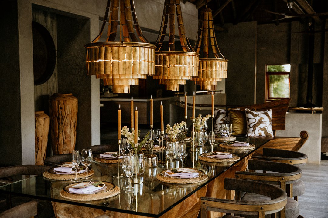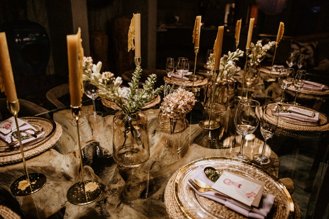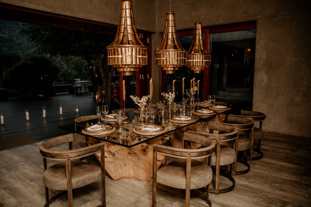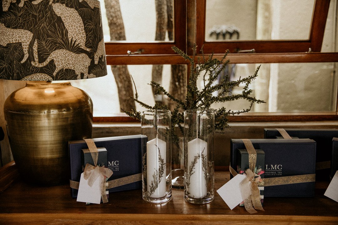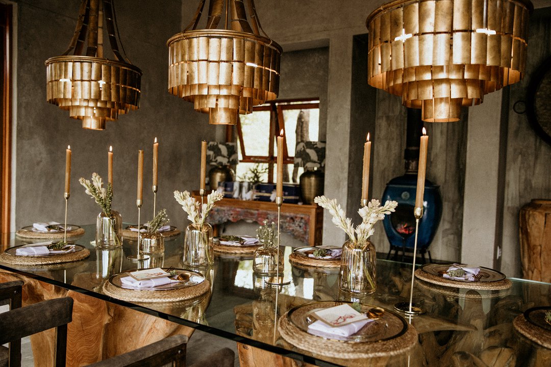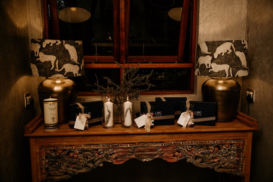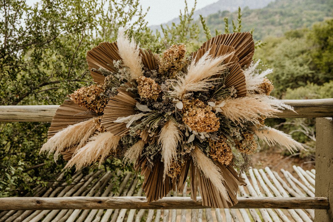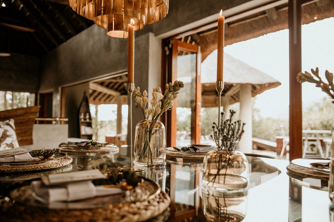 Ons het van die boho-tema gehou, maar wou getrou bly aan die voorkoms van die lodge en ons troue in die African Bush. Ek sou dus sê dat ons dekor ʼn samevoeging van die twee style was.