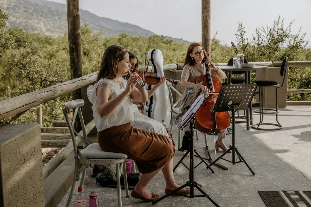 Alhoewel dit ʼn intieme troudag was, het die paartjie steeds gesorg vir top gehalte vermaak. Gracenote Music, ʼn stryk-trio, het musiek voor die seremonie en tydens die kanapees gespeel.
