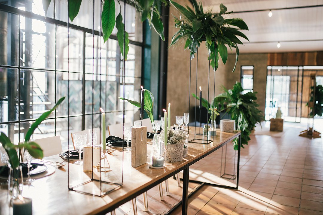 Hierdie Industriële Minimalistiese gestilleerde fotosessie wys vir ons hoe belangrik dit is dat jou trou venue keuse en jou ideale trou konsep by mekaar pas. Wanneer mens na venue opsies kyk, moet mens meer as net die spasie as ʼn heel in ag neem. Kyk na die details van die mure, die vensters, die vloer en alles tussen in. Aan die ou einde wil mens graag gebruik kan maak van die hele spasie, as ook al die elemente daar in. Byvoorbeeld, die verskeie kleure te vind in die spasie kan lei na jou troue se kleur skema inspirasie.