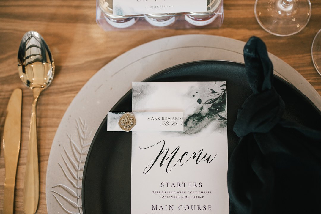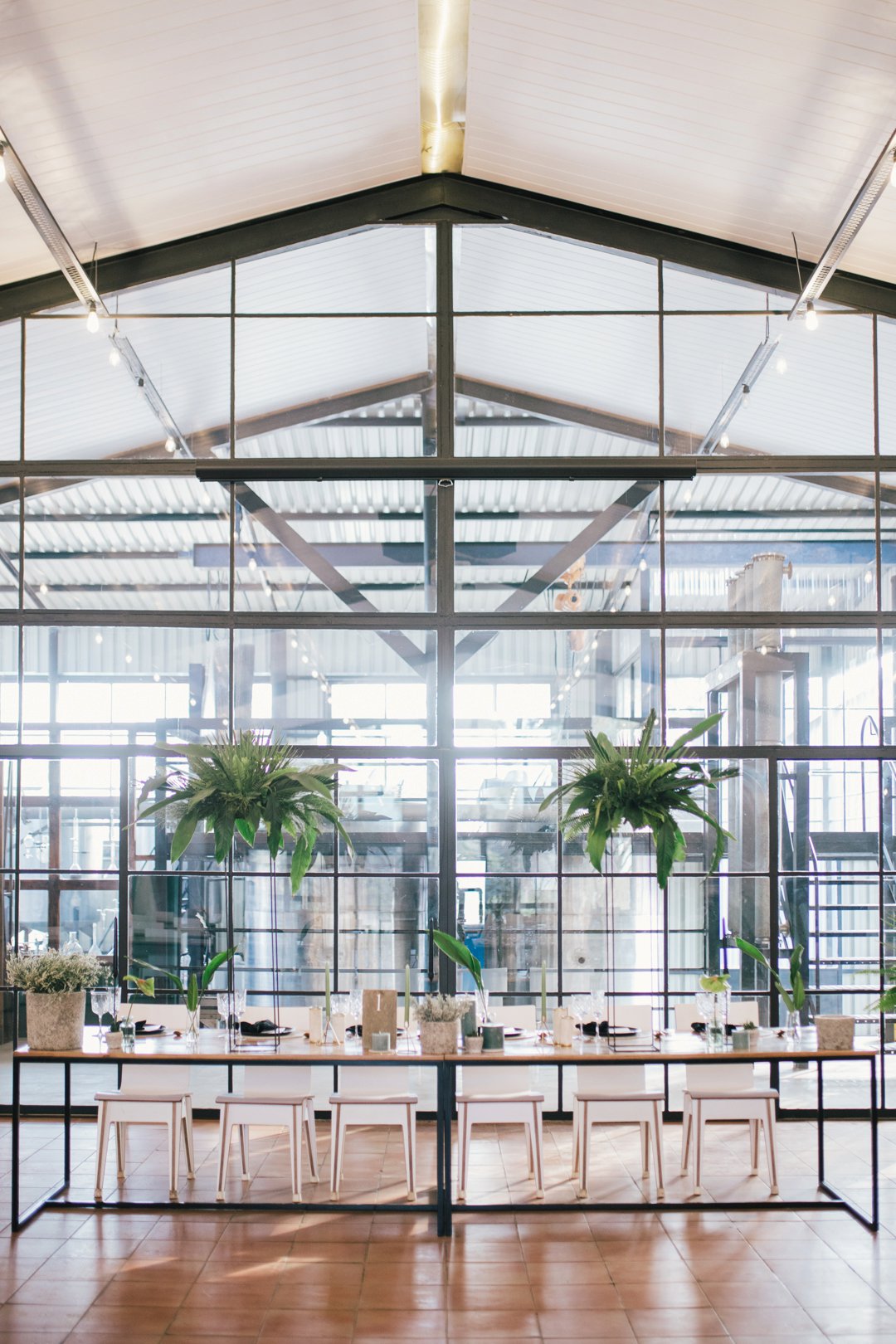 Die minimalisme van die distilleerdery by Rosemary Hill het my geïnspireer om die tafels baie minimalisties te styl, met die fokus op botaniese elemente in plaas daarvan groot tradisionele blomme rangskikkings. Ek het verskillende teksture ingebring wat in die lig ‘n pragtige kontras vertoon het. Die simmetrie van die vensters se swart lyne het die spasie ‘n moderne eienskap gegee wat ek in my stilering wou deurbring.