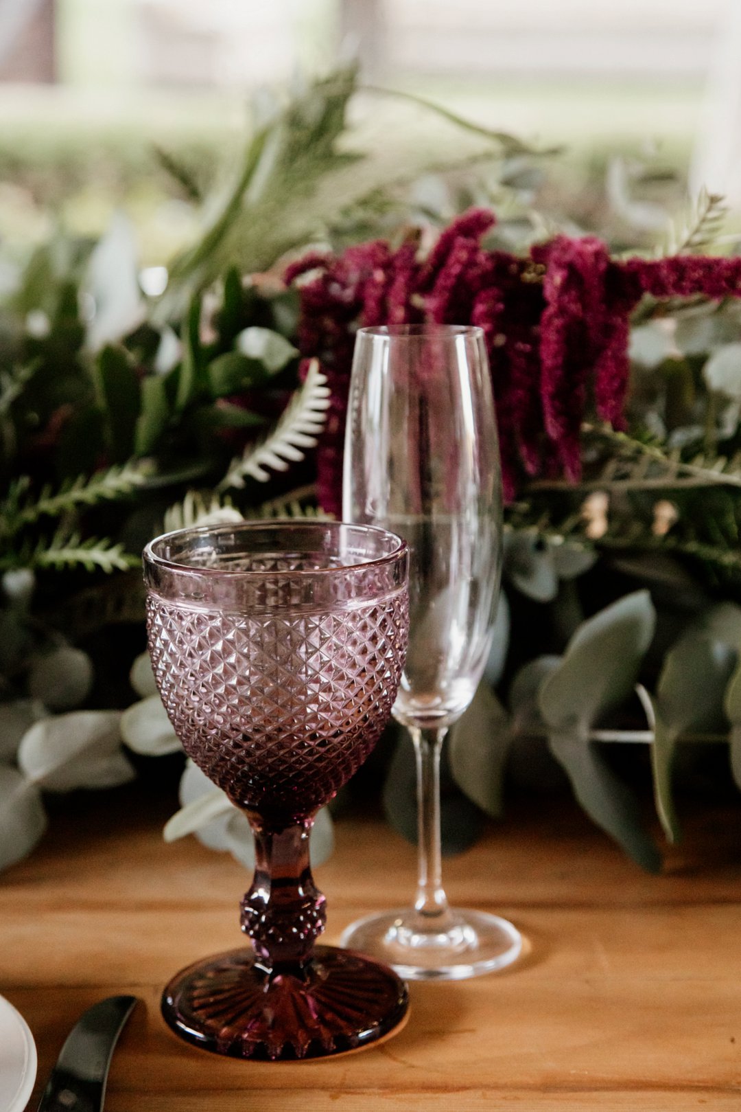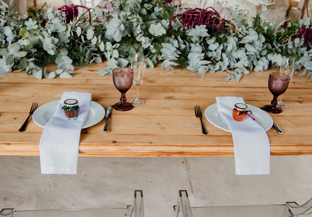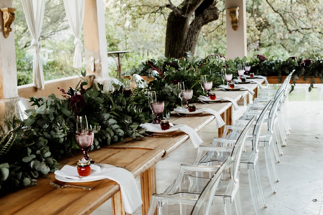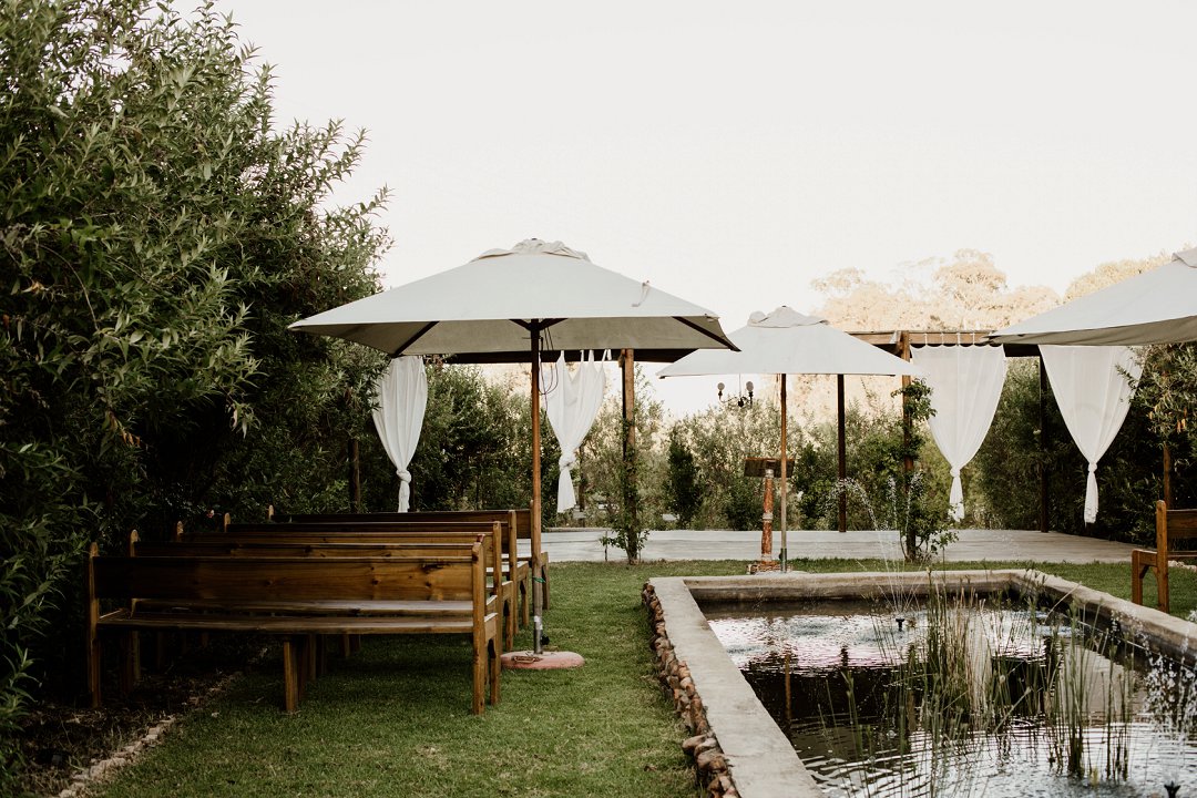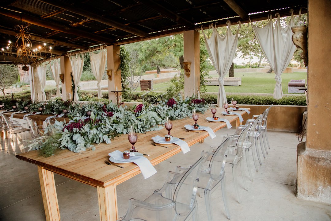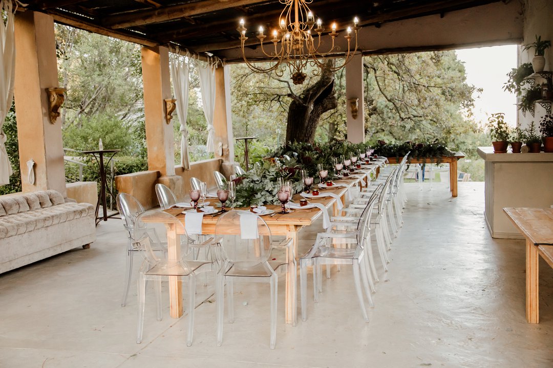 Die paartjie se onthaal was op die stoep wat uitkyk oor die rustige plaaslewe wat die trou venue omring. Met die tafel se rou hout tafel en die deurskynende stoele skep ʼn moderne gevoel. Dit pas so mooi in met die paartjie se Groen tema en tikseltjies Marsala kleure wat deur kom. Die paartjie het self hul trou blomme en dekor gedoen en ons dink dit lyk baie mooi gedoen!
