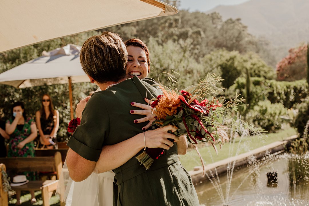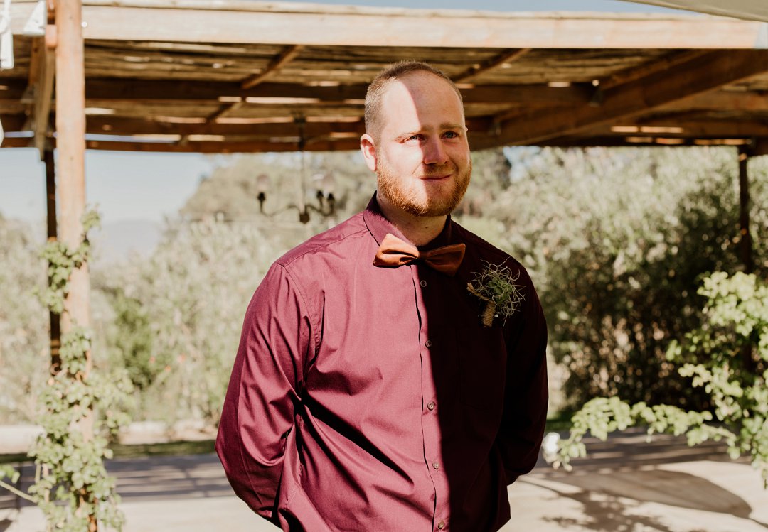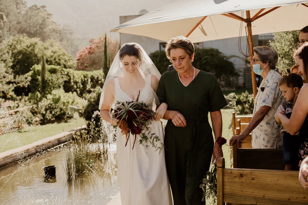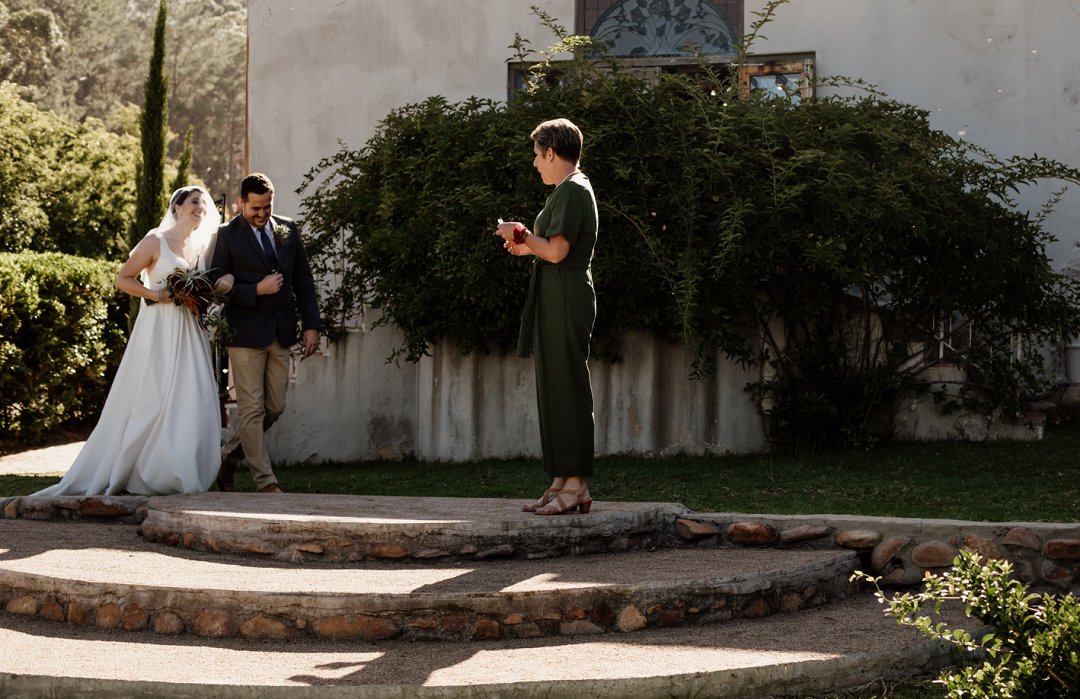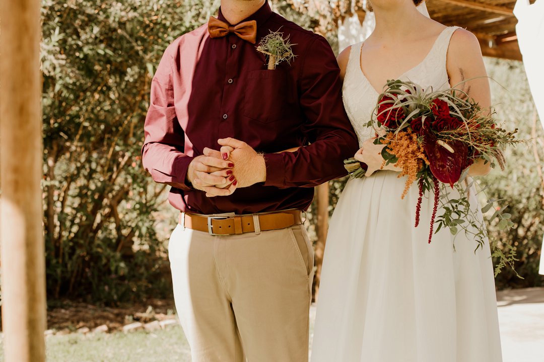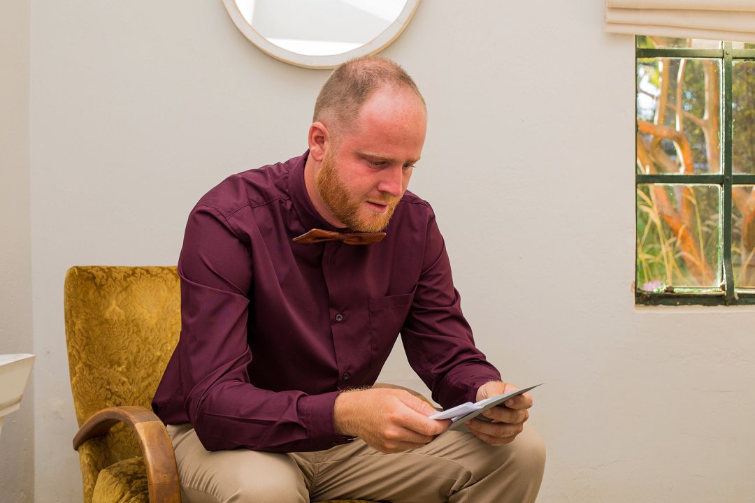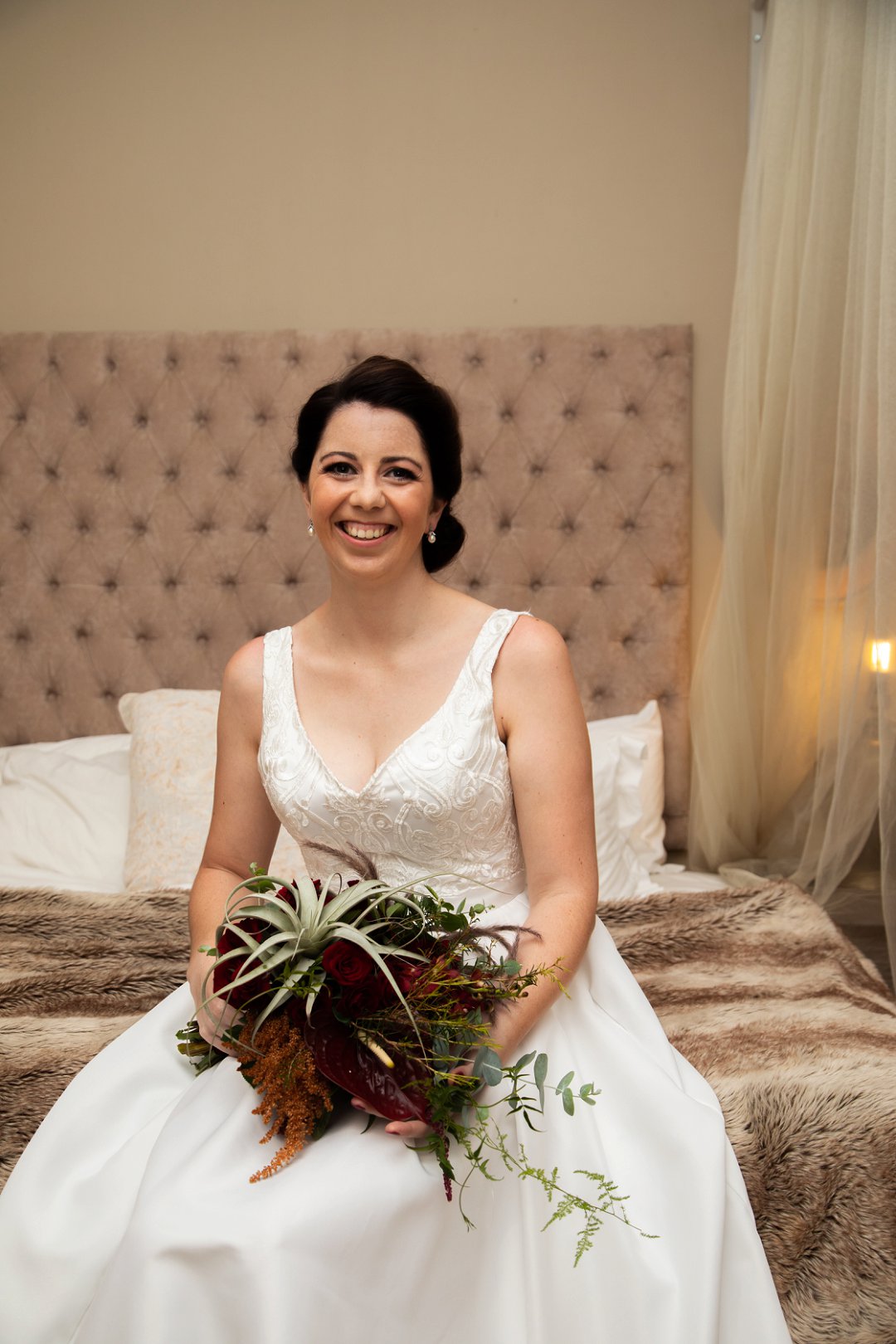 Die paartjie se onthaal was op die stoep wat uitkyk oor die rustige plaaslewe wat die trou venue omring. Met die tafel se rou hout tafel en die deurskynende stoele skep ʼn moderne gevoel. Dit pas so mooi in met die paartjie se Groen tema en tikseltjies Marsala kleure wat deur kom. Die paartjie het self hul trou blomme en dekor gedoen en ons dink dit lyk baie mooi gedoen!