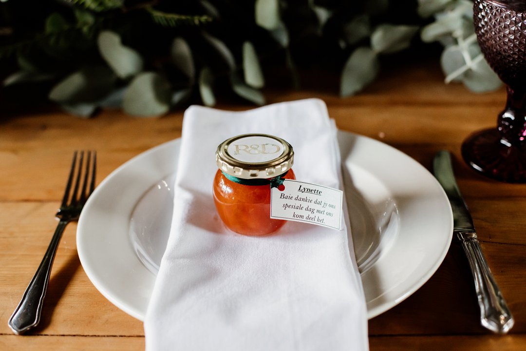 Gaste geskenkies was tuisgemaakte konfyt gewees wat Rézette se Ouma gemaak het. Dit gee ook daardie persoonlike element aan die troudag.