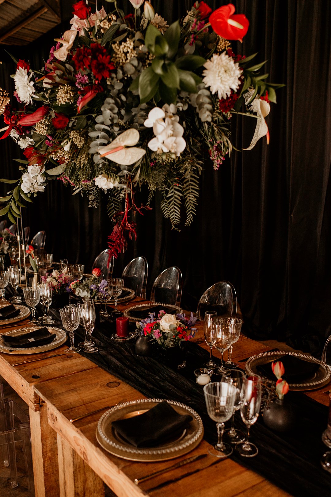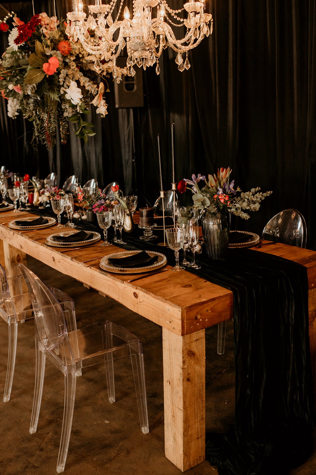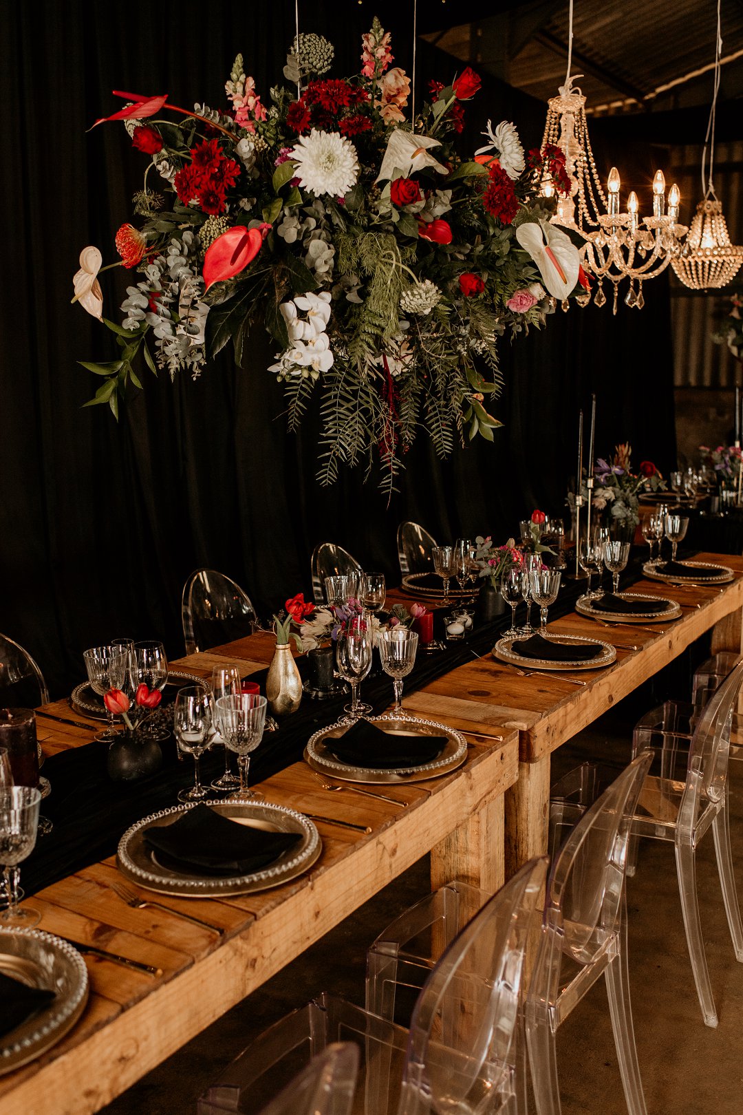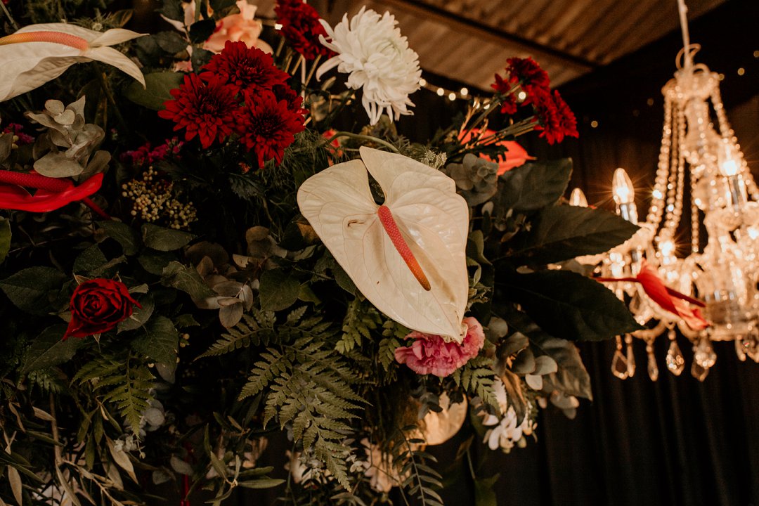 Ons tema was romanties en kleurskema was Swart, Roosgoud en Boergondië. Die idee vir troudekor het ek op ʼn foto gesien en gesê dit is presies wat ek wil hê! Ons het rondom die foto beplan en dit het mooier gelyk as wat ek ooit kon dink! Ons het vir al die gaste gevra om Swart formeel aan te trek na die troue en die fotos vertoon so mooi.
