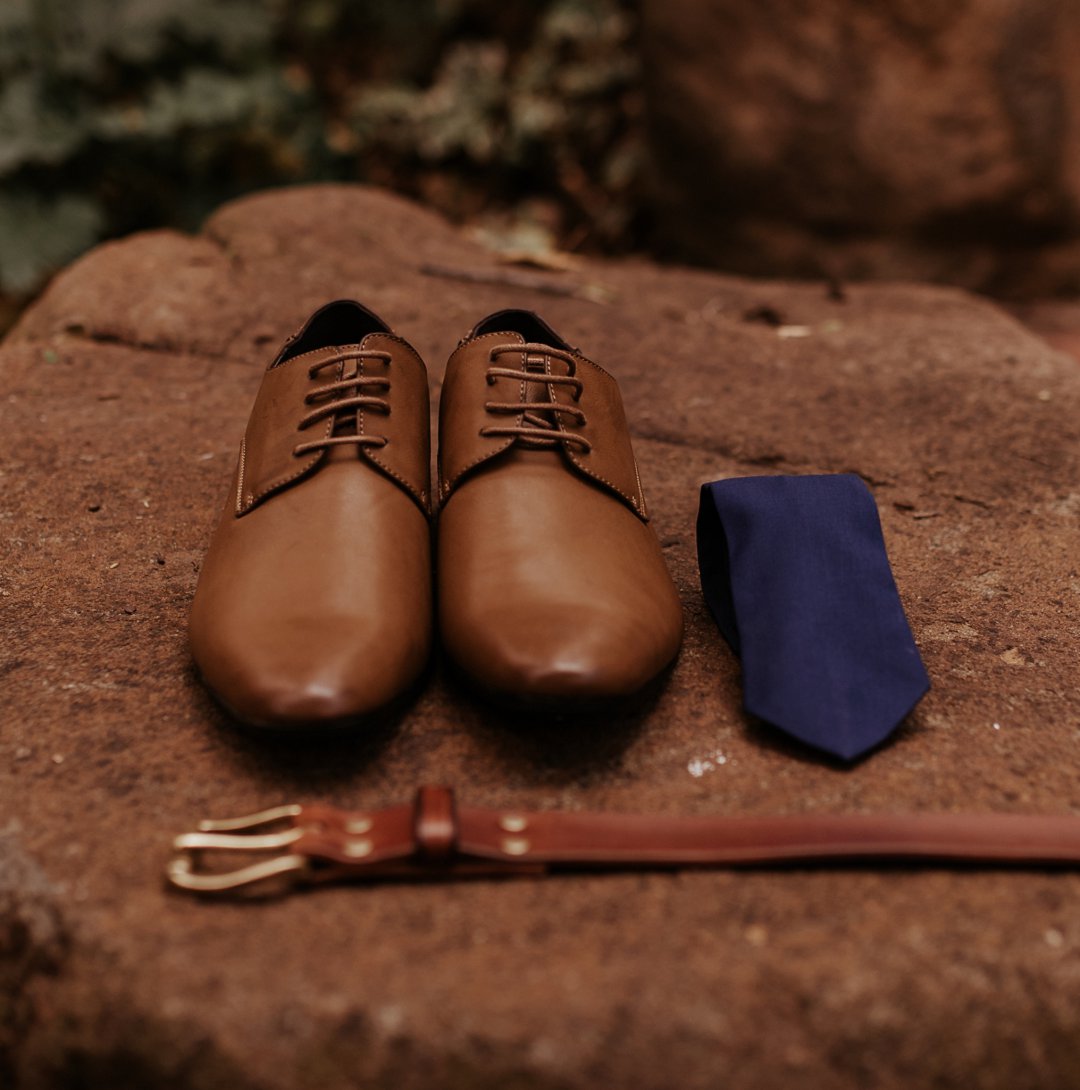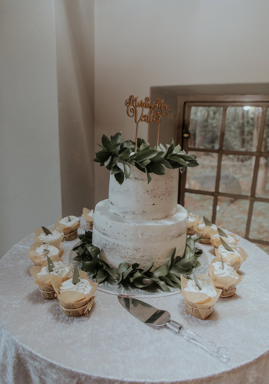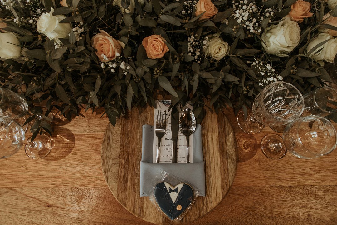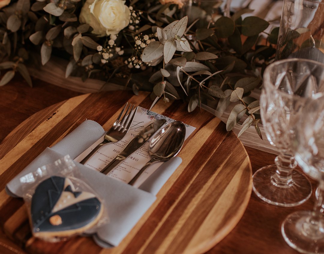 Die paartjie het besluit op ʼn donker groen, ligte appelkoos, vlootblou, en wit kleurskema vir hul selfdoen troue te hê. Hierdie verskillende kleure is so mooi saam en die end resultaat is mooi.