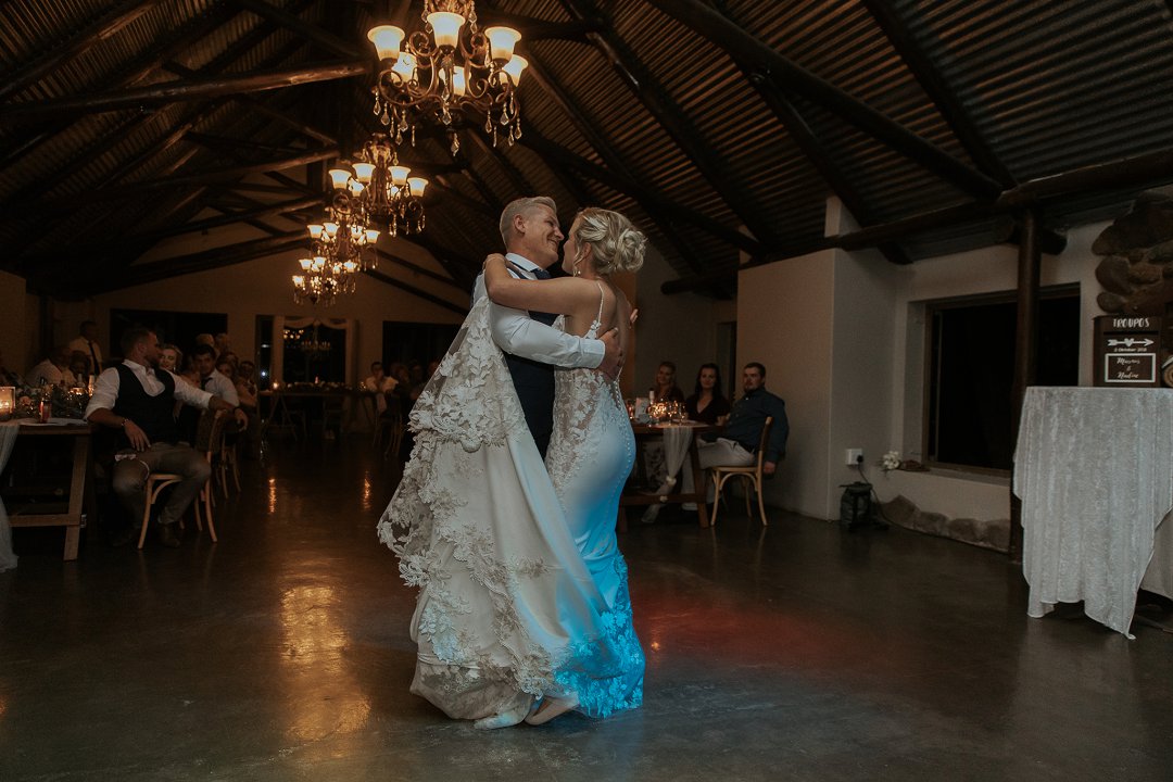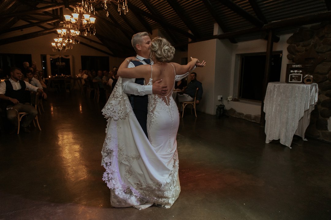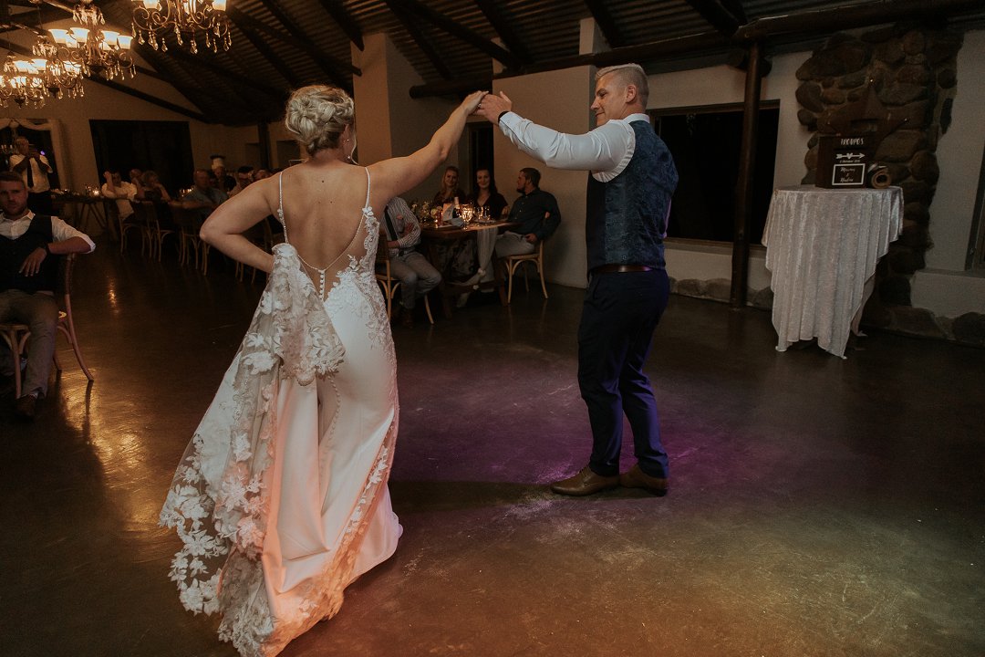 Ja, ons het ʼn eerste dans gehad. Ons het ook letterlik twee aande voor die troue in ons sitkamer probeer oefen, maar dit het nie gewerk nie. Albei van ons het besef om moenie probeer iets doen wat ons nooit sou doen oor die algemeen nie en ons het toe ons normale langarm gedoen. Liedjie: Juan Boucher, Ons Word Een.