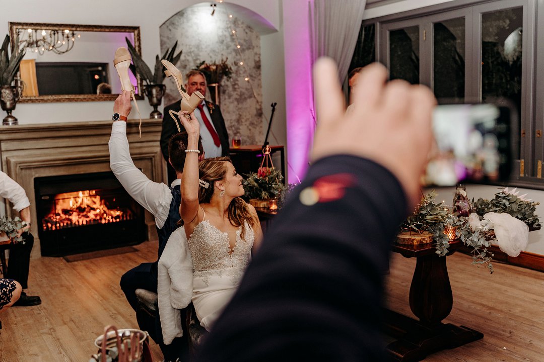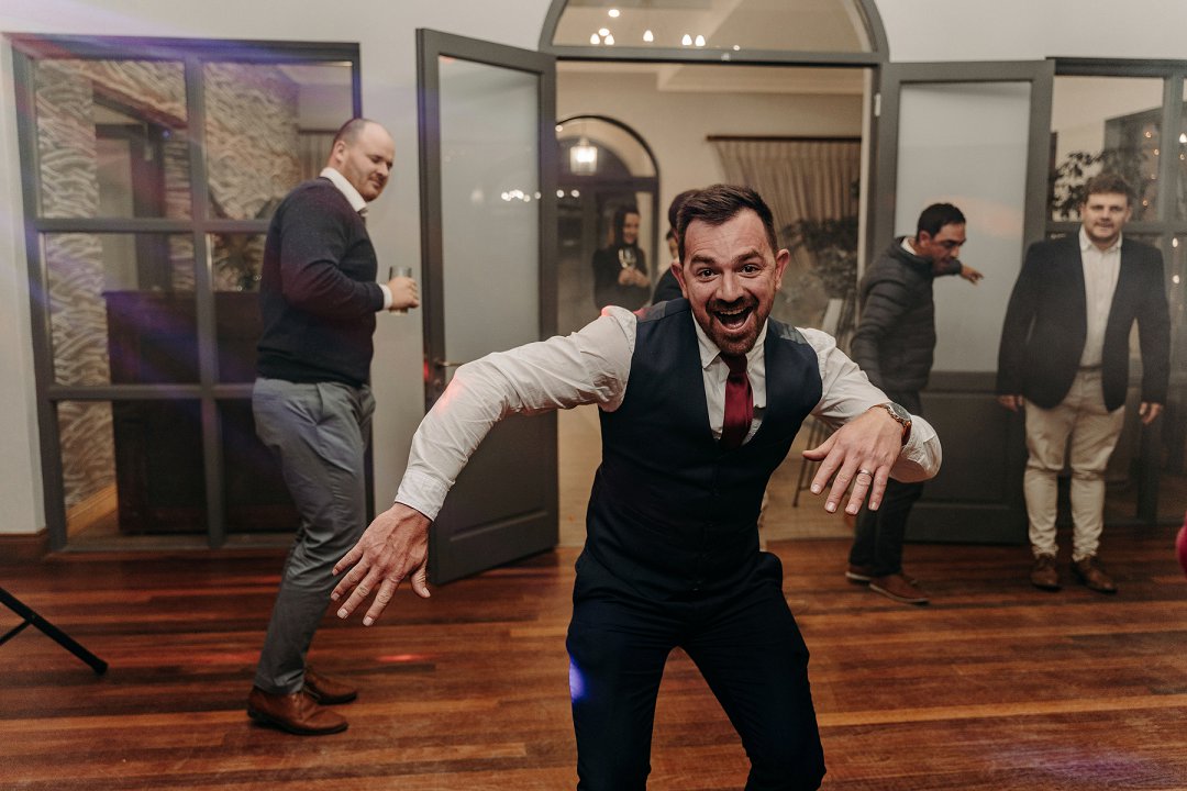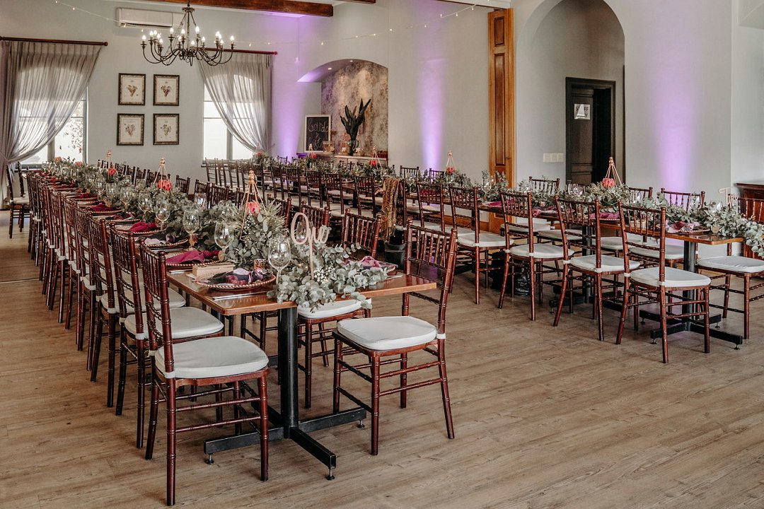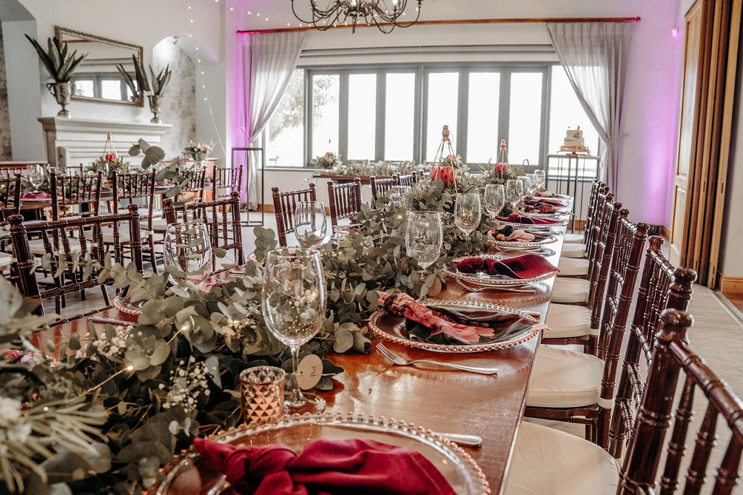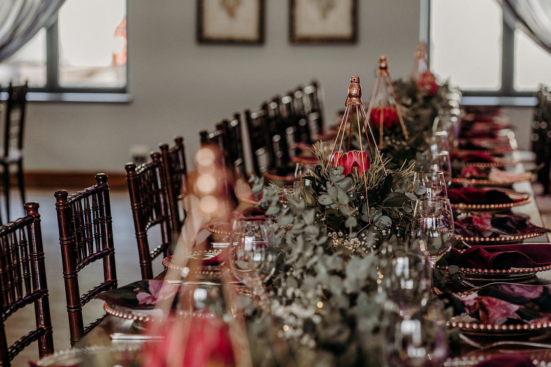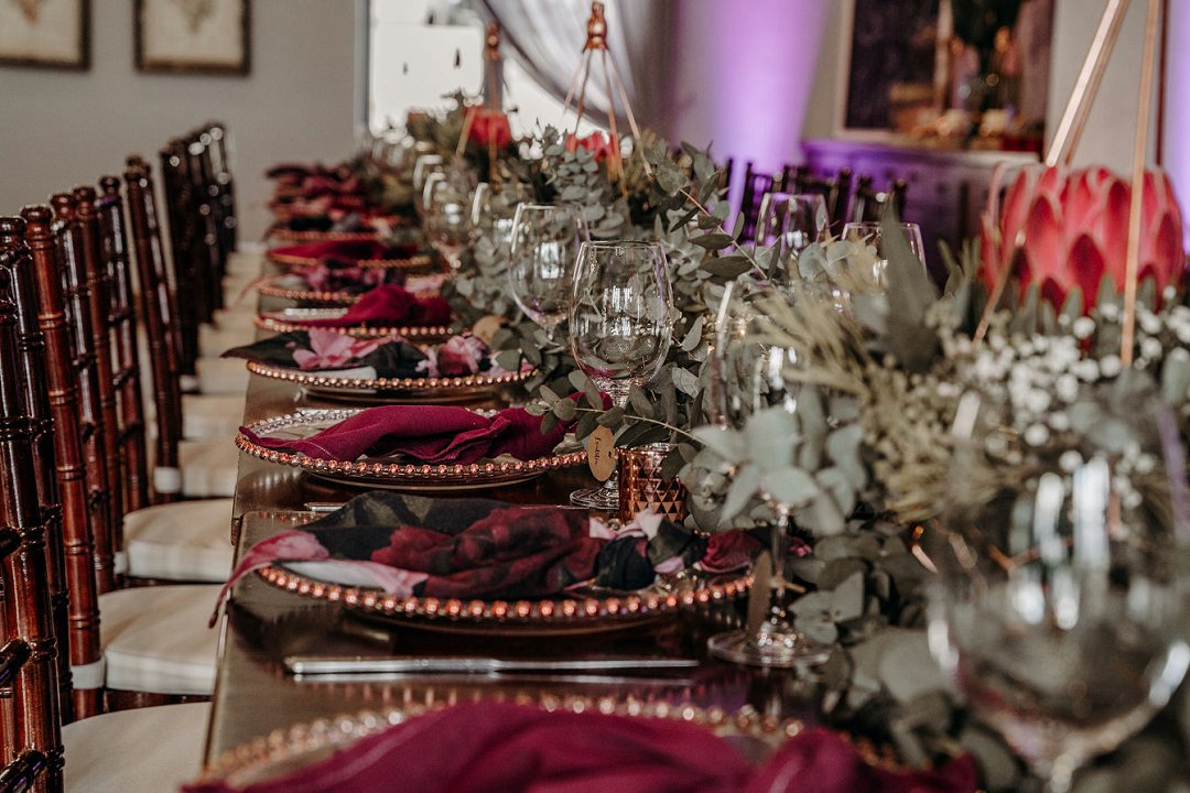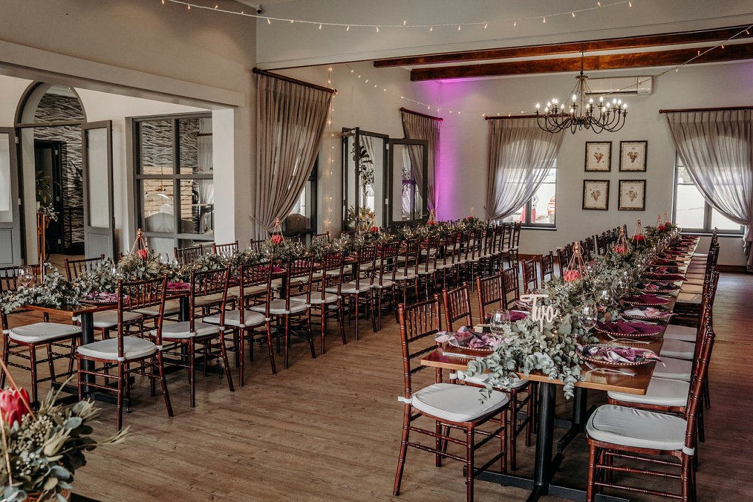 Jy kan sien die gaste het hulself geniet by die onthaal.Ā Å Lieflike kaggelvuur het die onthaal lokaal warm gehou en Å gesellige atmosfeer geskep.Ā Die gebruik van maroen en roosgoud elemente in hul trou dekor het weereens daardie warm gevoel in paartjie se troudag gebring.
