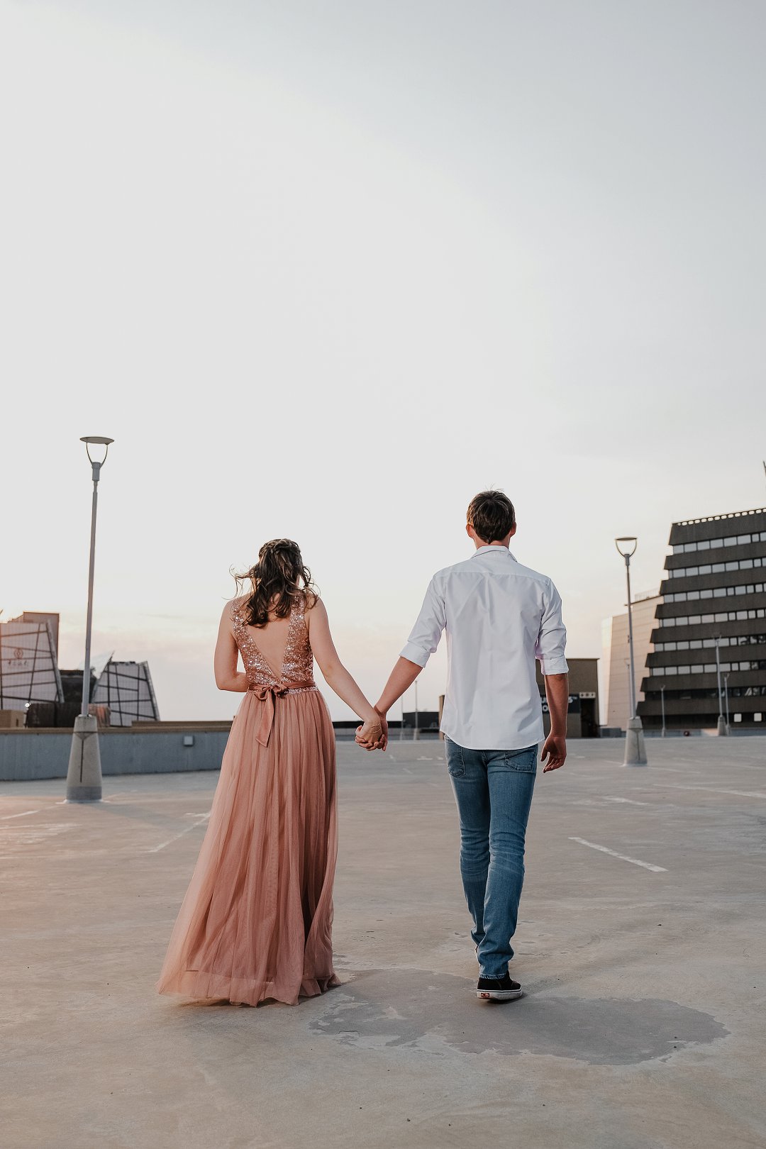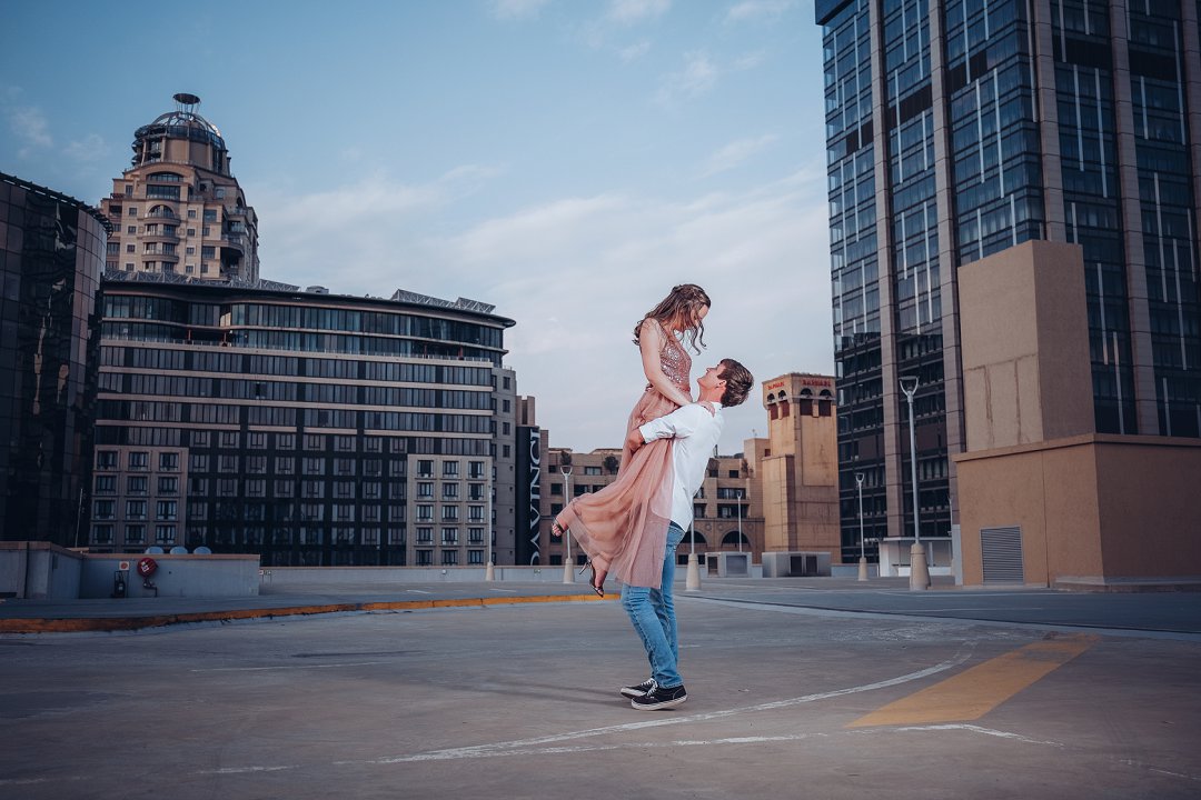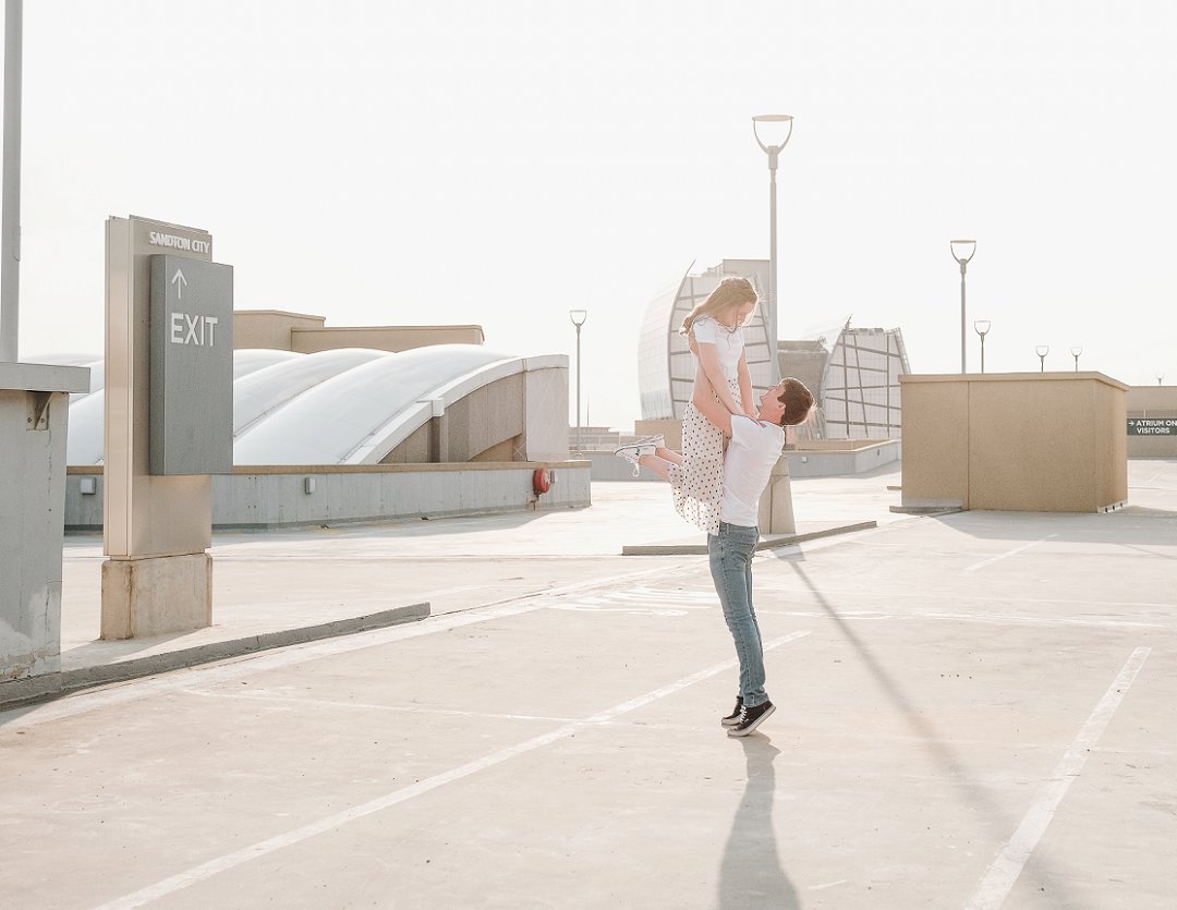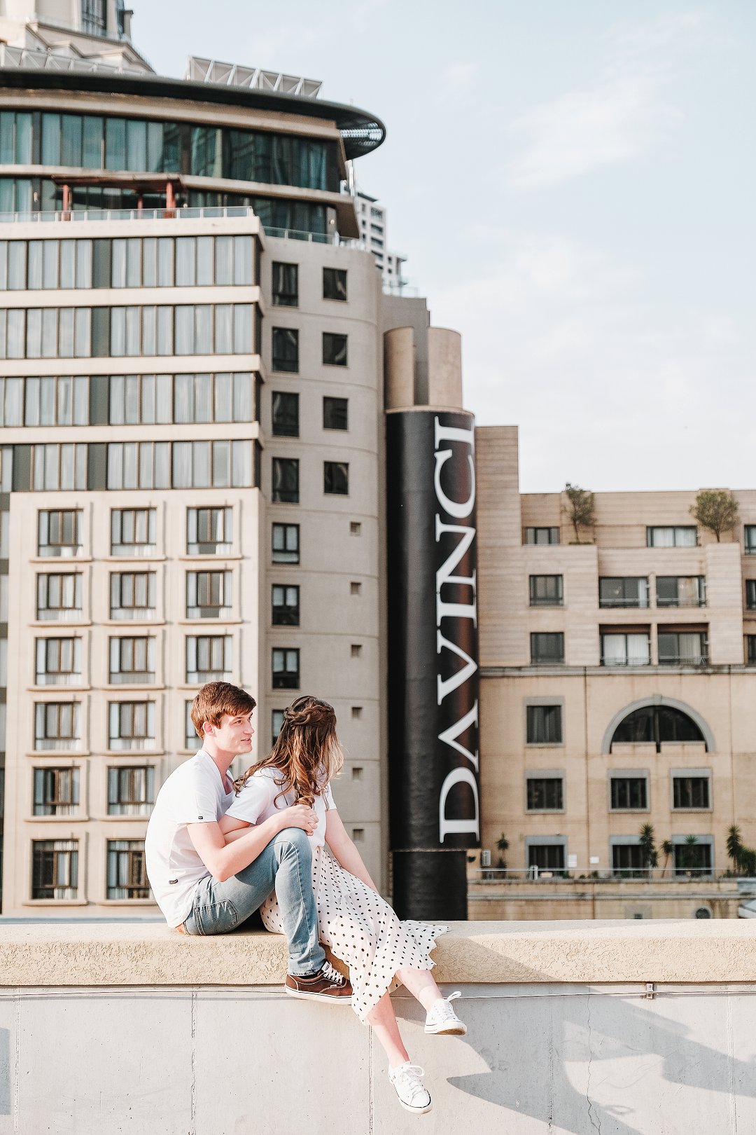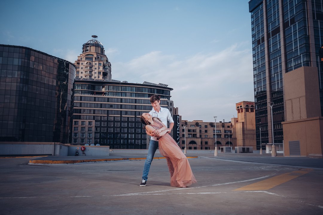 Die tweede deel van Nicole en Ryan se fotosessie was tydens sonsak op ʼn lee parkeerterrein wat jou amper die gevoel gee dat jy bo op die dak van ʼn gebou is. Omring deur die geboue in Nelson Mandela Square in Sandton en die sagte pienk lig van die son wat sak in kontras met die grys en glas geboue in die agtergrond is prentjie mooi.