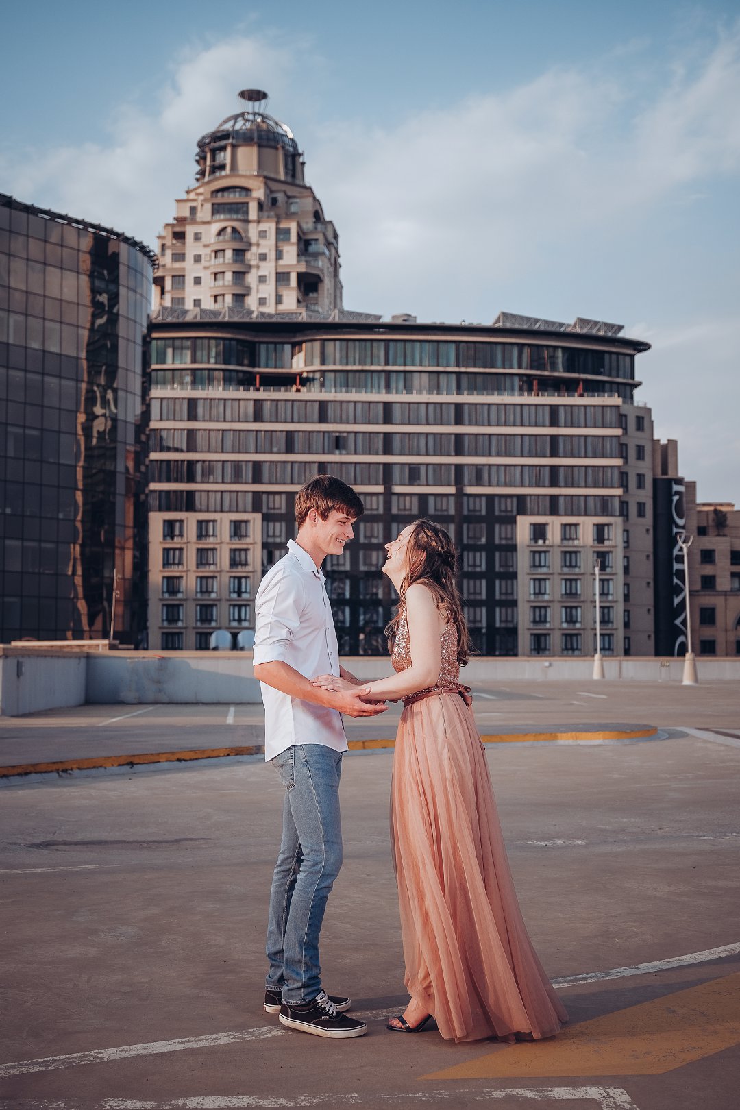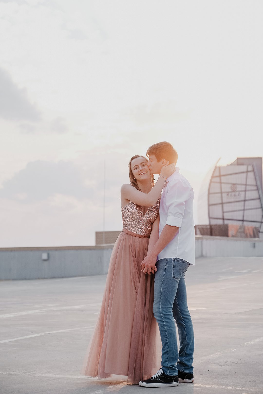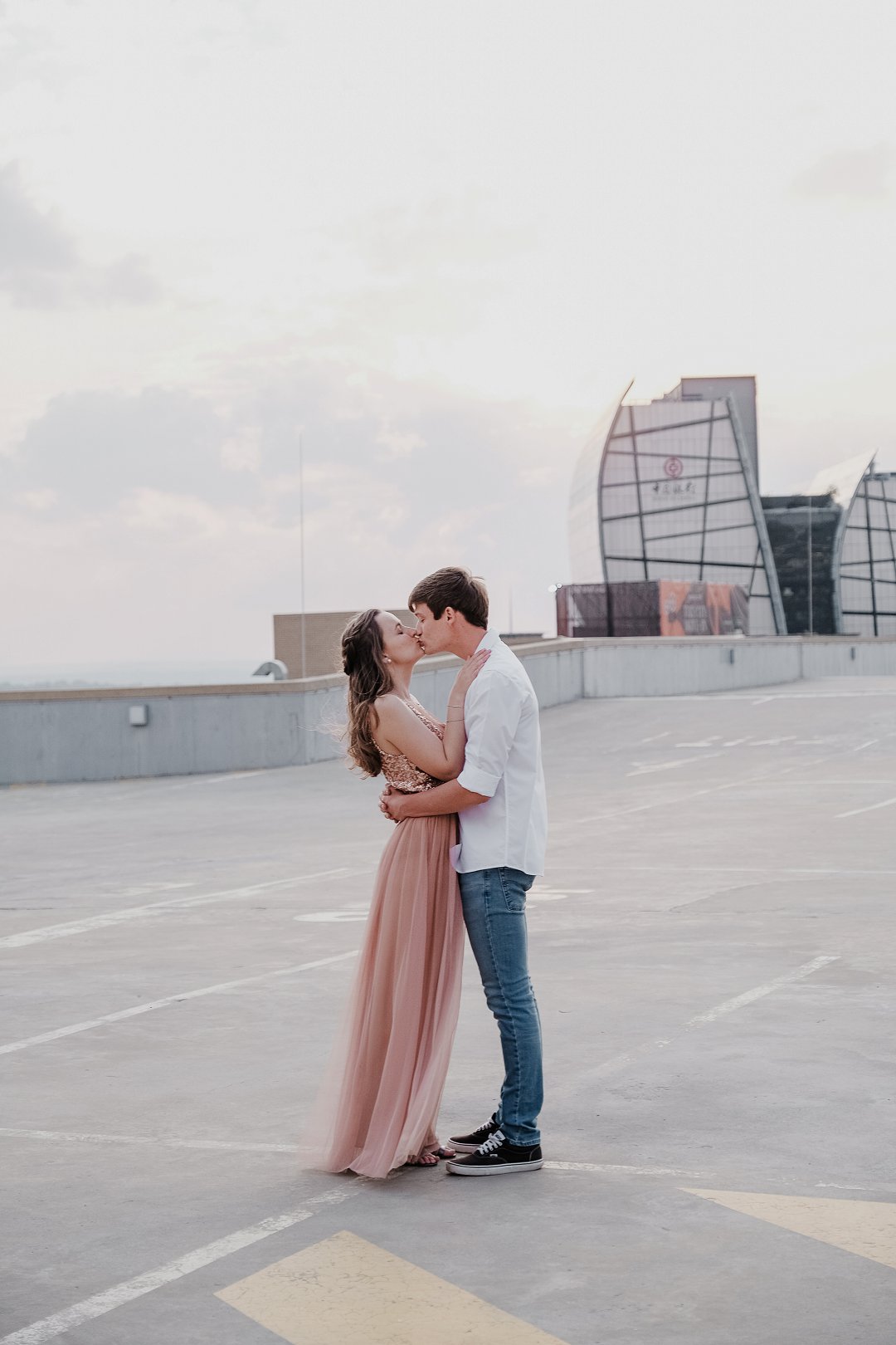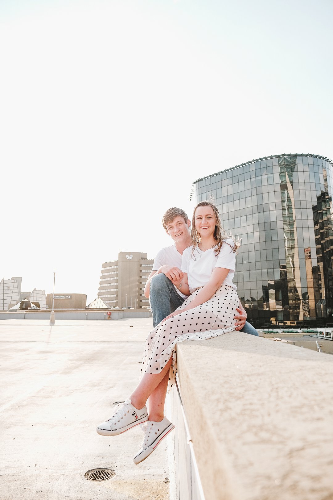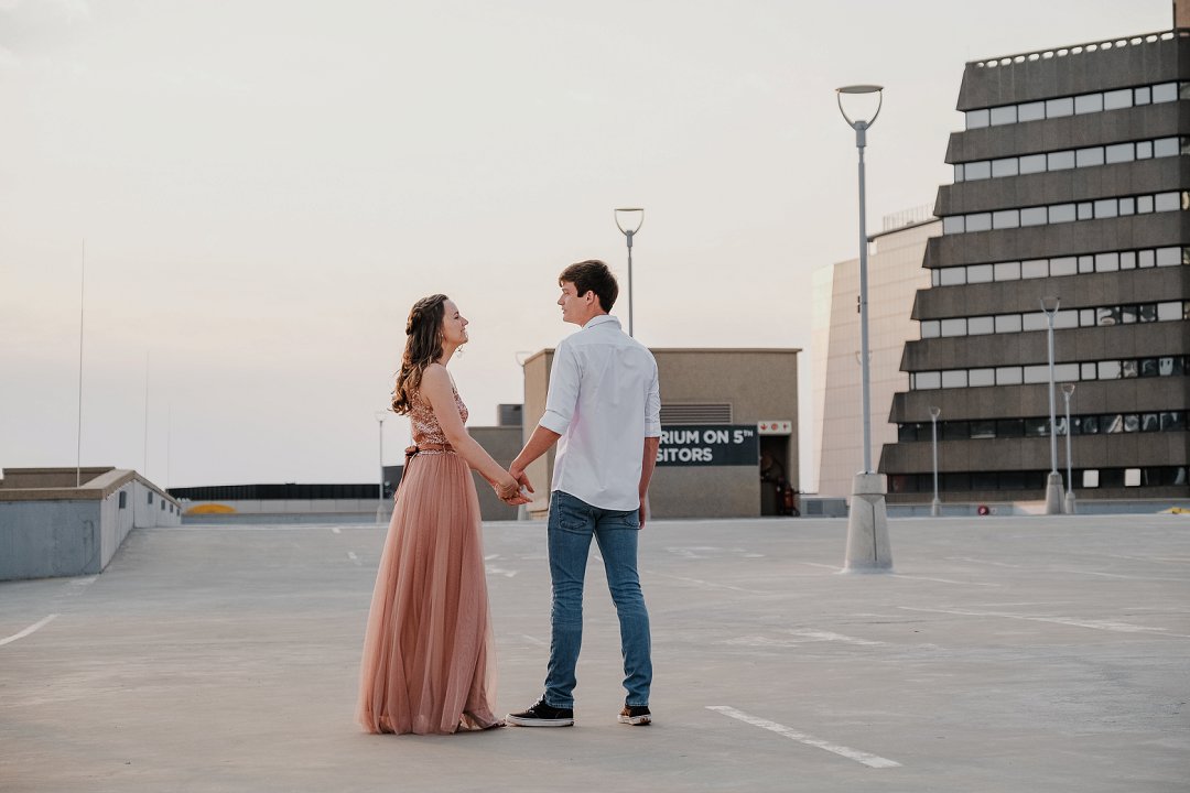 Die tweede deel van Nicole en Ryan se fotosessie was tydens sonsak op ʼn lee parkeerterrein wat jou amper die gevoel gee dat jy bo op die dak van ʼn gebou is. Omring deur die geboue in Nelson Mandela Square in Sandton en die sagte pienk lig van die son wat sak in kontras met die grys en glas geboue in die agtergrond is prentjie mooi.