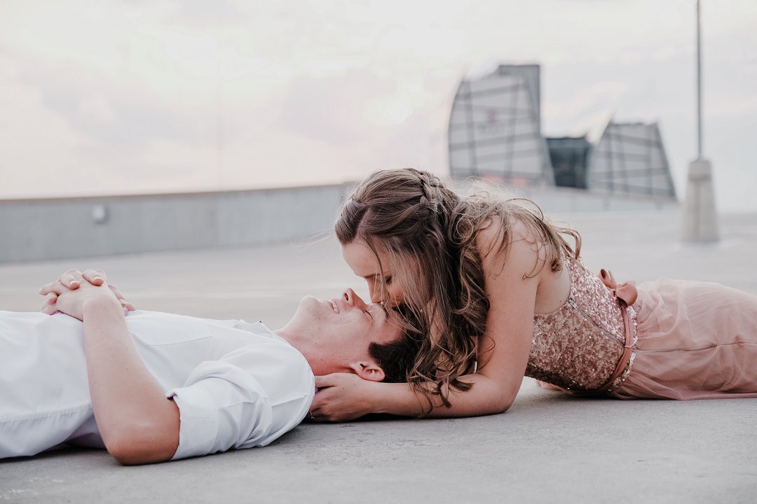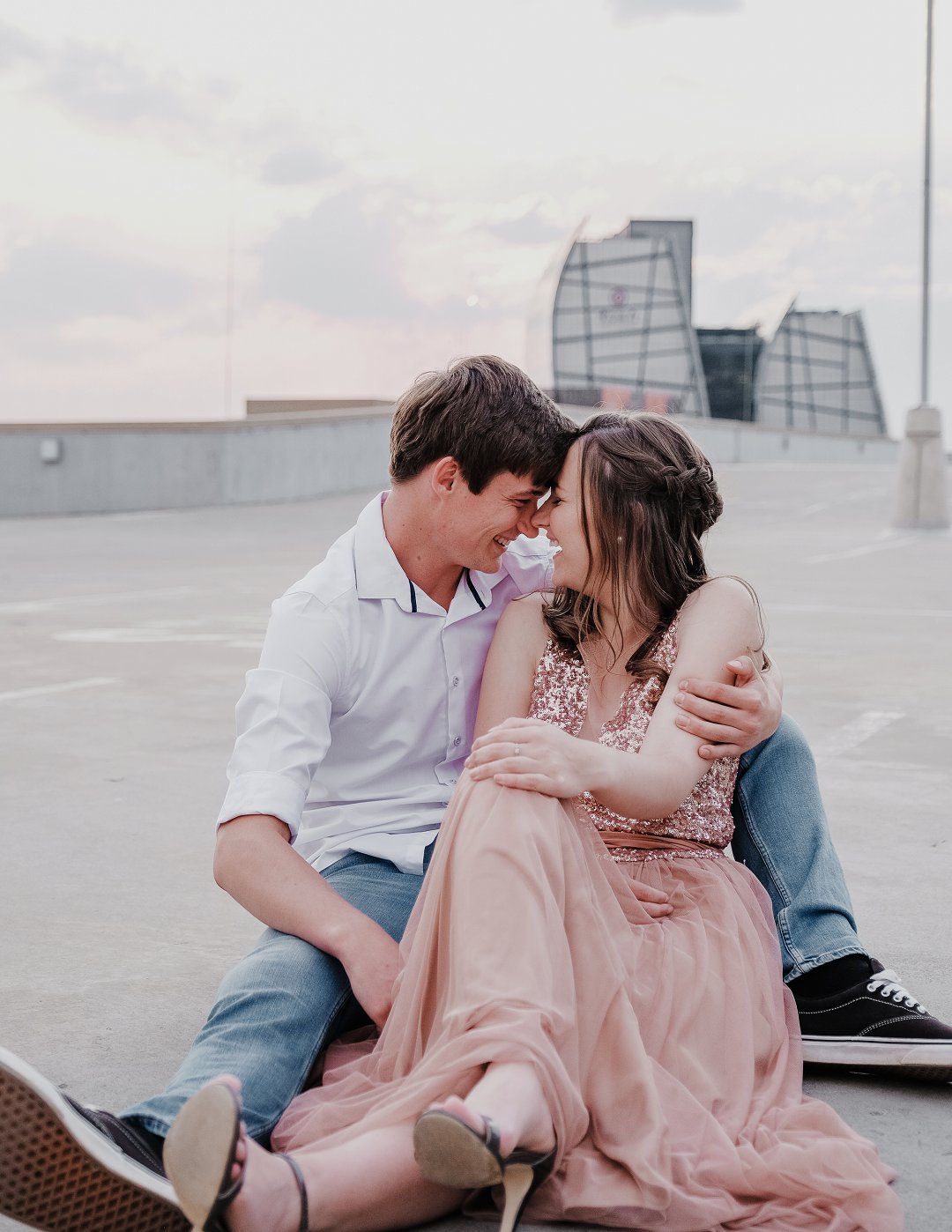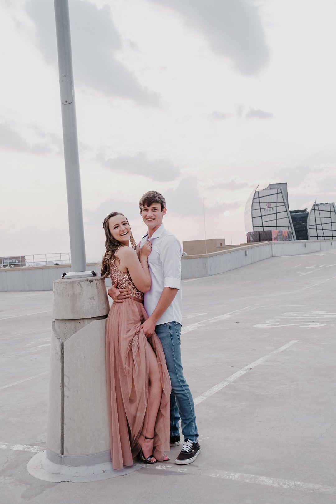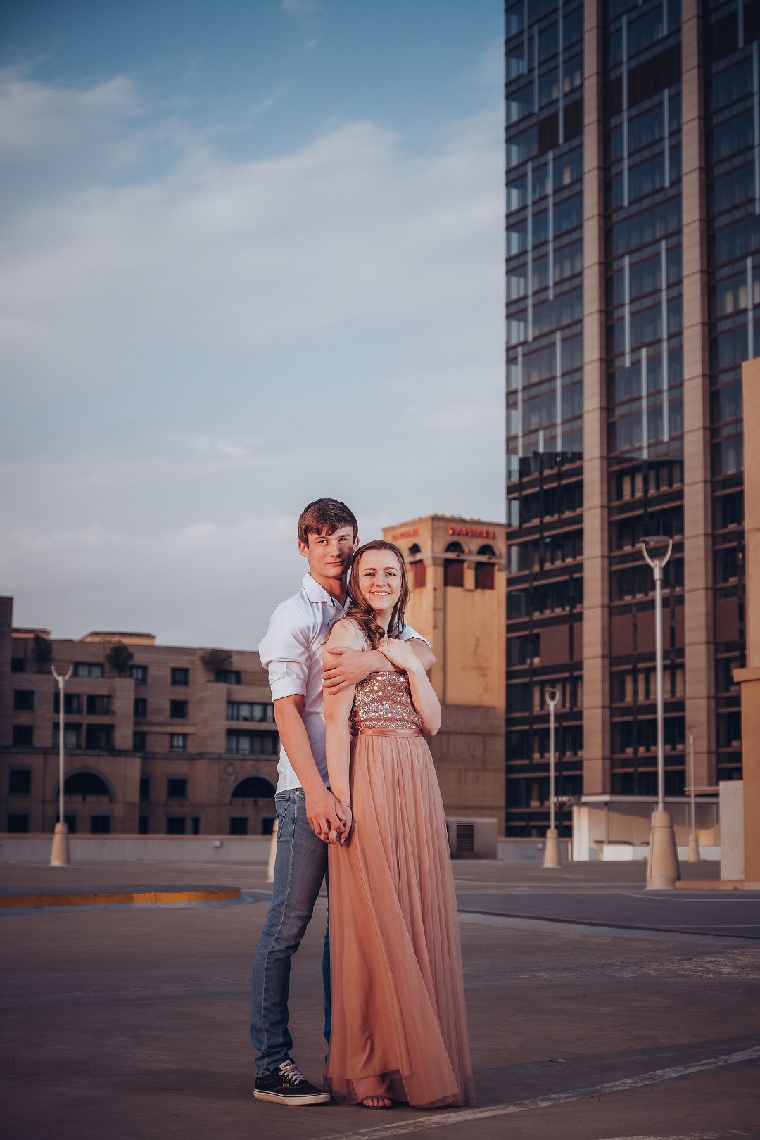 Die tweede deel van Nicole en Ryan se fotosessie was tydens sonsak op ʼn lee parkeerterrein wat jou amper die gevoel gee dat jy bo op die dak van ʼn gebou is. Omring deur die geboue in Nelson Mandela Square in Sandton en die sagte pienk lig van die son wat sak in kontras met die grys en glas geboue in die agtergrond is prentjie mooi.