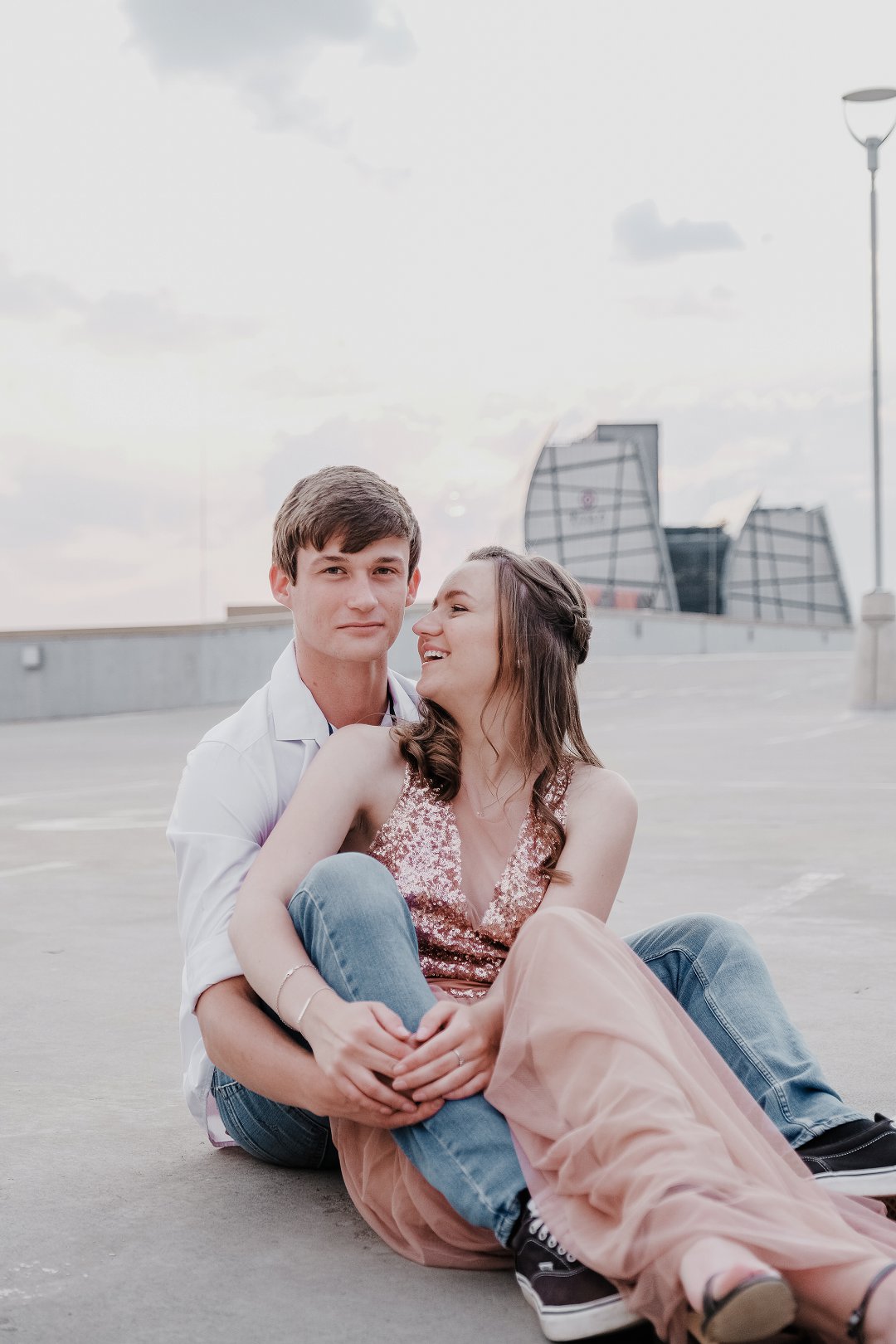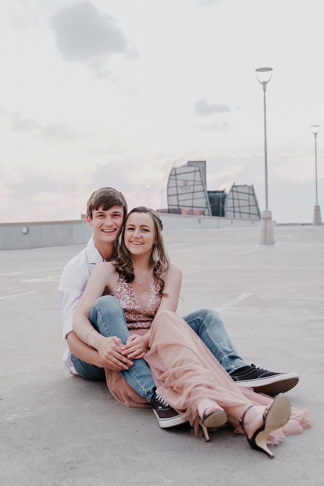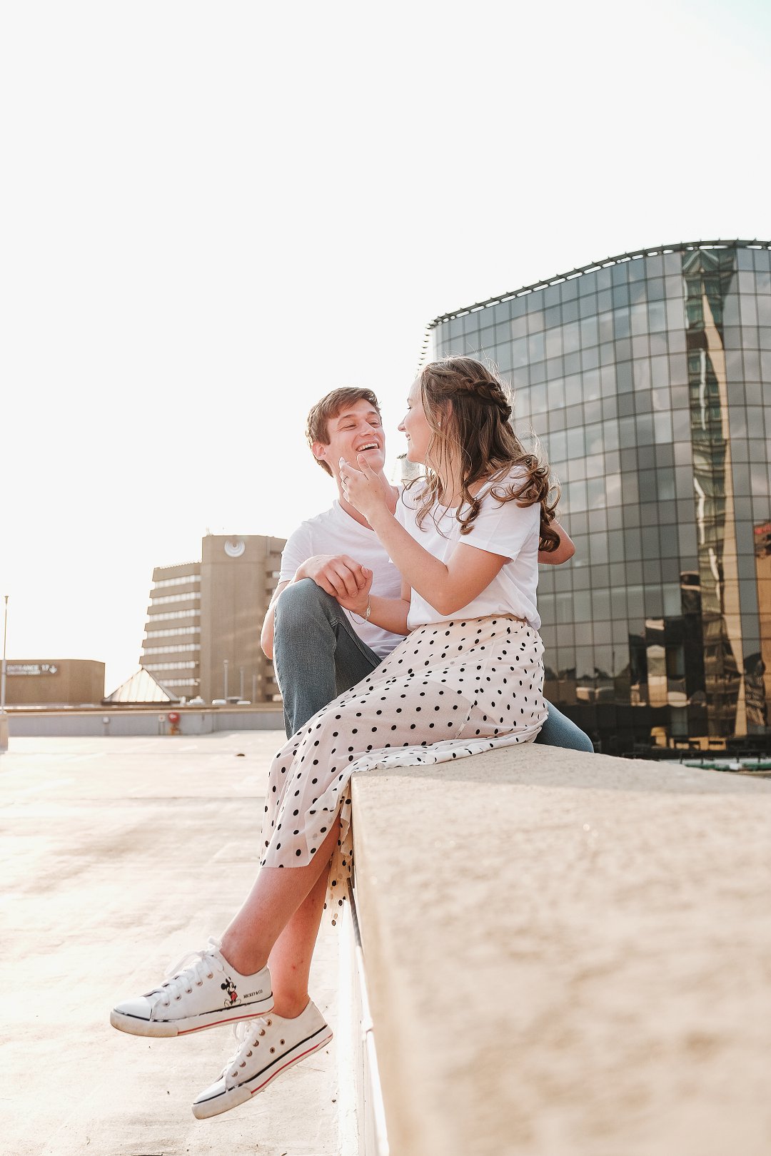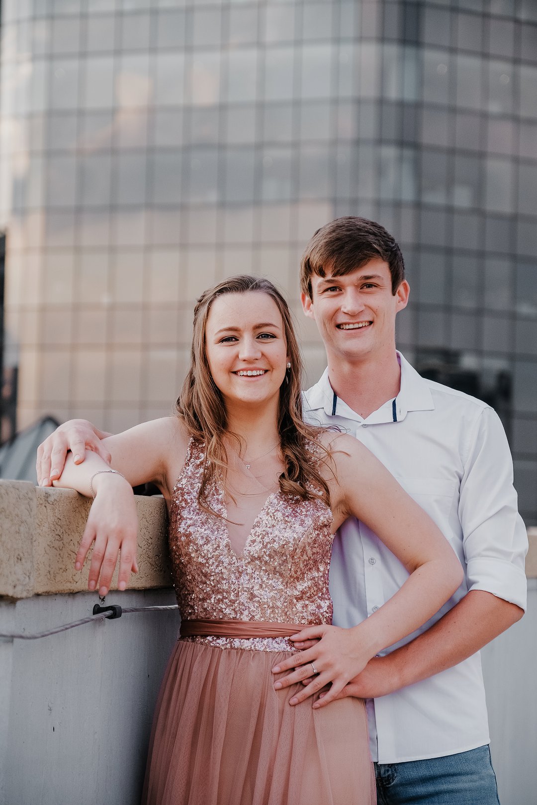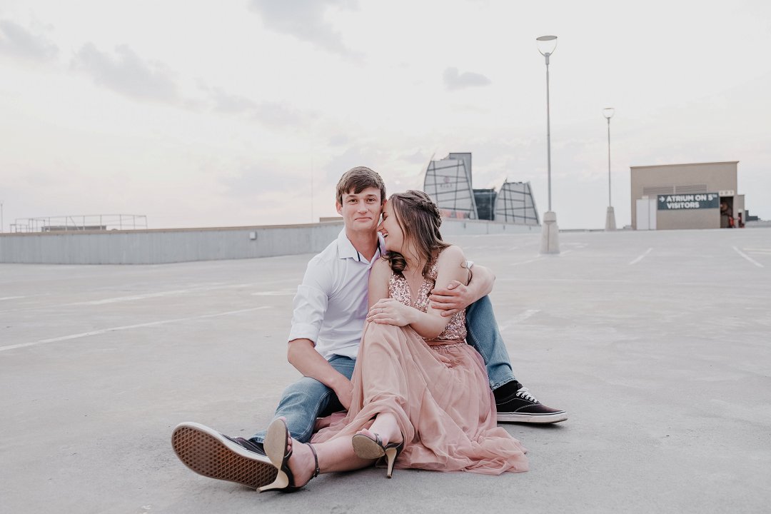Die tweede deel van Nicole en Ryan se fotosessie was tydens sonsak op ʼn lee parkeerterrein wat jou amper die gevoel gee dat jy bo op die dak van ʼn gebou is. Omring deur die geboue in Nelson Mandela Square in Sandton en die sagte pienk lig van die son wat sak in kontras met die grys en glas geboue in die agtergrond is prentjie mooi.