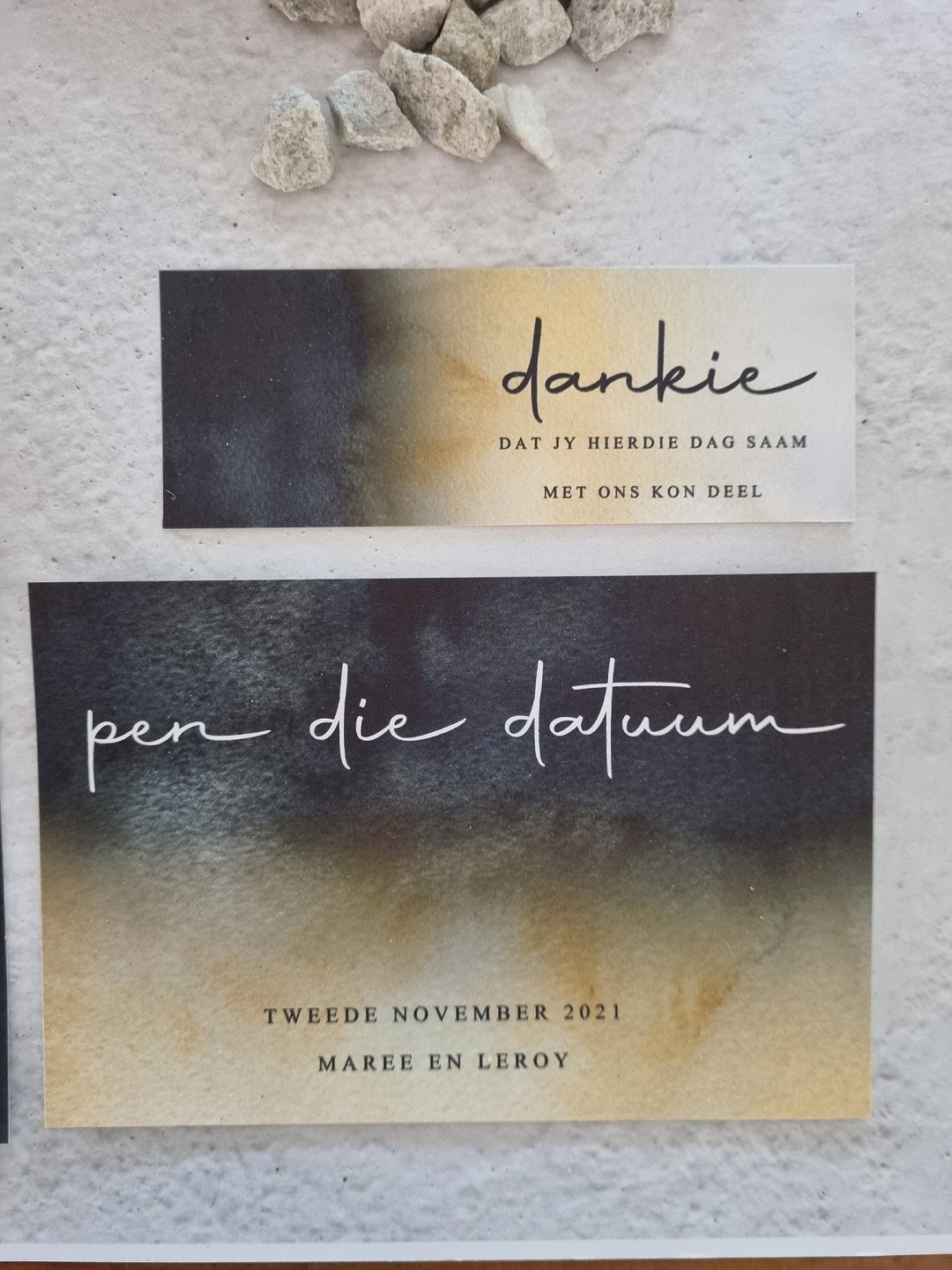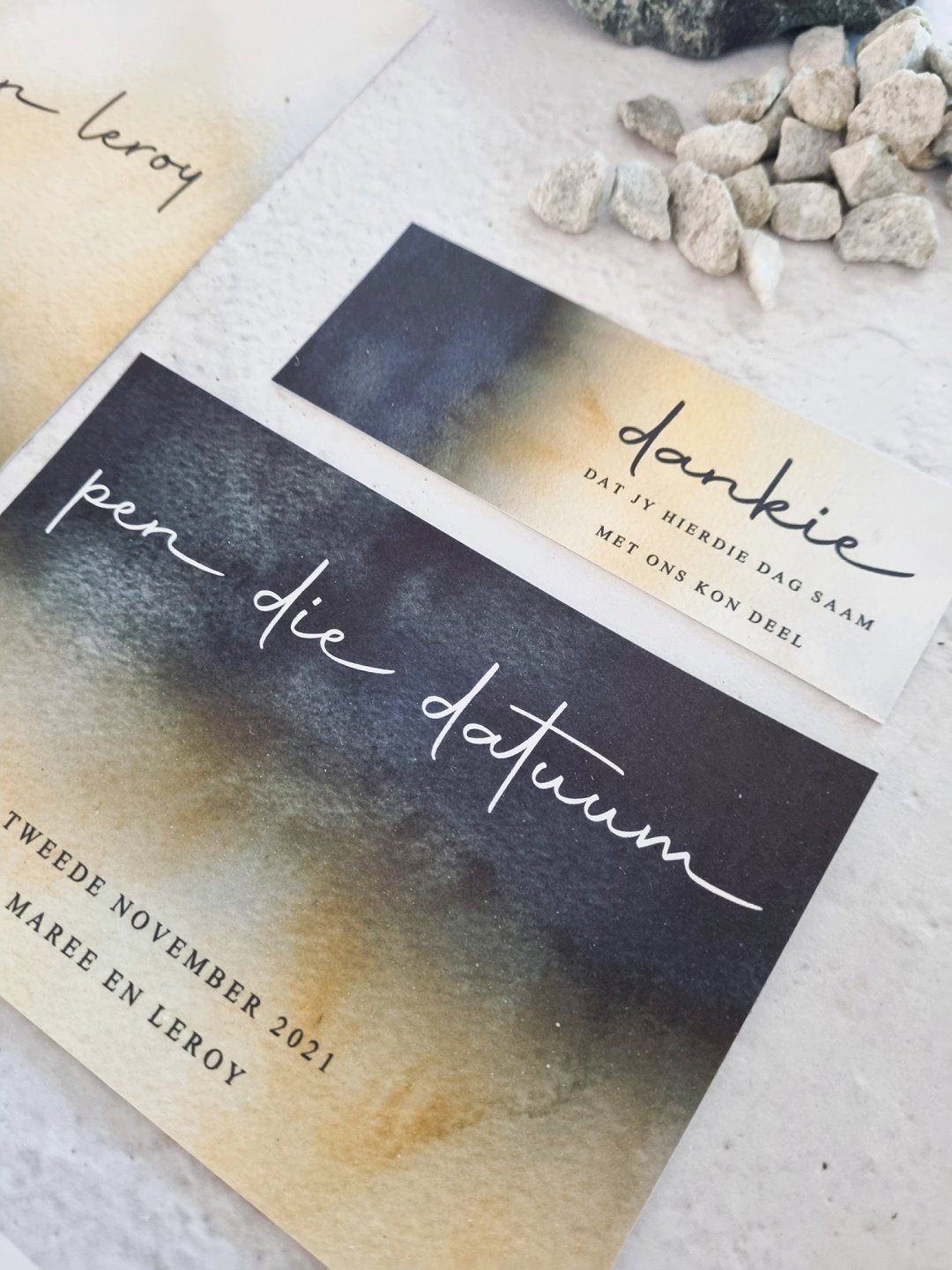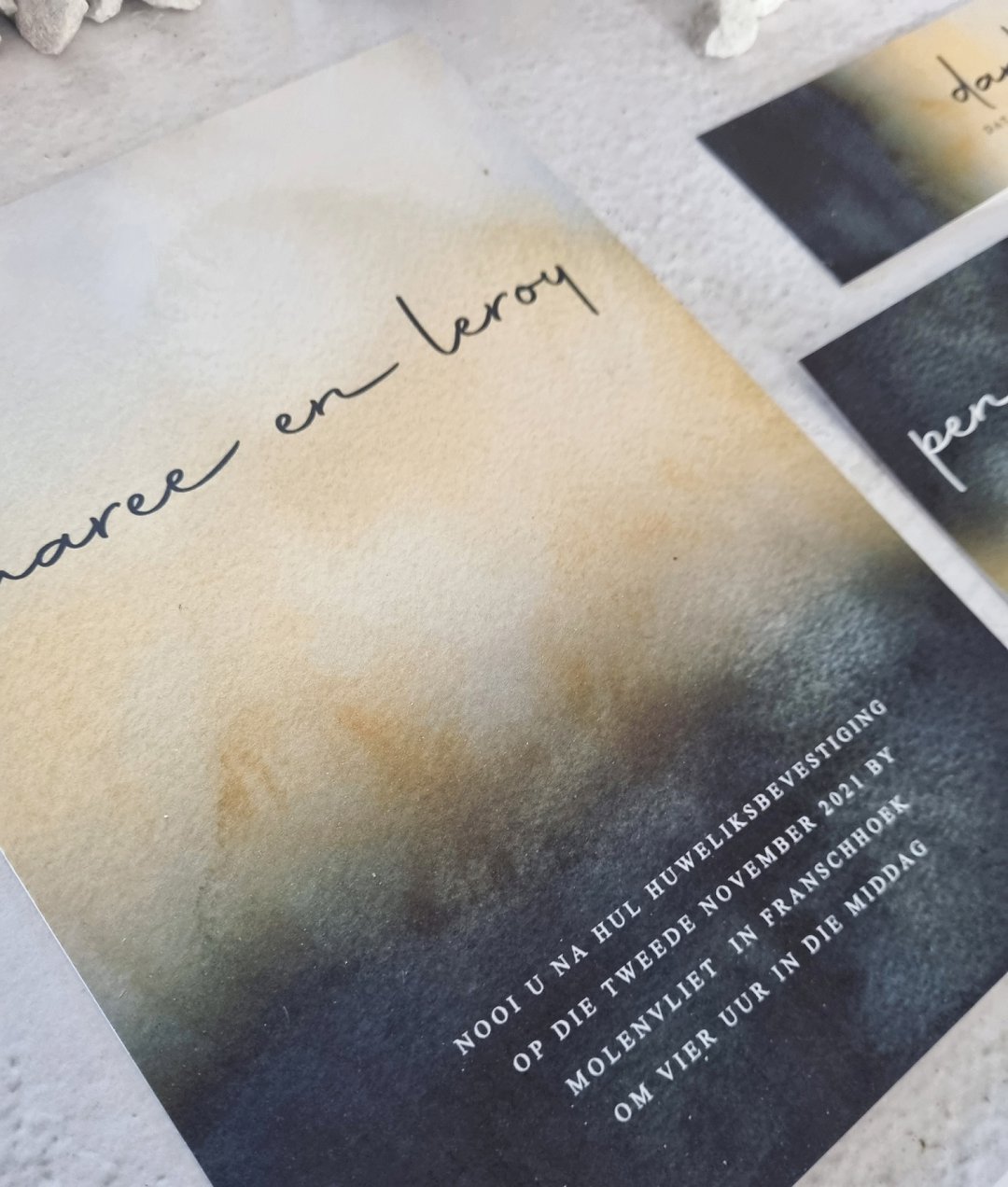 Ons deel met julle die vlootblou en ligte geel waterkleur trou skryfbehoeftes ontwerp deur Invitation Café. Die inspirasie agter die skryfbehoefte ontwerp is ʼn aandtroue op die strand of ʼn wintertroue. Die donker winter wolke wat oor die see hang en die rowwe golwe wat teen die rotse breek. Dit skep ʼn dramatiese prentjie en dit is hoe die idee van hierdie mooi skryfbehoefte stel ontstaan het. Alhoewel dit op ʼn see tema in die winter gebaseer is, kan jy dit by enige ander trou tema inpas wat die kleurskema in het.