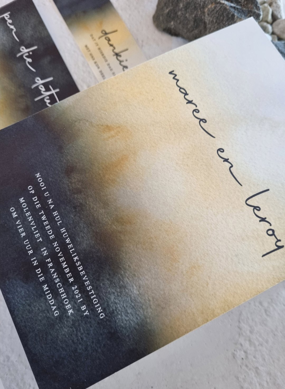 Ons deel met julle die vlootblou en ligte geel waterkleur trou skryfbehoeftes ontwerp deur Invitation Café. Die inspirasie agter die skryfbehoefte ontwerp is ʼn aandtroue op die strand of ʼn wintertroue. Die donker winter wolke wat oor die see hang en die rowwe golwe wat teen die rotse breek. Dit skep ʼn dramatiese prentjie en dit is hoe die idee van hierdie mooi skryfbehoefte stel ontstaan het. Alhoewel dit op ʼn see tema in die winter gebaseer is, kan jy dit by enige ander trou tema inpas wat die kleurskema in het.