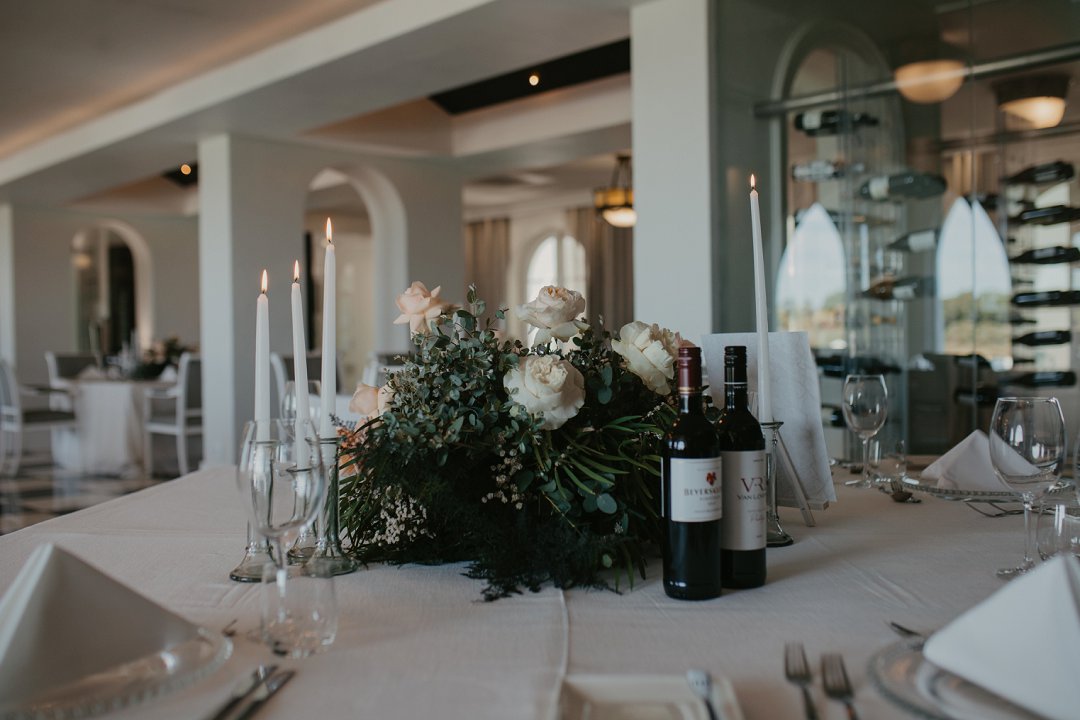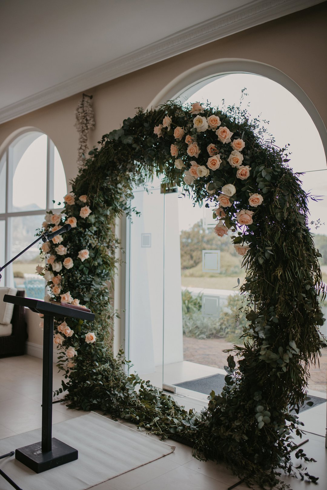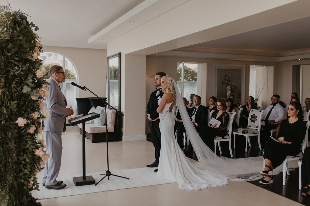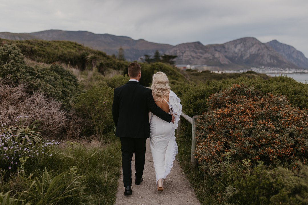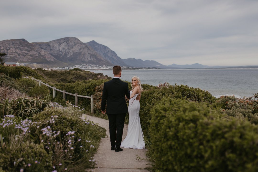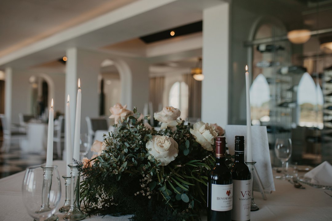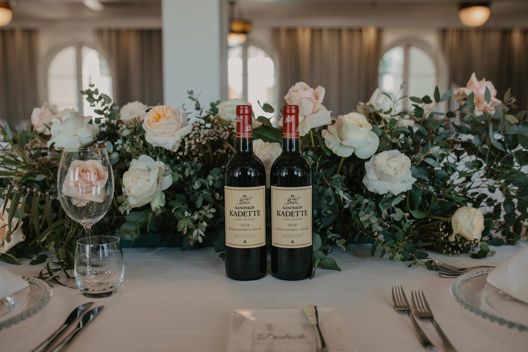Ons wou graag ʼn wegloop pakket troue gehad het (Elopment Package). So ons was baie bevoorreg dat The Marine Hotel in Hermanus ons kon akkommodeer met ons versoek. Ons sal hulle sterk aanbeveel. Hulle het ons dag baie spesiaal gemaak en uit hulle pad gegaan om ons gelukkig te maak. Die inspirasie agter die trou dekor was om tydloos, romanties en klasiek te wees. Nicolé se liefde vir blomme het ʼn groot rol gespeel en die hoof fokus was die peonie rose.