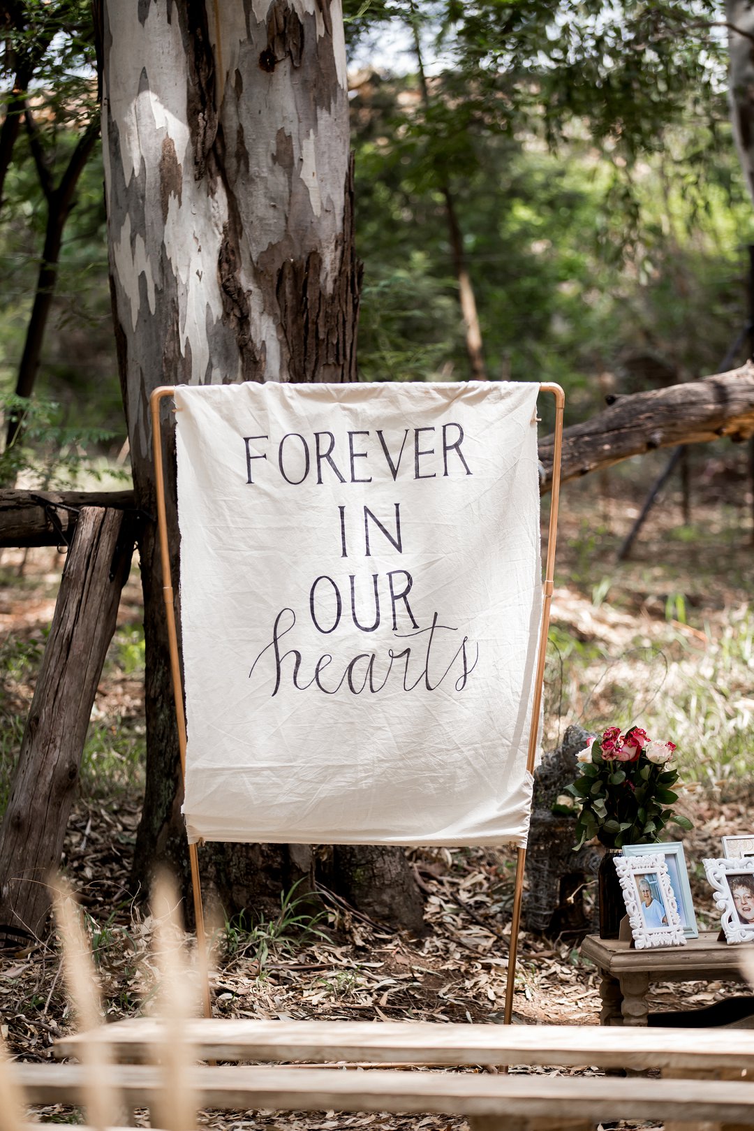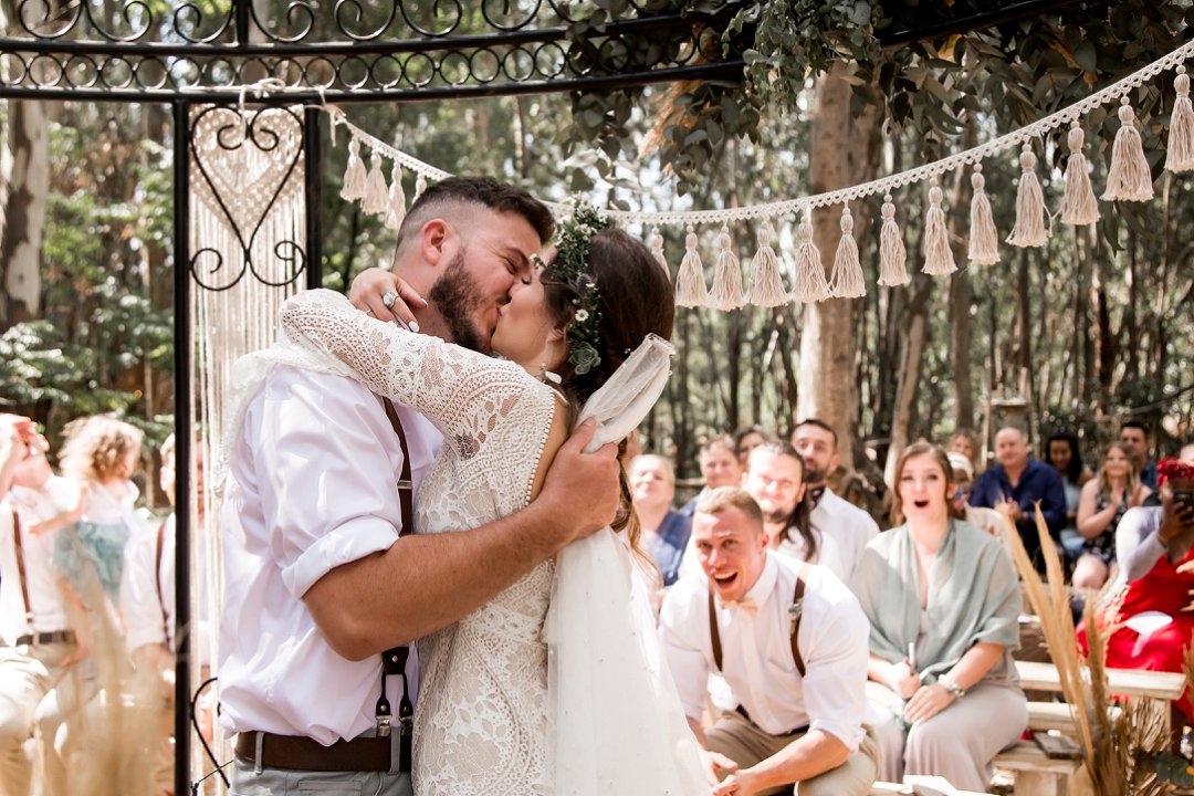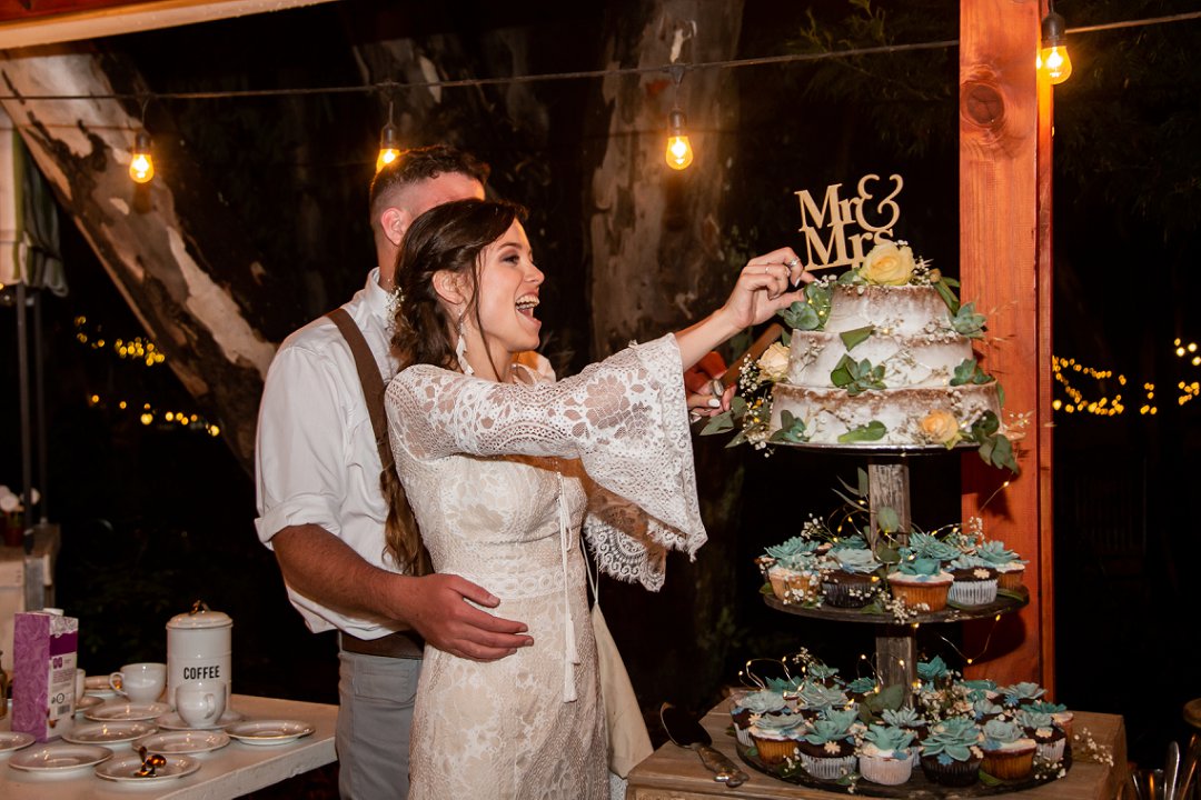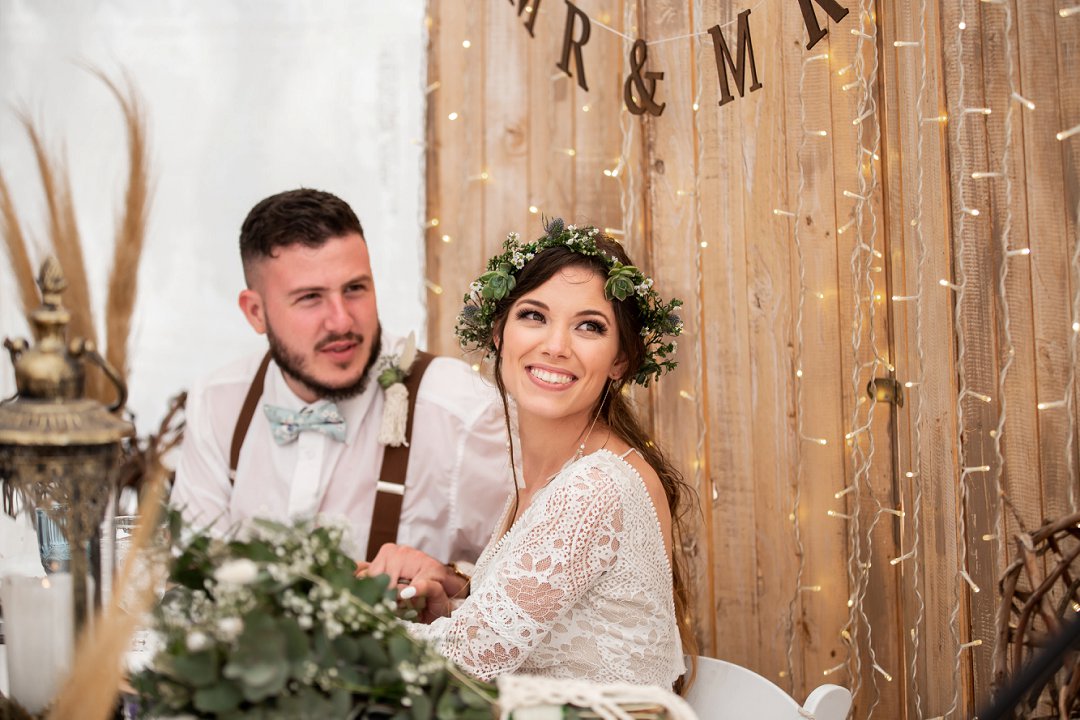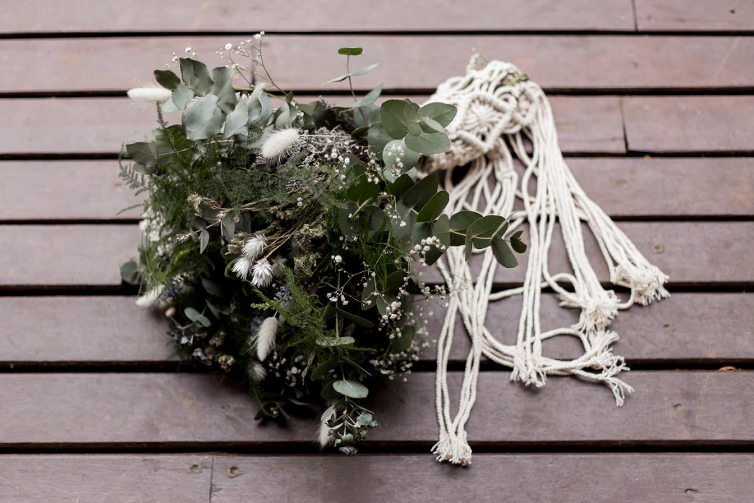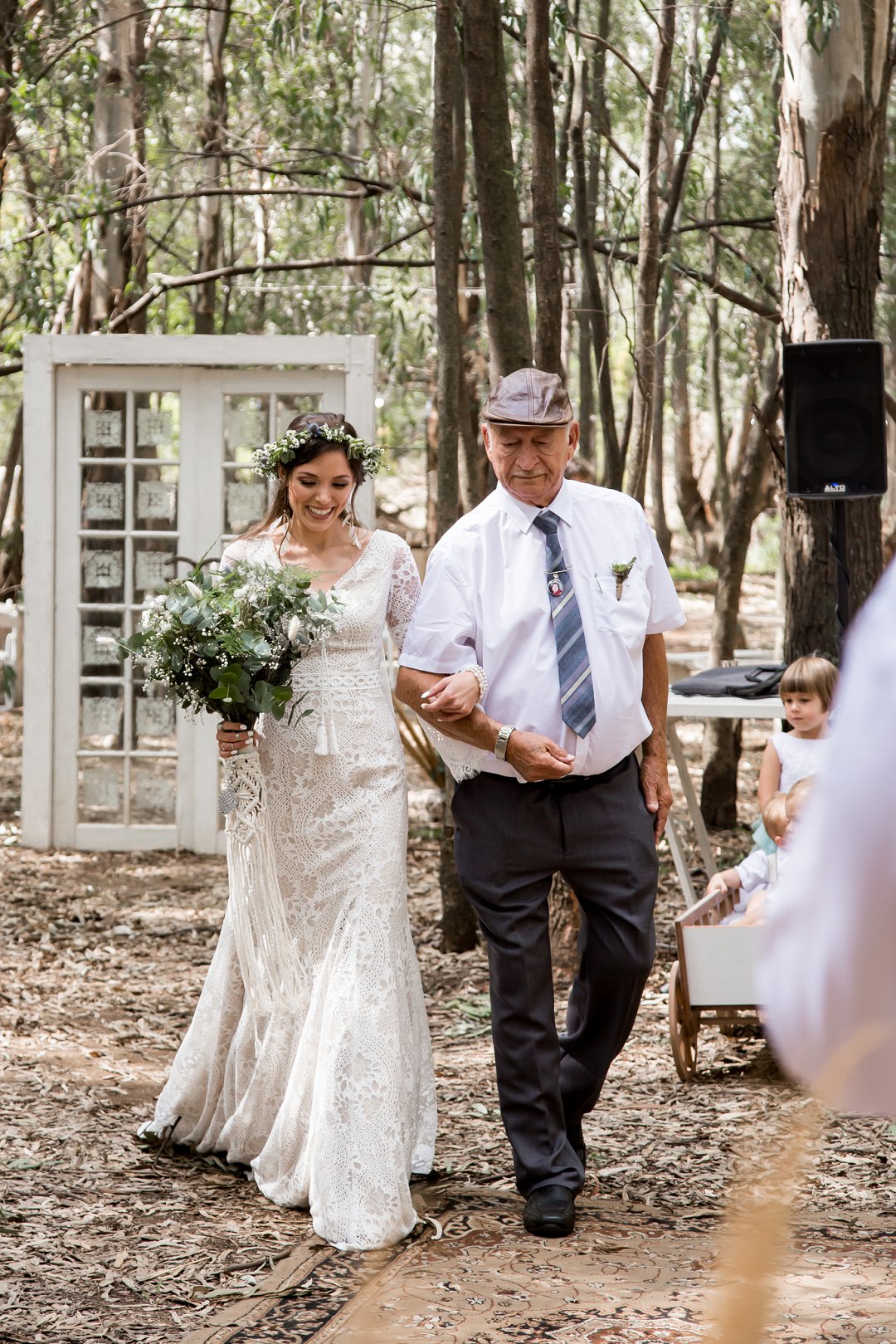 Belinda, met die insette van Shane het self hul hele troue beplan. Hulle dekor het bestaan uit beide uitgedroogde en vars blomme. Skakerings van Goud en Groen elemente vloei reg deur die paartjie se trou dekor. Gebruik van Macramé en die mooiste matte saam met die rou hout tafels het weer ʼn baie Boheemse trou tema geskep. Die perfekte kombinasie vir ʼn mooi woud troue soos die.