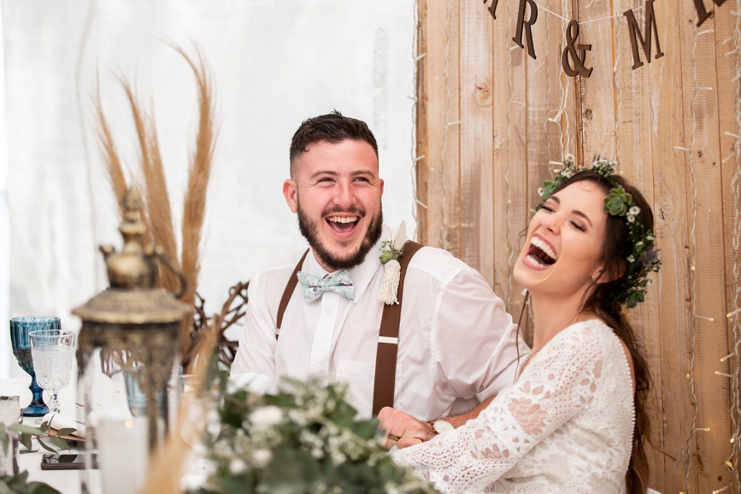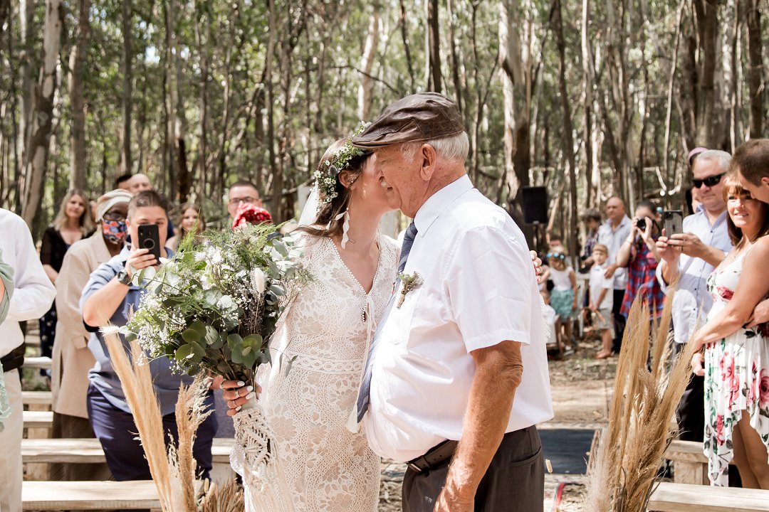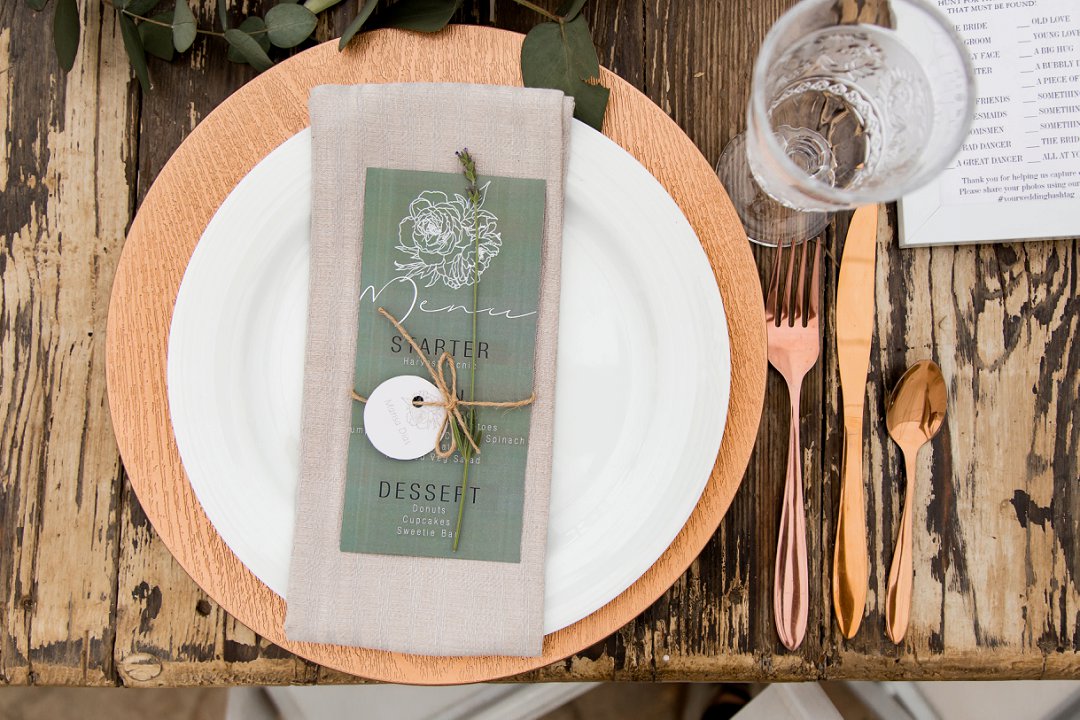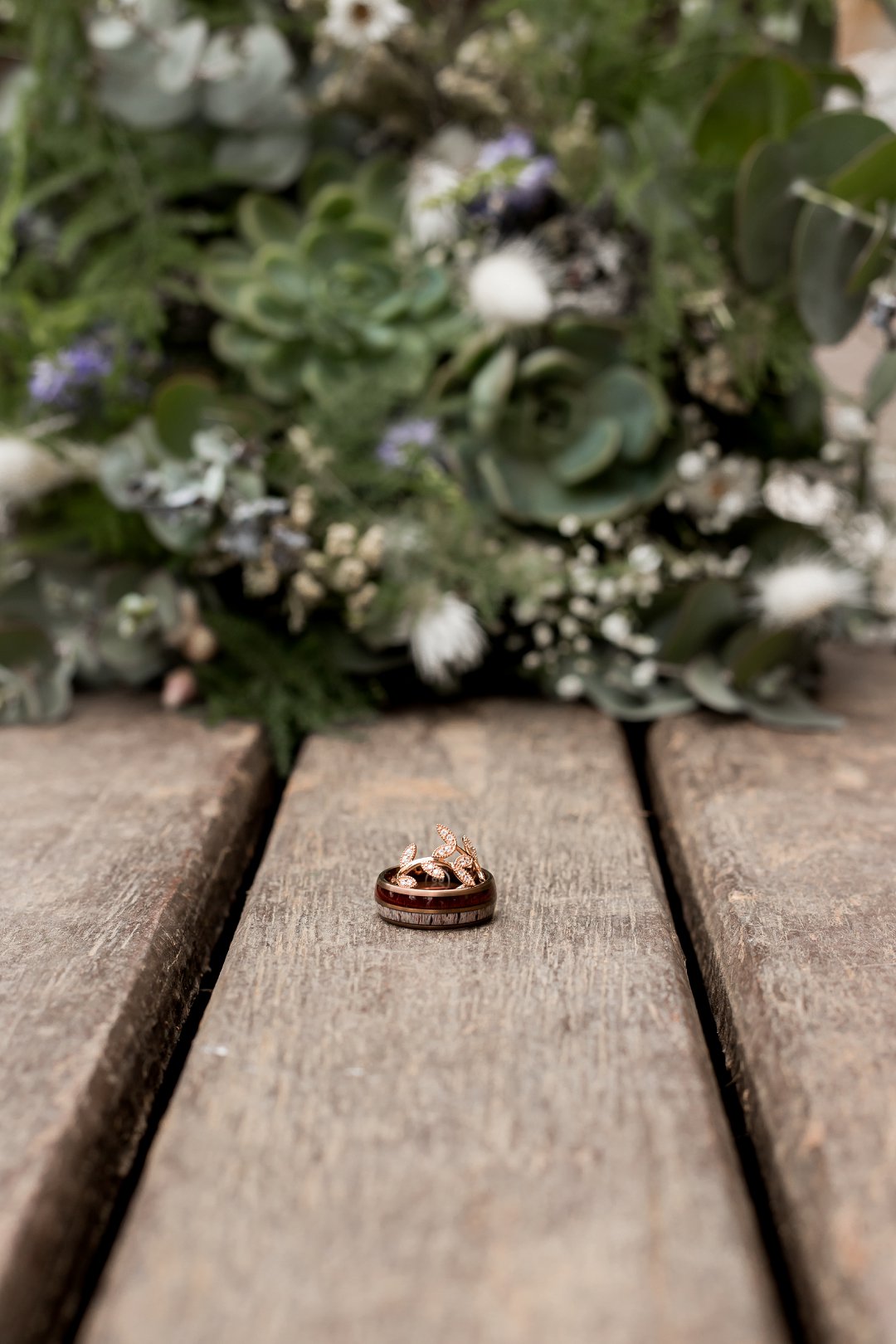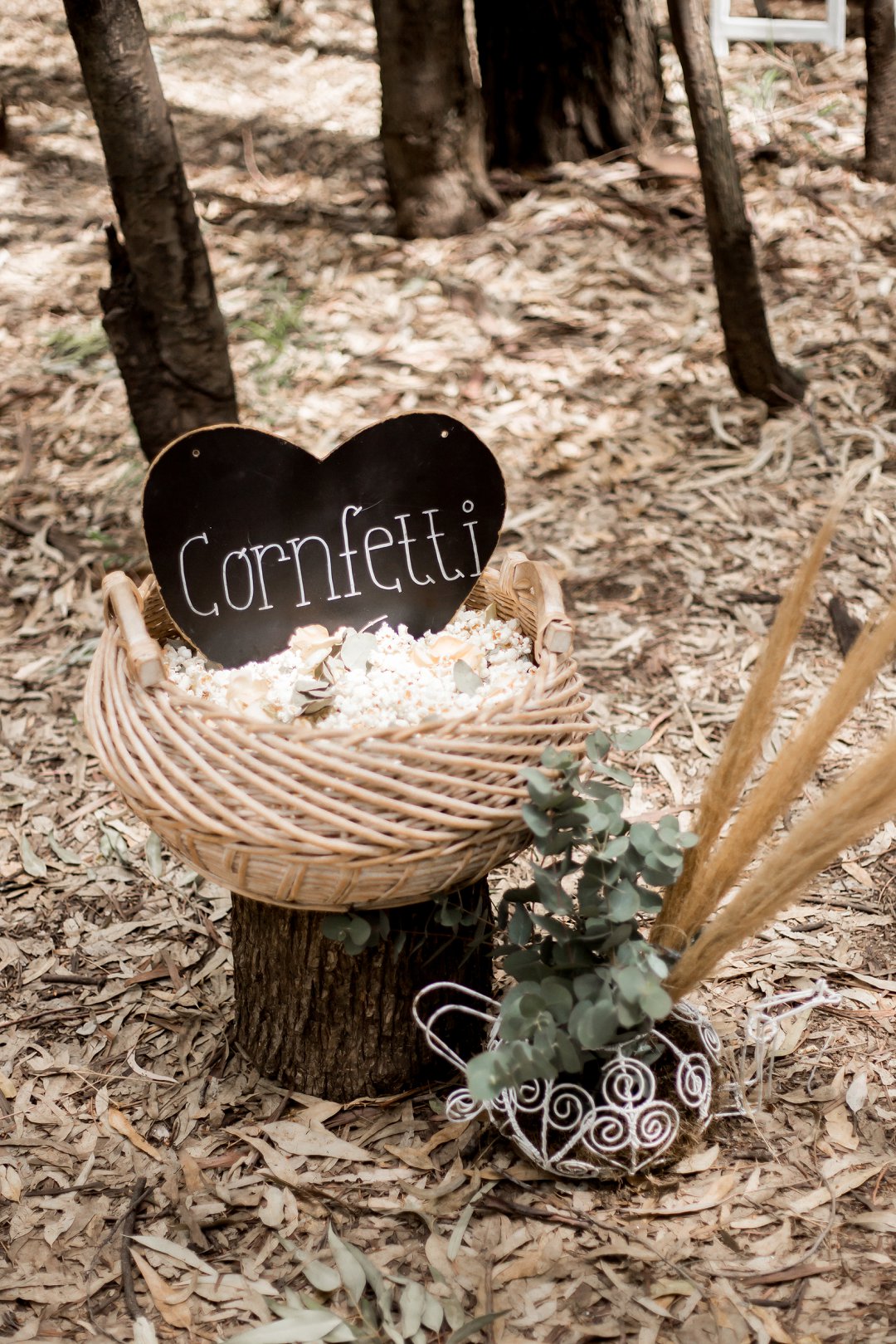 Belinda, met die insette van Shane het self hul hele troue beplan. Hulle dekor het bestaan uit beide uitgedroogde en vars blomme. Skakerings van Goud en Groen elemente vloei reg deur die paartjie se trou dekor. Gebruik van Macramé en die mooiste matte saam met die rou hout tafels het weer ʼn baie Boheemse trou tema geskep. Die perfekte kombinasie vir ʼn mooi woud troue soos die.