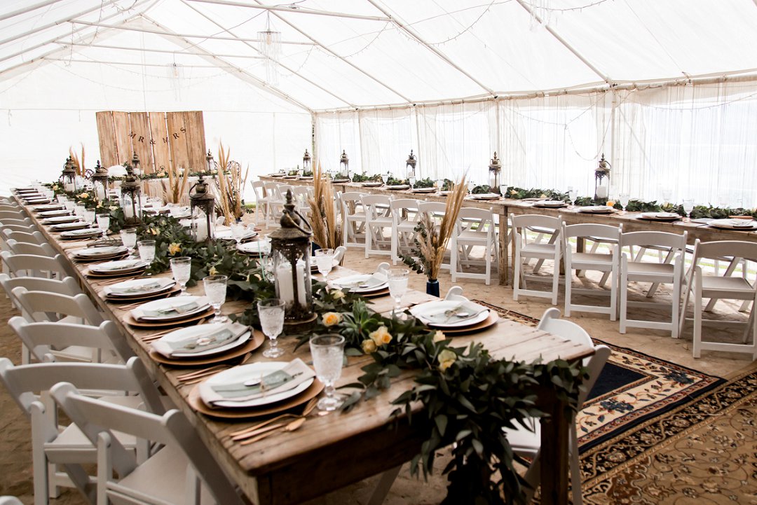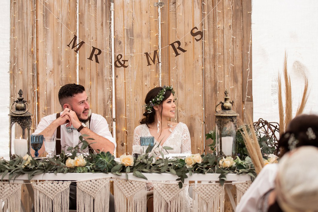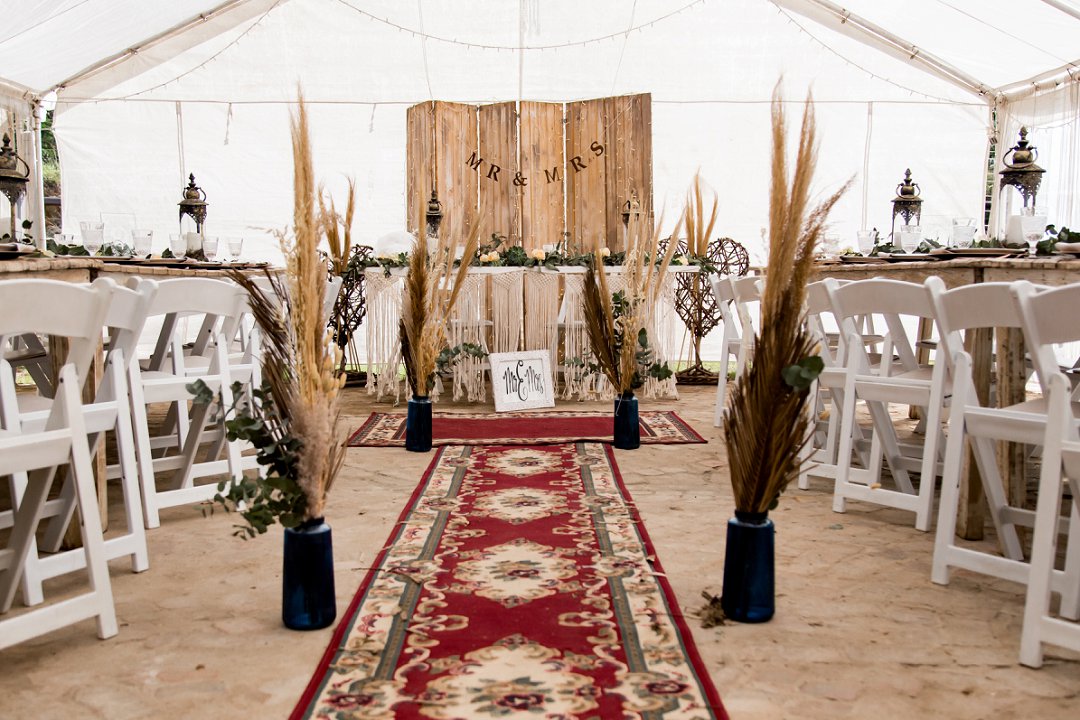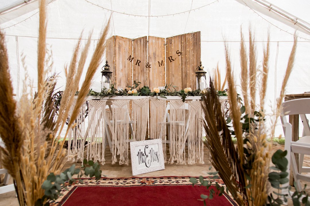 Vir die trou dekor, wou ons alles baie boho gehad het. Ons het die pampas gras gehad, en die macramé. Die trou venue het die tafel dekor vir ons gedoen, presies soos ons dit wou gehad het.